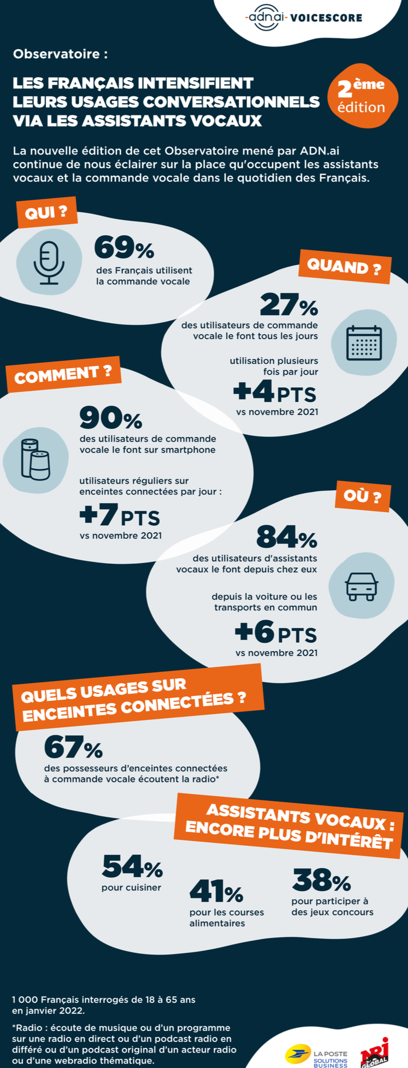 Près de 7 Français sur 10 utilisent la commande vocale (envoi de SMS/mail, recherche d’information, écoute de musique...) et 27% d’entre eux y ont recours tous les jours. Parmi les utilisateurs réguliers, son usage s’intensifie et se consolide. On constate en effet une hausse significative (+4 points) des Français utilisant de la commande vocale plusieurs fois par jour (vs novembre 2021).