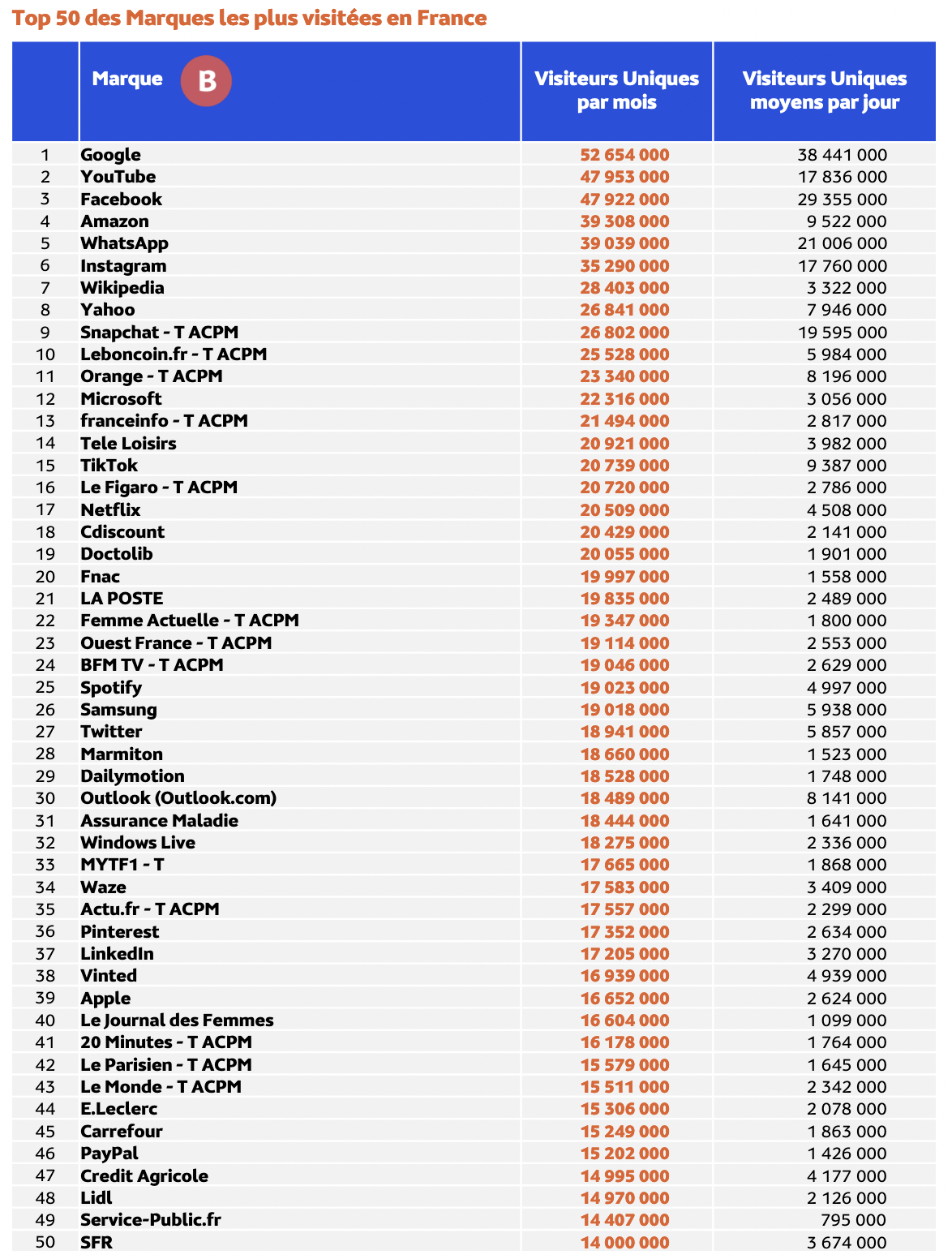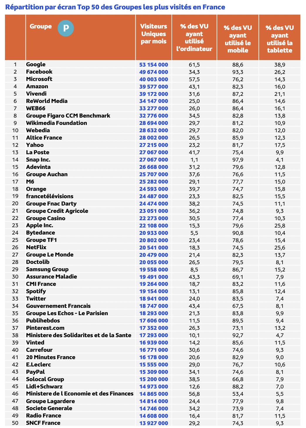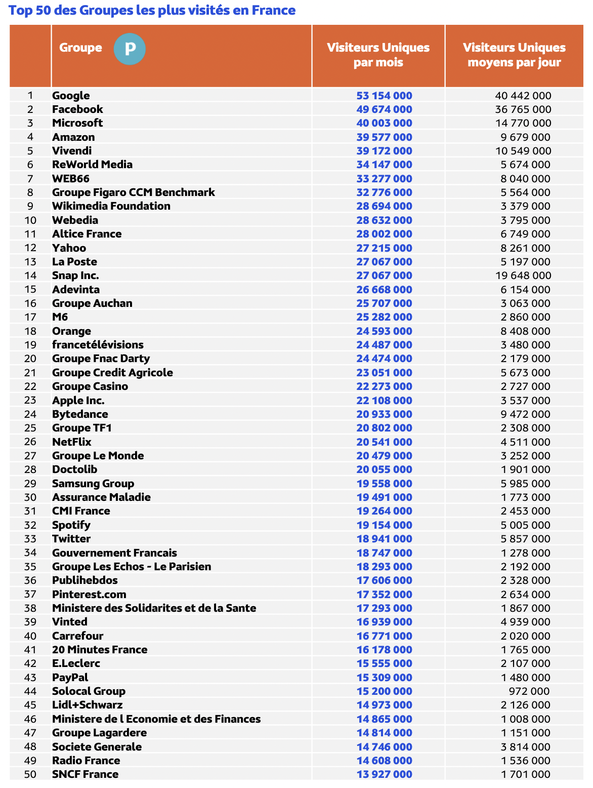 Médiamétrie et Médiamétrie//NetRatings - Audience Internet Global - Tous lieux de connexion - France - Décembre 2022 - Base : 2 ans et plus Copyright Médiamétrie - Tous droits réservés
