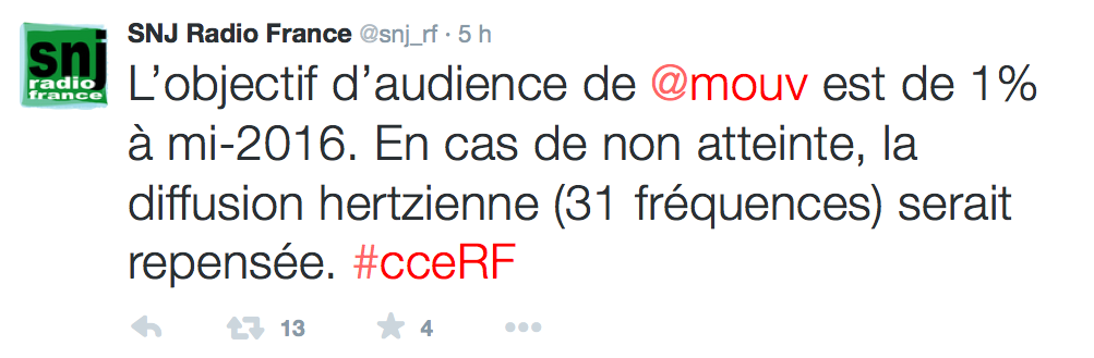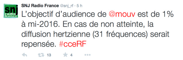 Toujours selon ce live-tweet du SNJ Radio France, on aura également appris que "l’objectif d’audience de Mouv' est de 1% à mi-2016. En cas de non atteinte, la diffusion hertzienne (31 fréquences) serait repensée".