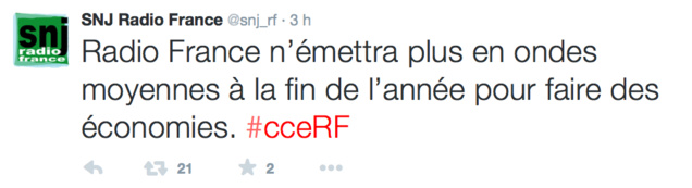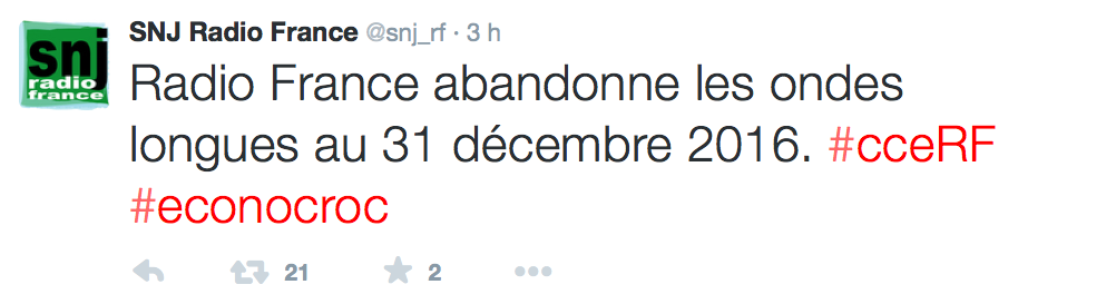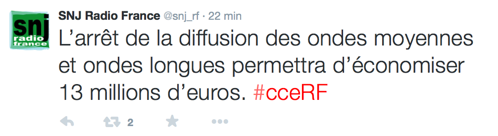 Enfin, "Radio France n’émettra plus en ondes moyennes à la fin de l’année pour faire des économies" et "Radio France abandonne les ondes longues au 31 décembre 2016". "L’arrêt de la diffusion des ondes moyennes et ondes longues permettra d’économiser 13 millions d’euros".