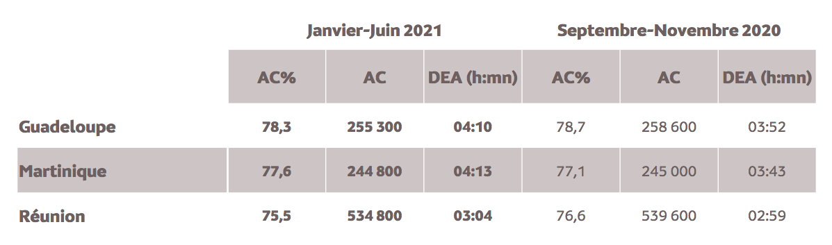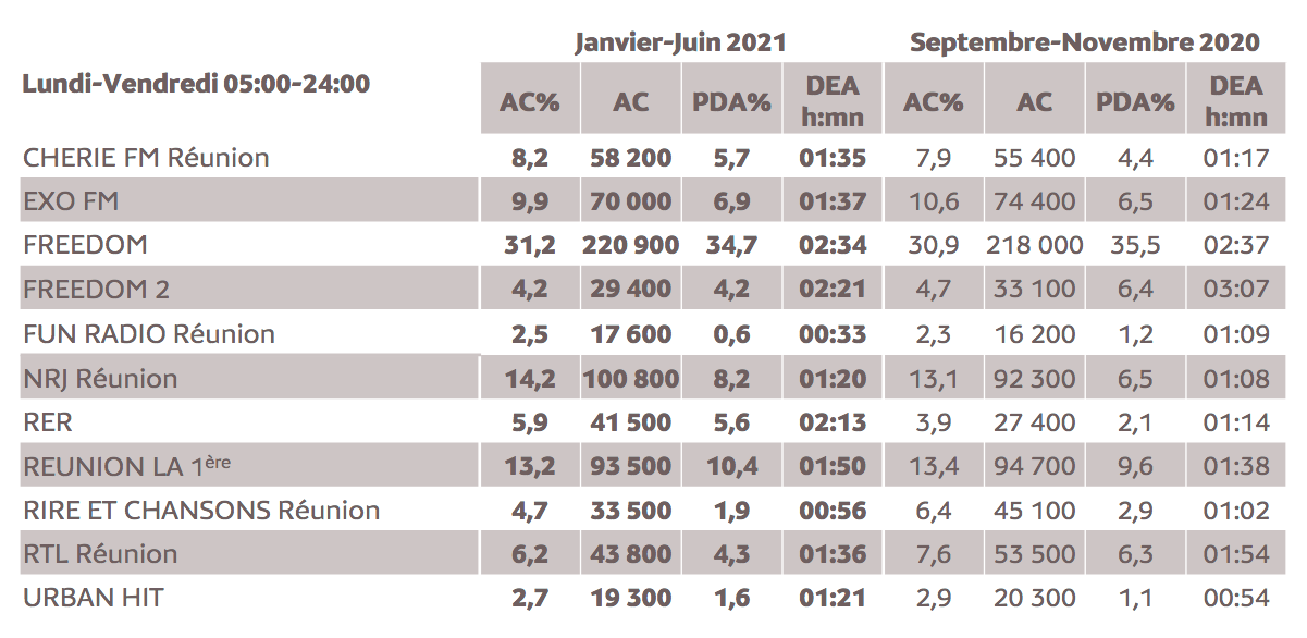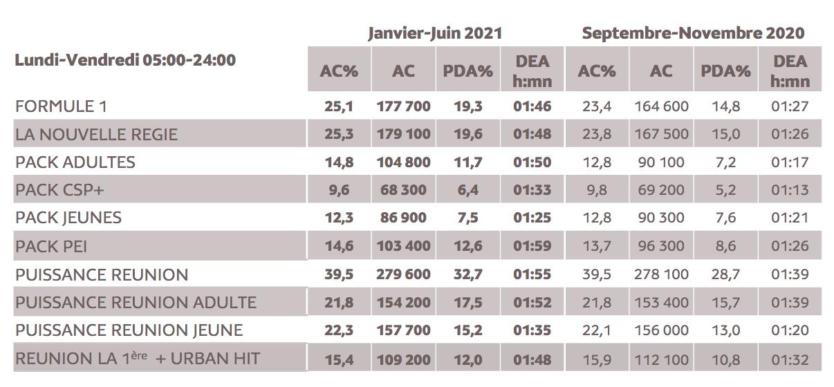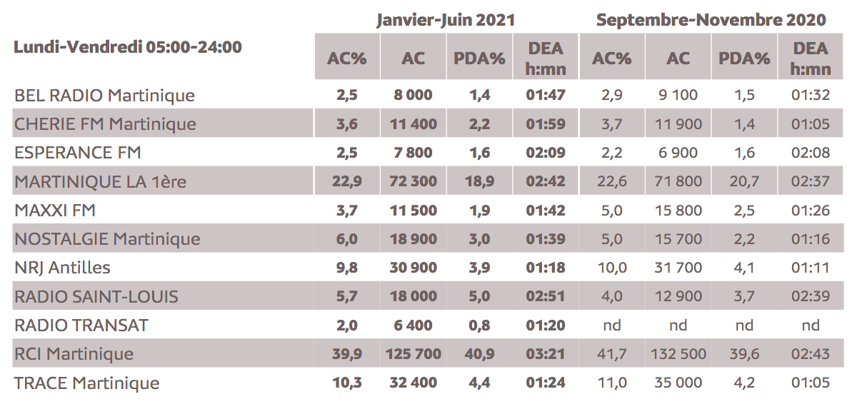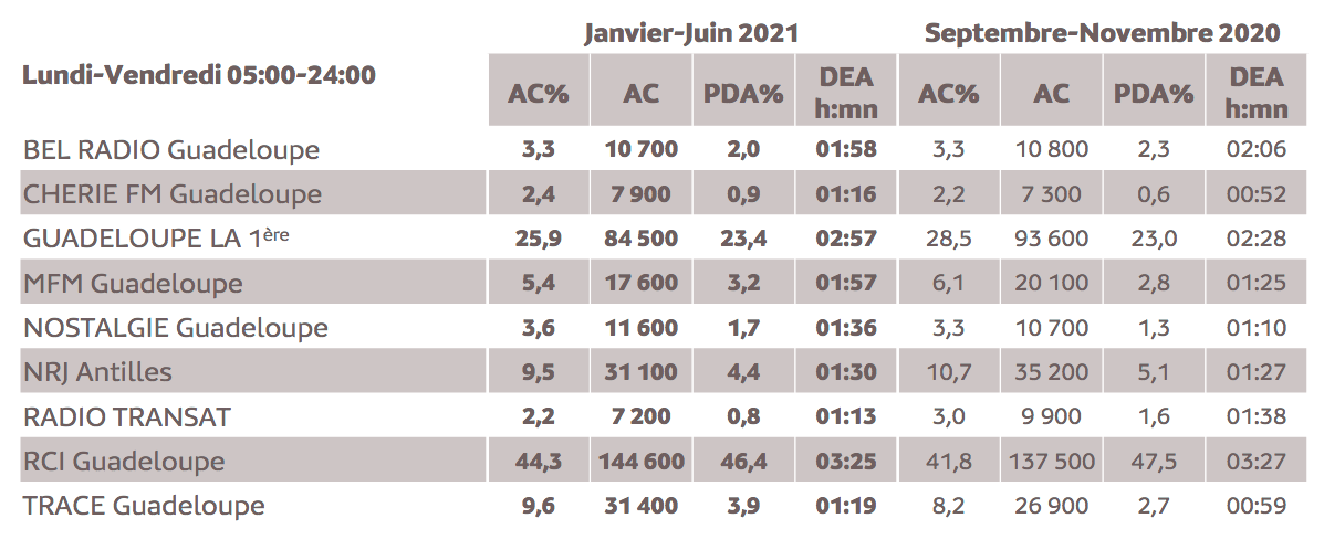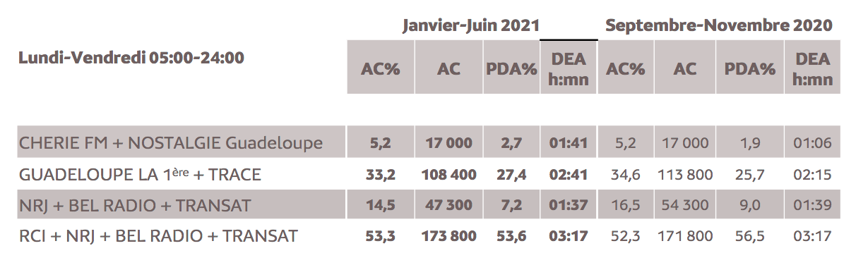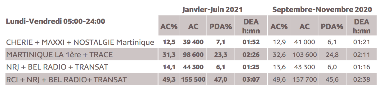 Cette nouvelle étude Métrdom a été réalisée de janvier à juin 2021. Précisément, du 11 janvier au 13 juin 2021 pour les Antilles ainsi que du 25 janvier au 13 juin 2021 pour la Réunion. En Guadeloupe, 1% d’audience cumulée en 2021 représente 3 261 personnes âgées de 13 ans et plus. En Martinique, 1% d’audience cumulée en 2021 représente 3 154 personnes âgées de 13 ans et plus. Et, à La Réunion, 1% d’audience cumulée en 2021 représente 7 083 personnes âgées de 13 ans et plus.