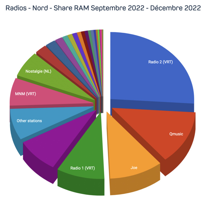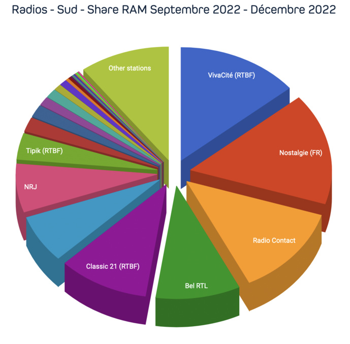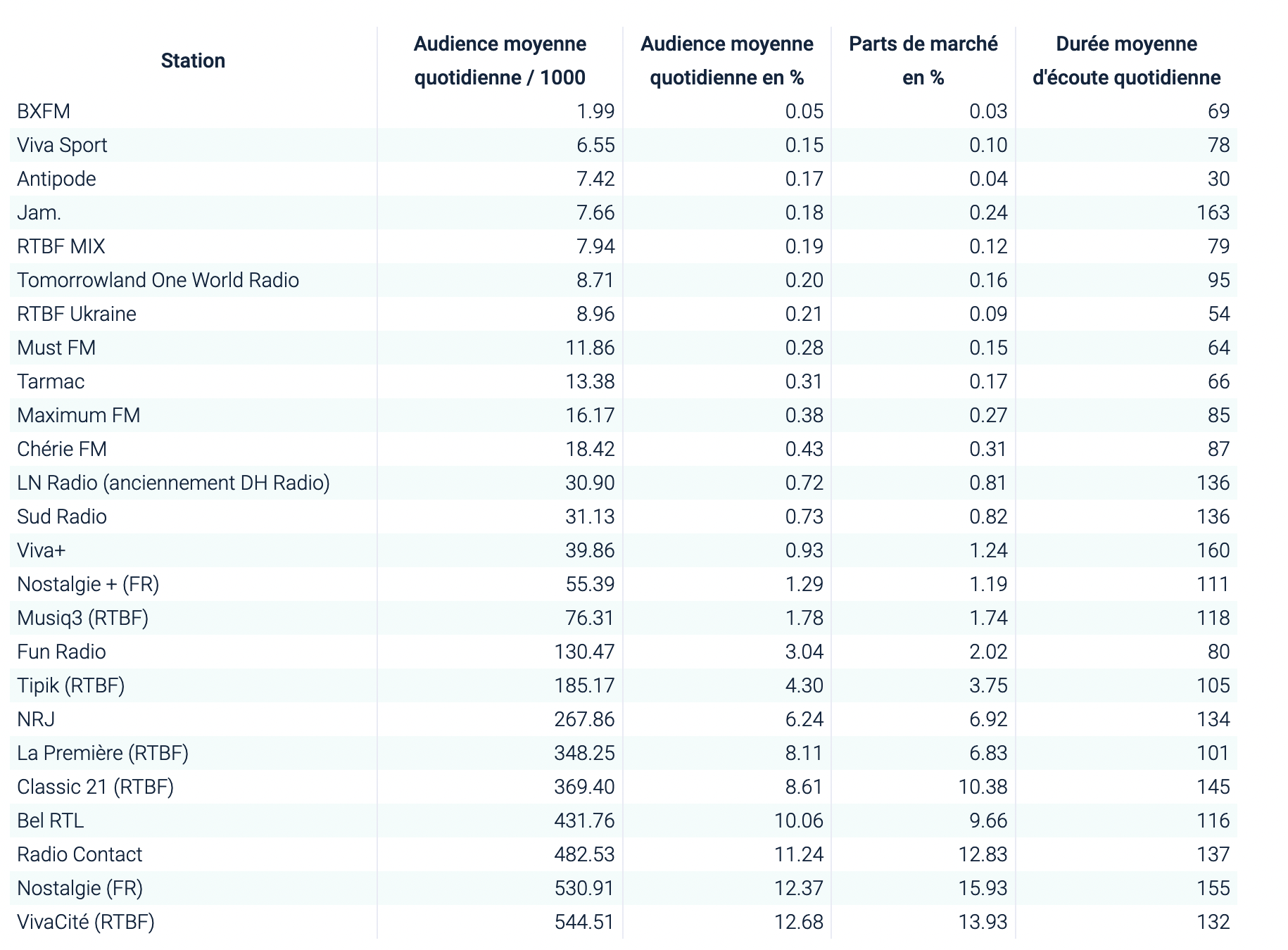 En Belgique, Nostalgie (15.93%), VivaCité (13.93%), Radio Contact (12.83%), Classic 21 (10.38%) et Bel RTL(9.66%) constituent le Top 5 en part de marché. En nombre d'auditeurs, VivaCité (544 510), Nostalgie (530 910), Radio Contact (482 530), Bel RTL (431 760) et Classic 21 (369 400) sont les plus écoutées dans le sud du pays.