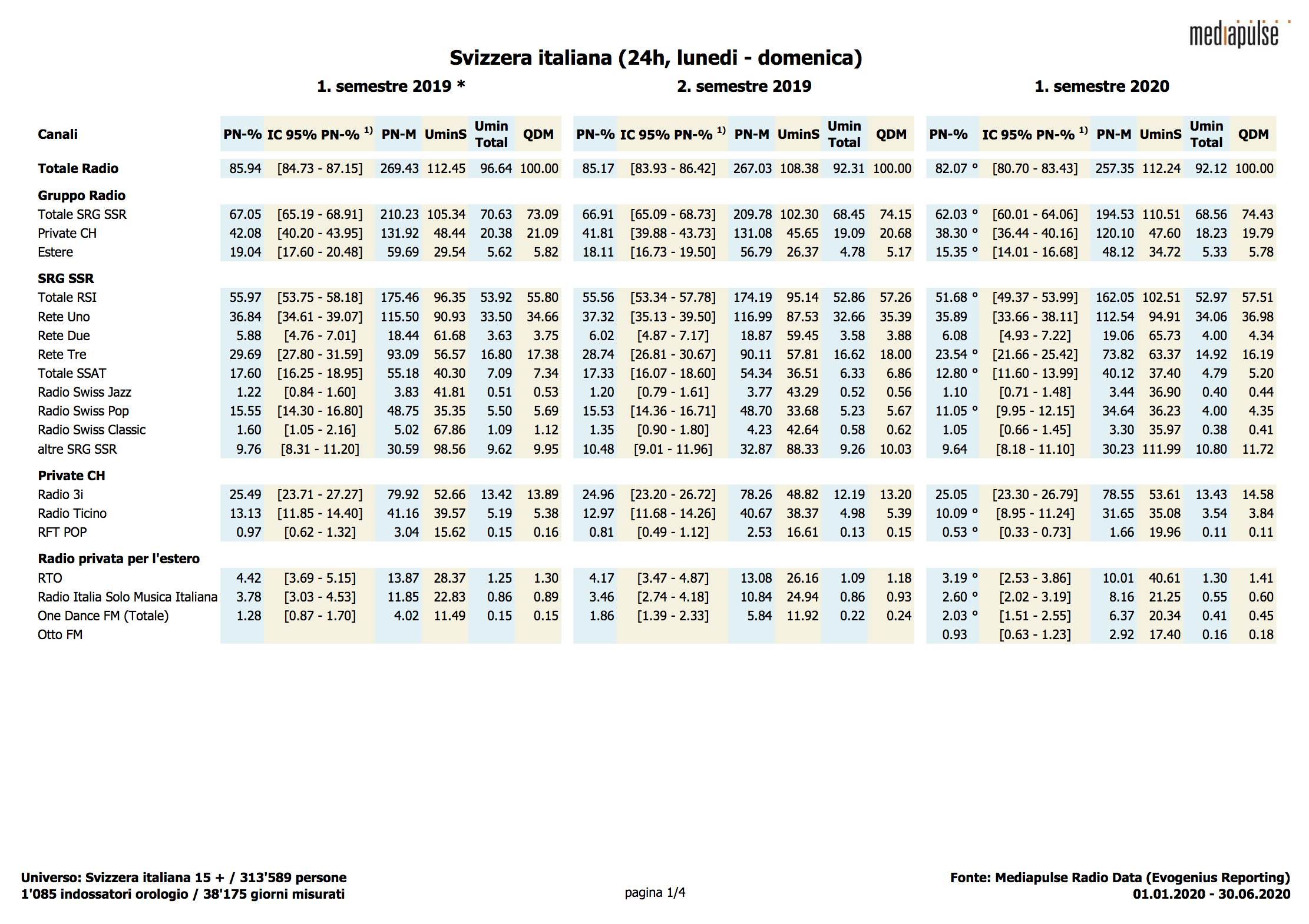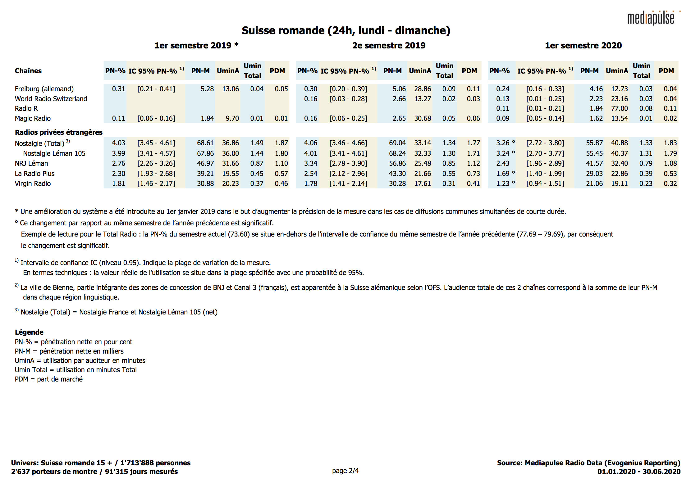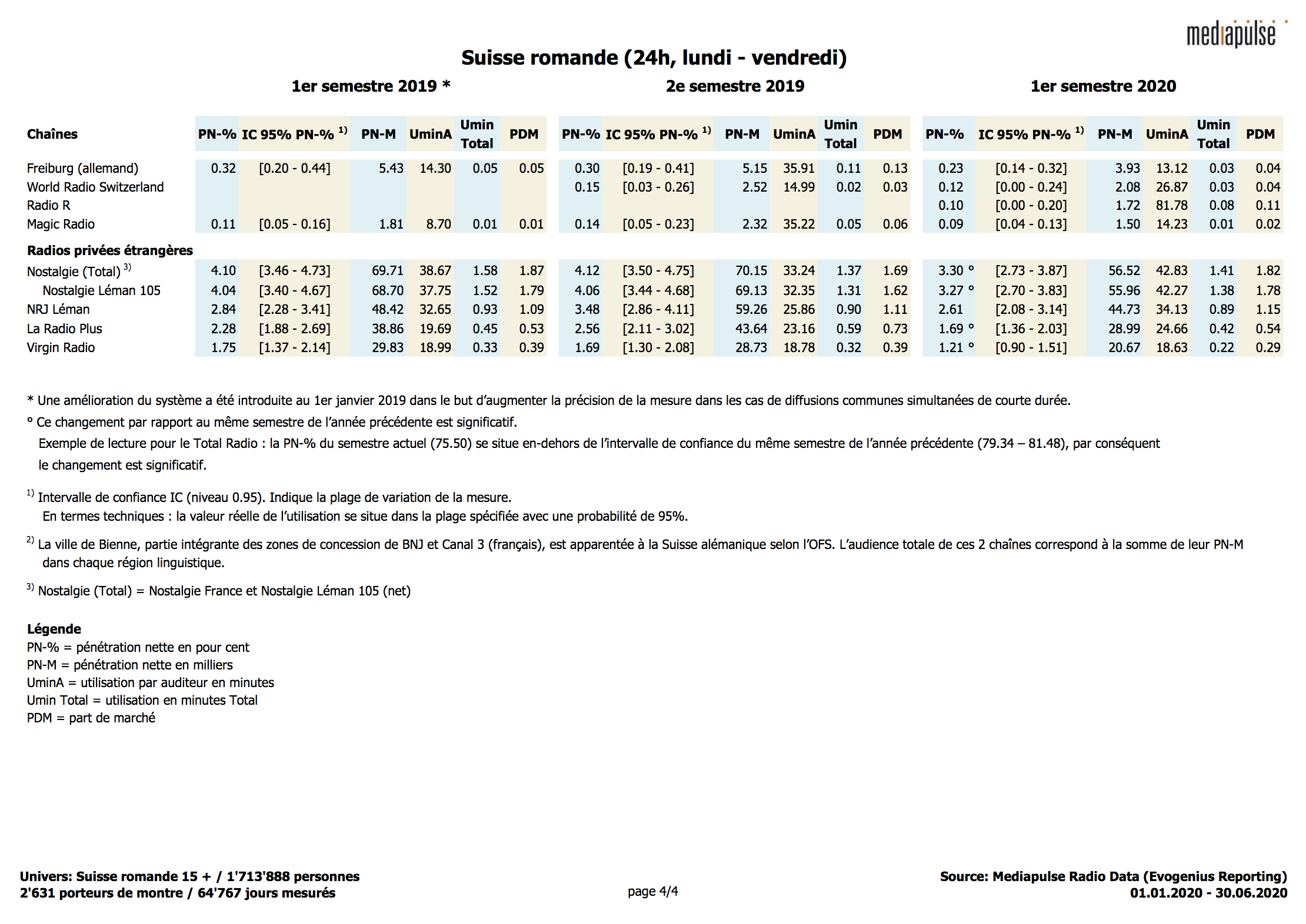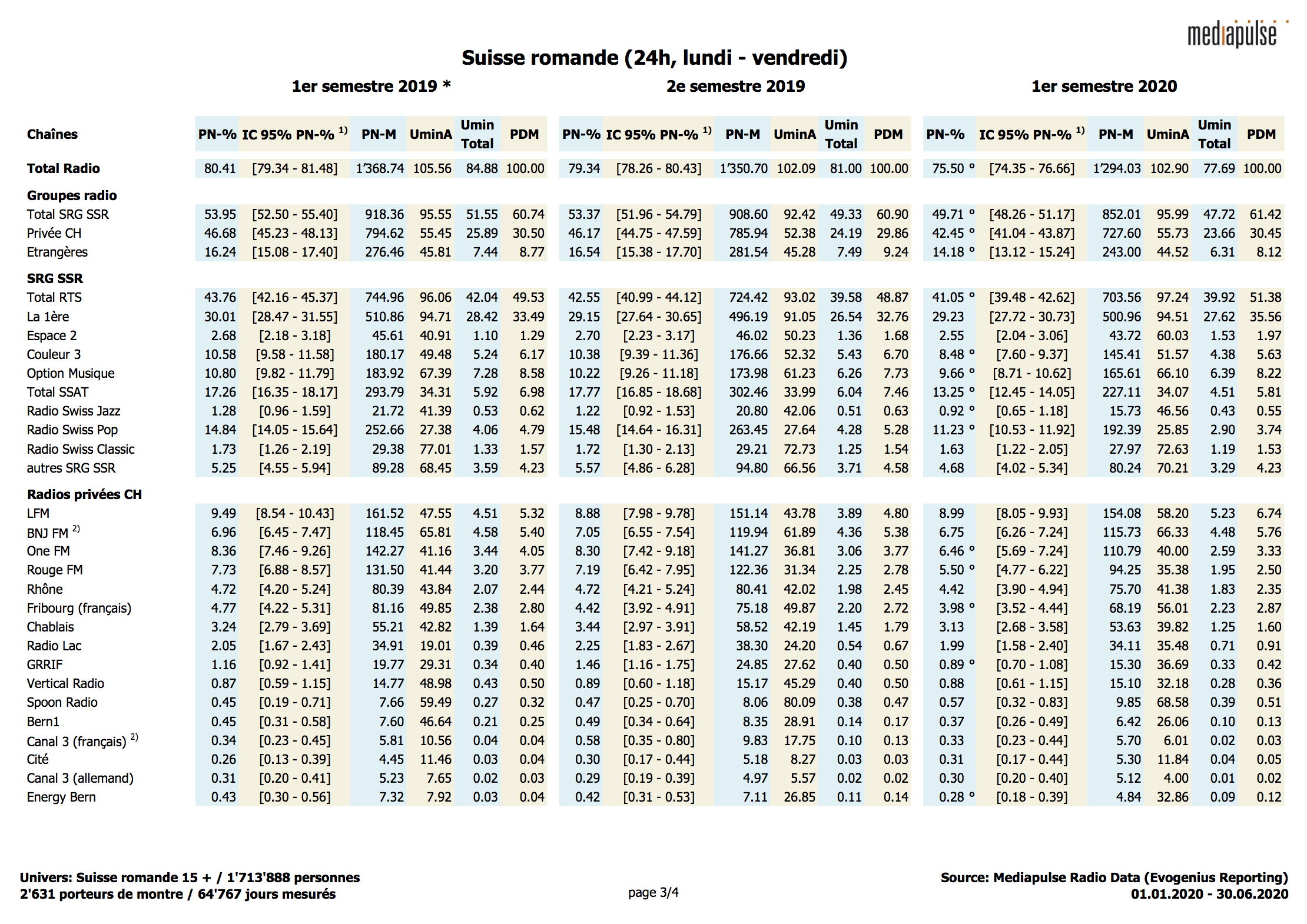 Par rapport au premier semestre 2019, la radio accuse un recul de son taux de pénétration journalière, qui est passé de 81% à 78%. Ce recul est nettement plus important en Suisse romande (- 5%) et en Suisse italienne (- 4%) qu’en Suisse alémanique (- 3%). En Suisse latine, on observe en outre une diminution de la durée d’utilisation par auditeur, atteignant deux minutes en Suisse romande alors qu'elle reste inchangée en Suisse italienne. En Suisse alémanique, cette valeur a au contraire augmenté de 4 minutes.
