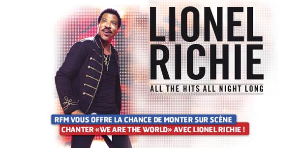 Voilà une dotation originale proposée par l'équipe de RFM : les auditeurs qui veulent monter sur scène avec Lionel Richie doivent rapidement s'inscrire sur rfm.fr (avant le 14 juillet prochain) pour gagner leur séjour VIP et notamment cette possibilité de monter sur scène avec Lionel Richie et d'interpréter le tube "We are the world" avec lui, sur scène.