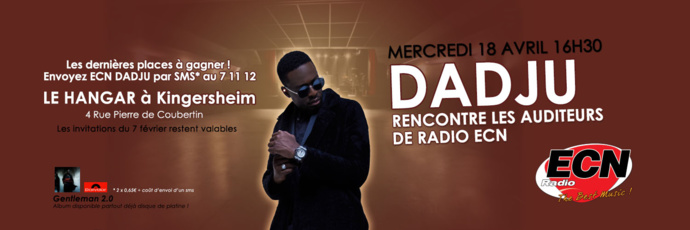 Radio ECN "The Best Music", diffusée à Mulhouse sur 98.1 et à Colmar sur 98.2, prépare la venue de Dadju. Le chanteur viendra à la rencontre des auditeurs, ce mercredi 18 avril à Kingersheim. À cette occasion, Radio ECN invite 1 000 auditeurs à assister à une interview en live, "la révélation pop urbain du moment". Il interprètera en direct quelques extraits de son album "Gentleman 2.0", disque de platine.