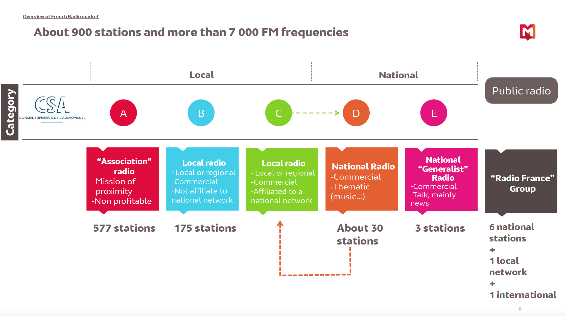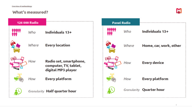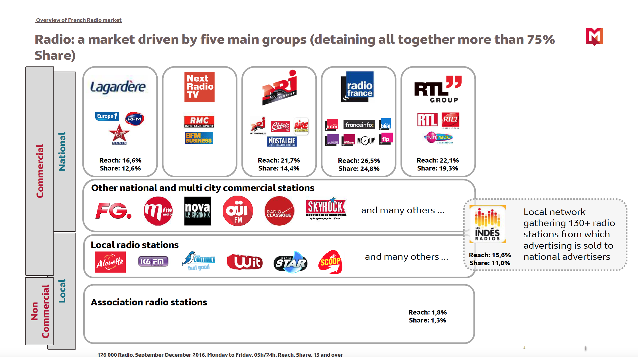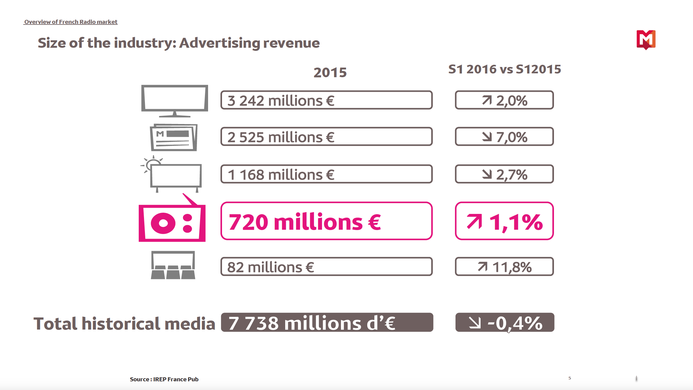 En France, on compte quelque 900 stations pour plus de 7 000 fréquences. Le marché radiophonique français représente 720 M€; en hausse de plus de 1% entre 2015 et 2016. Médiamétrie dispose de trois outils pour mesurer les audiences : la 126 000 Radio, les Médialocales et la Panel Radio.