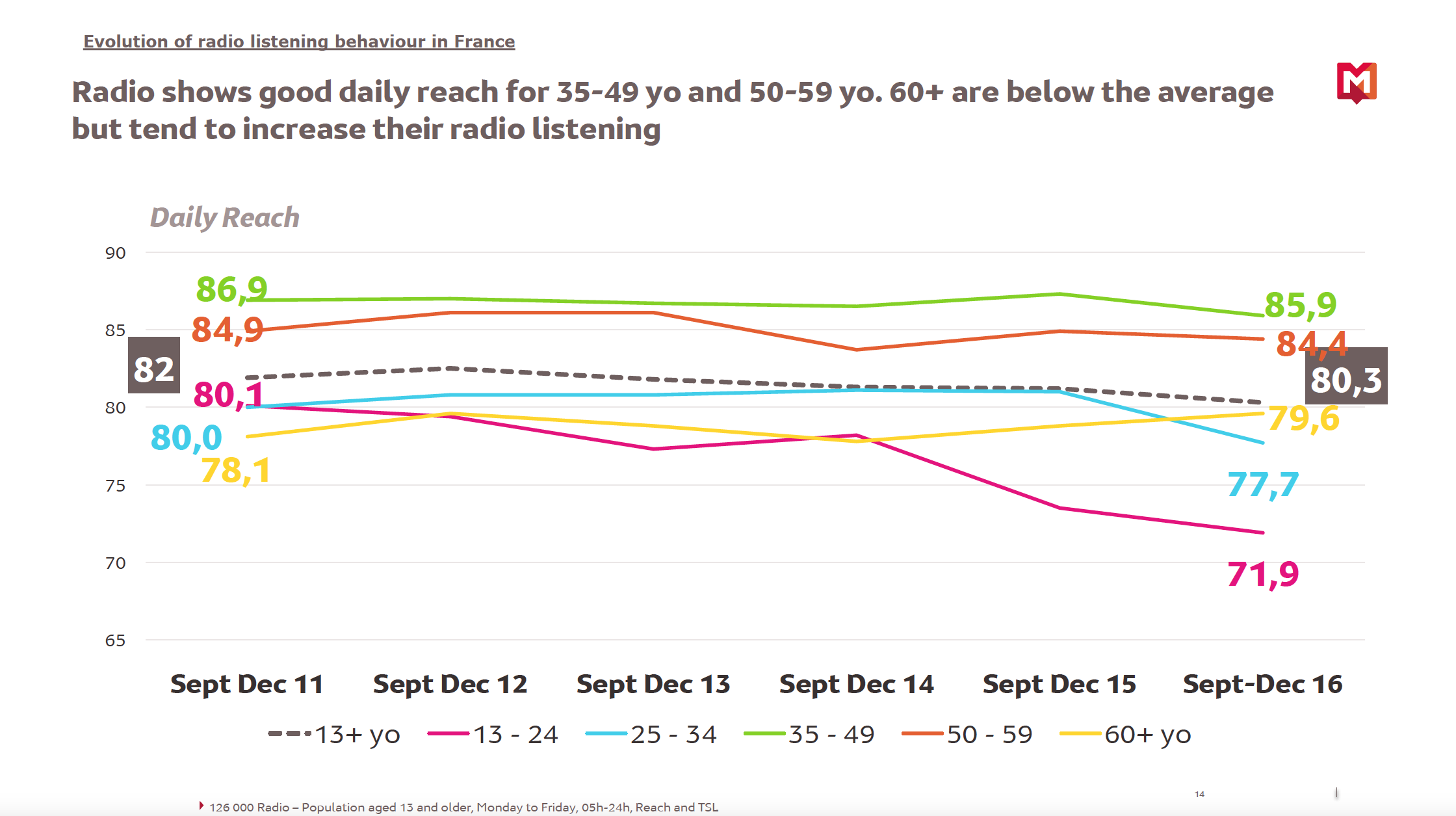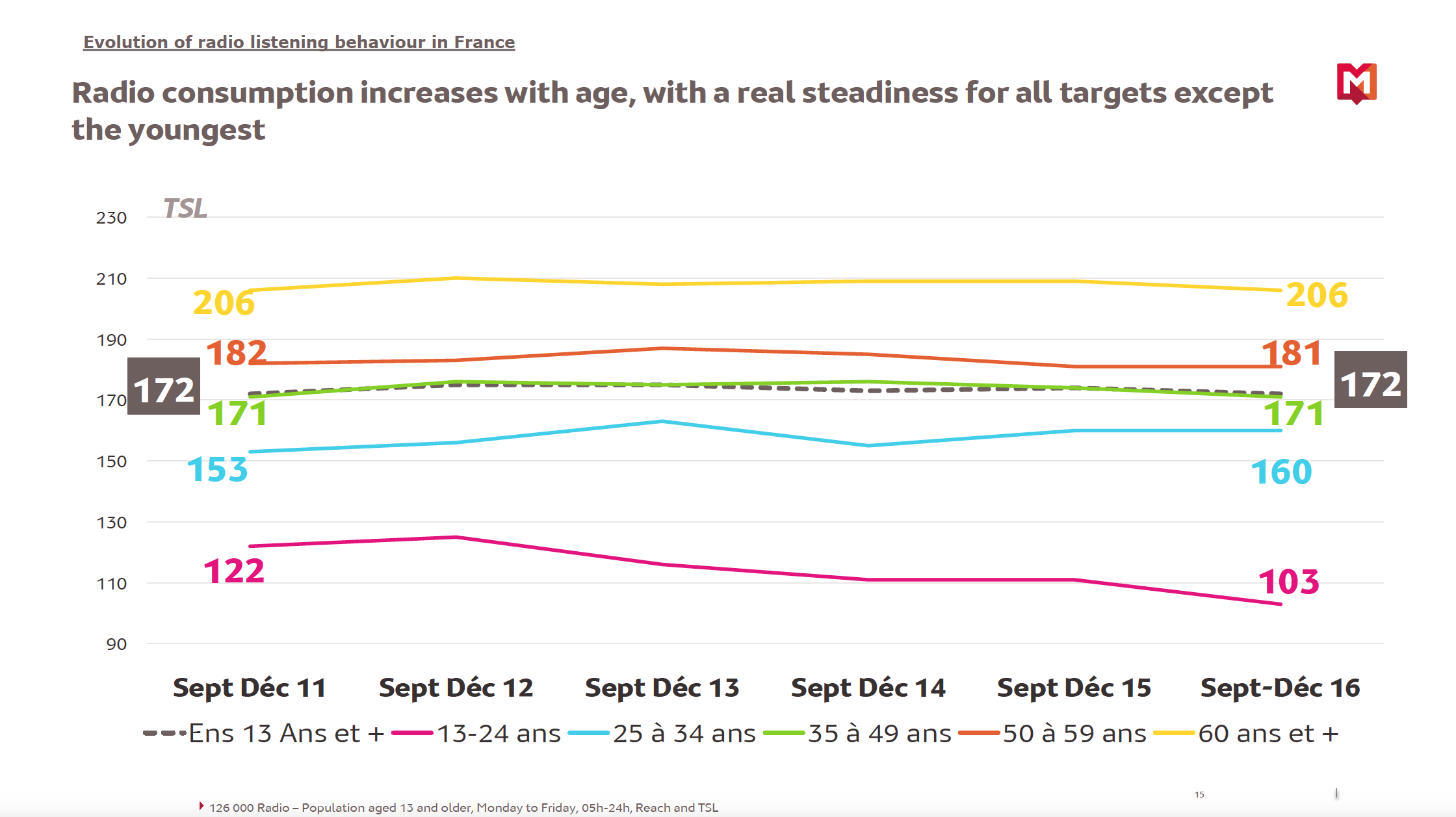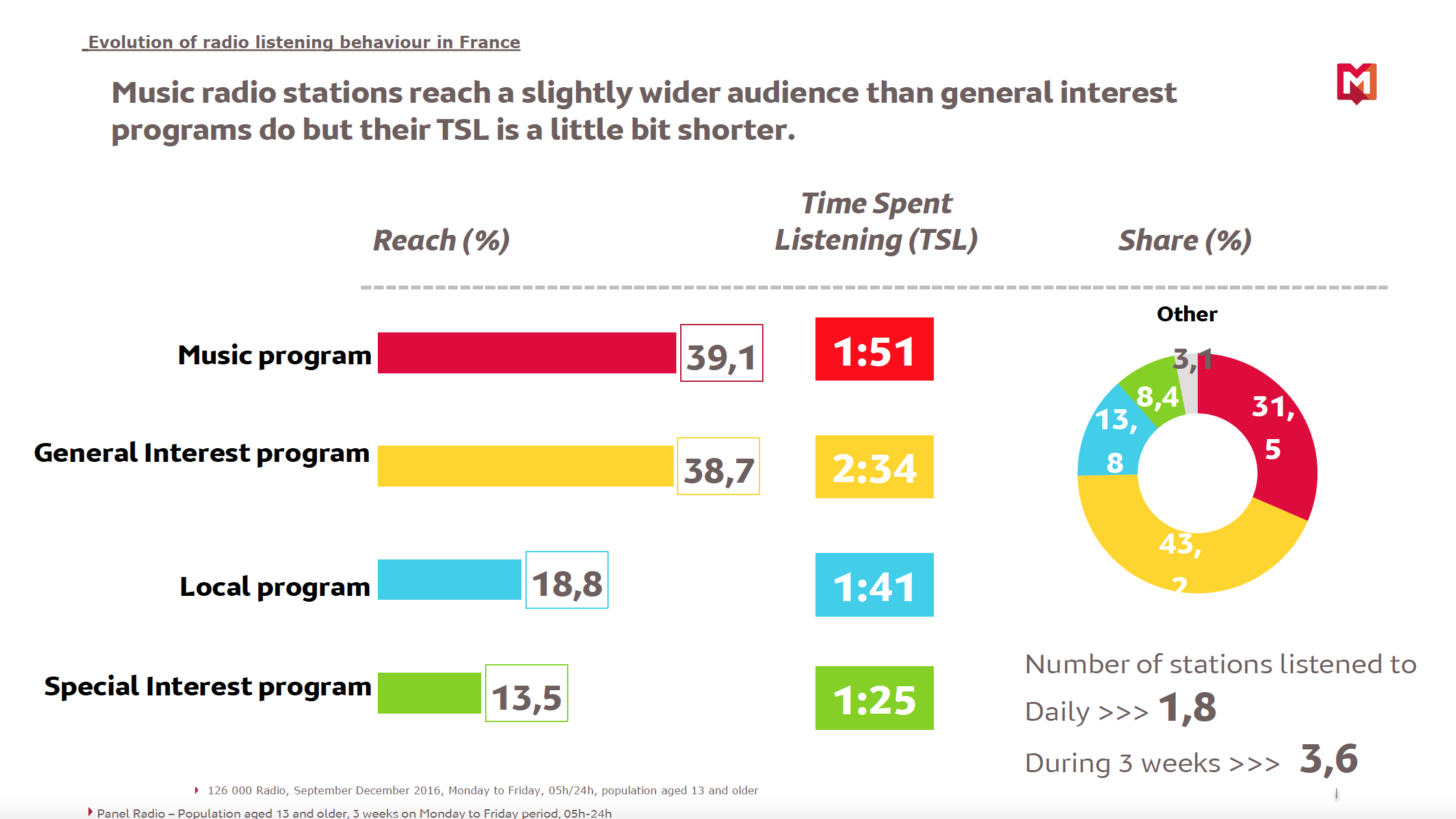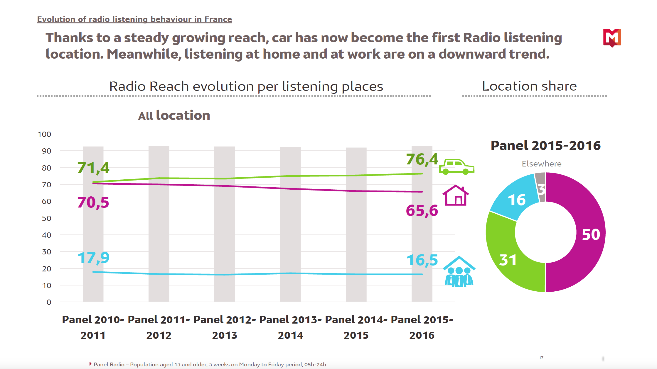 Tous les jours, les français écoutent la radio durant 2h52. Ils sont quotidiennement plus de 43 millions d'auditeurs et la radio française enregistre son peak time à 08h00 du matin avec plus de 14 millions d'auditeurs au même moment. On écoute d'abord la radio dans sa voiture, chez soit et au travail.