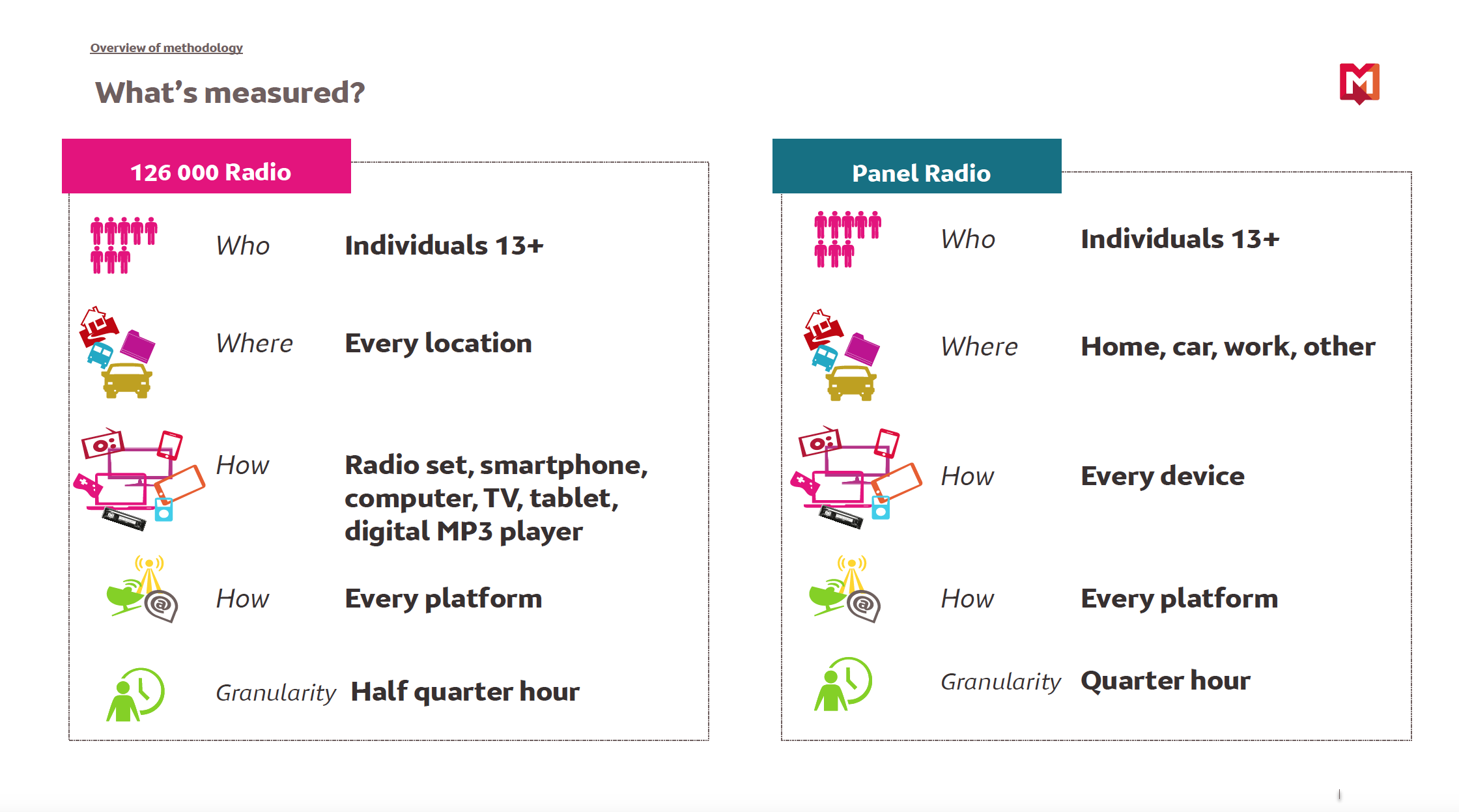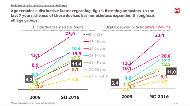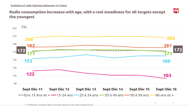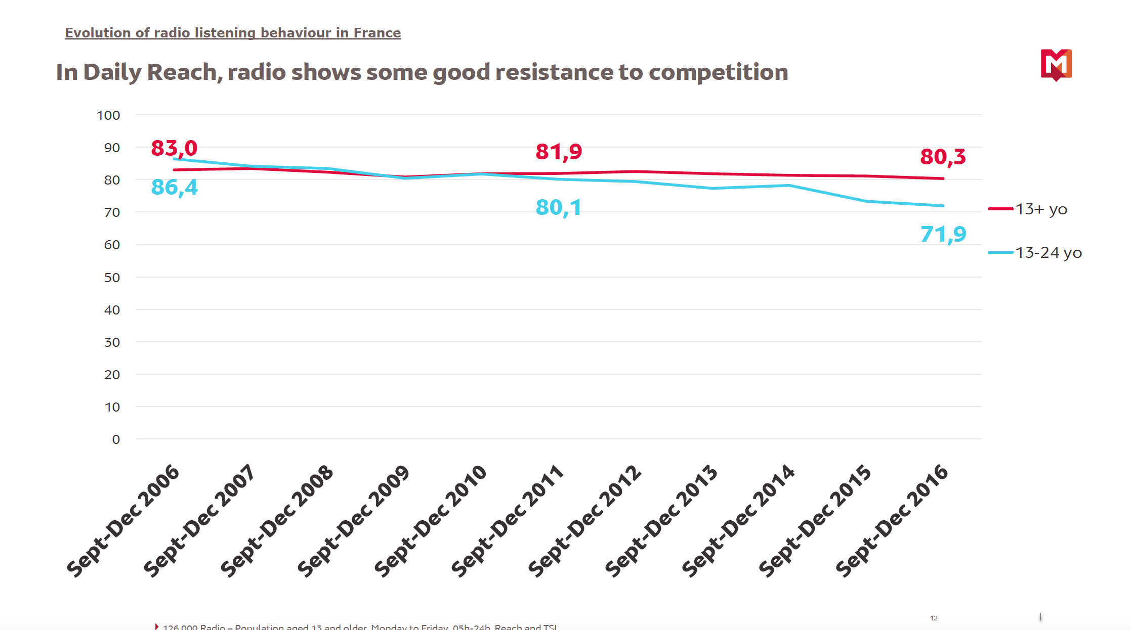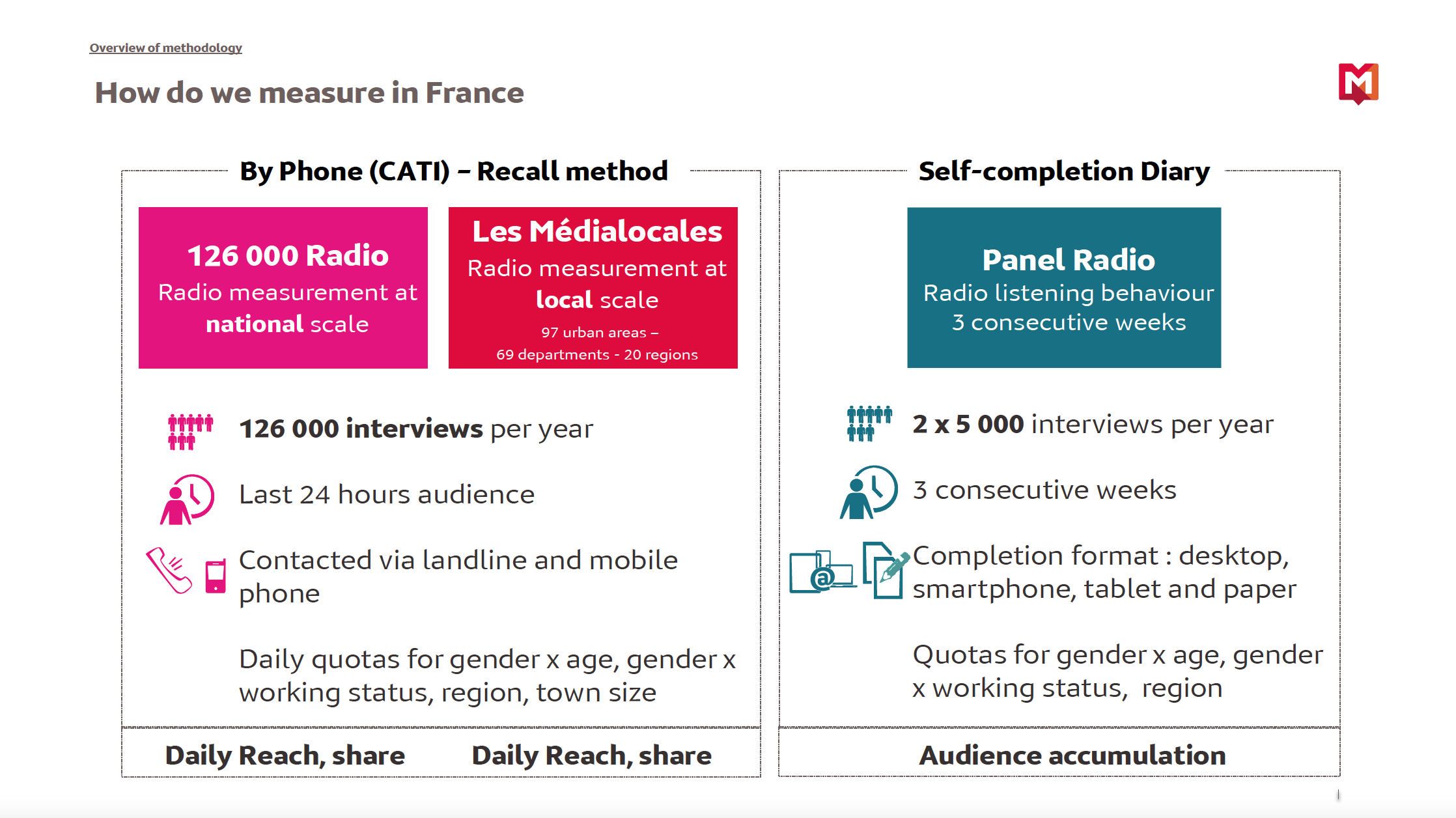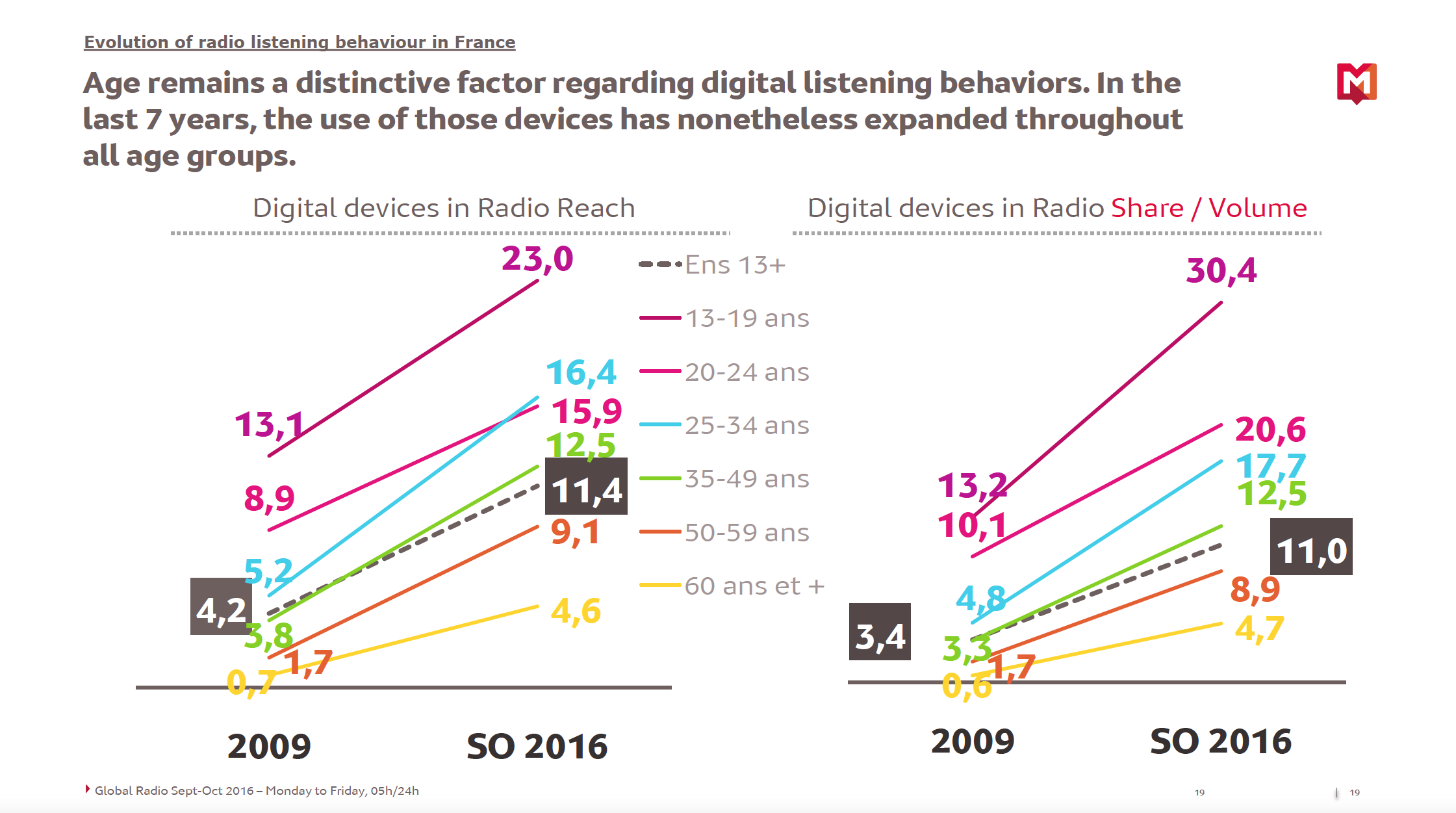 Tous les jours, les français écoutent la radio durant 2h52. Ils sont quotidiennement plus de 43 millions d'auditeurs et la radio française enregistre son peak time à 08h00 du matin avec plus de 14 millions d'auditeurs au même moment. On écoute d'abord la radio dans sa voiture, chez soit et au travail.