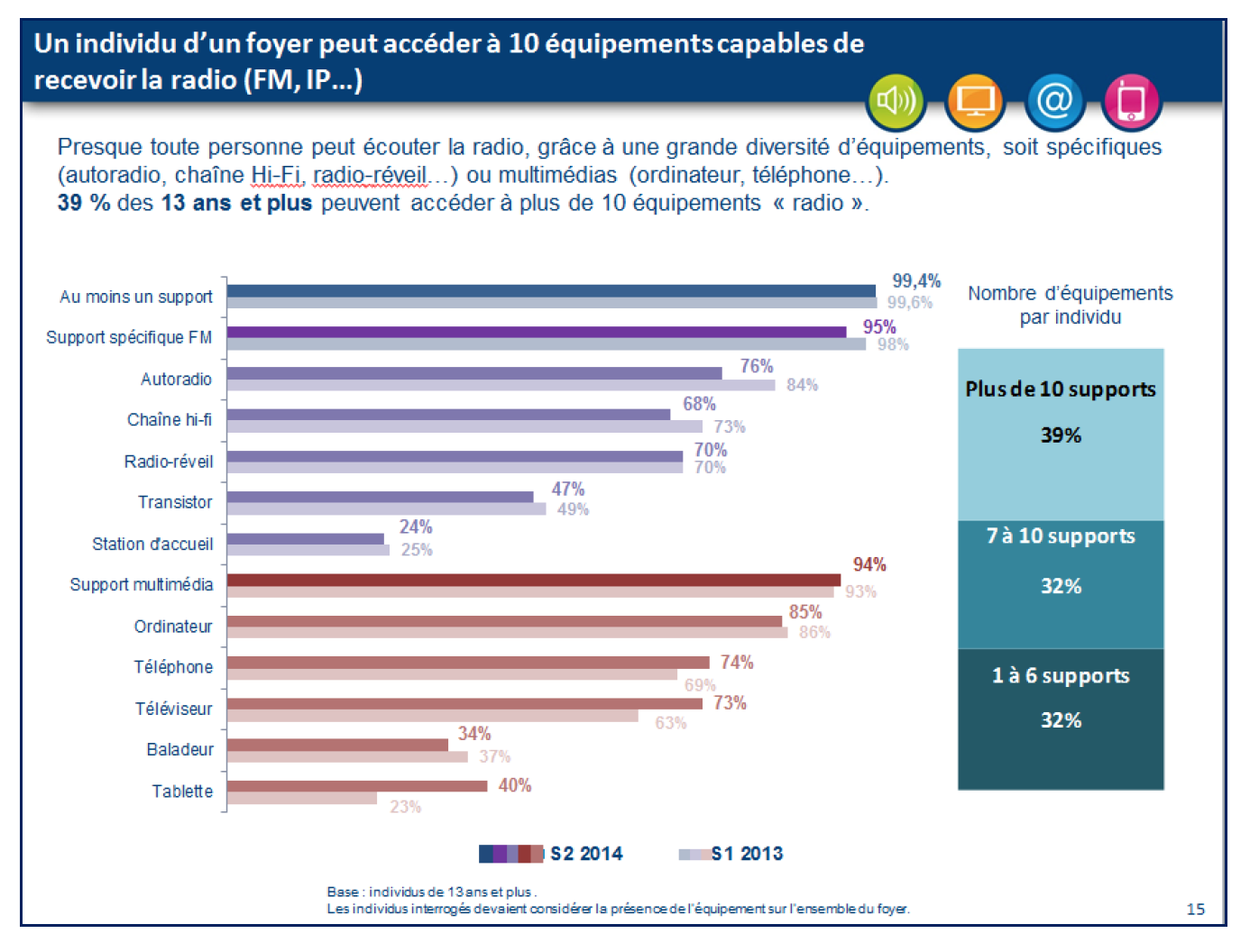 Au second semestre 2014, au sein d’un foyer, un individu accède en moyenne à 10 équipements permettant de recevoir la radio, soit une progression de 0,4 équipement par rapport au 1er semestre 2013. 95 % des personnes de 13 ans et plus sont équipés d’au moins un récepteur uniquement voué à la réception FM et 94 % d’au moins un récepteur multimédia permettant de recevoir la radio. Parmi ces derniers, les téléphones, les téléviseurs et les tablettes enregistrent les plus fortes progressions. Par ailleurs, l’équipement des foyers en téléviseurs enregistre une nouvelle baisse pour la deuxième fois consécutive : 96,7 % des foyers sont équipés d’au moins un téléviseur, soit une baisse de 1,4 point en un an.