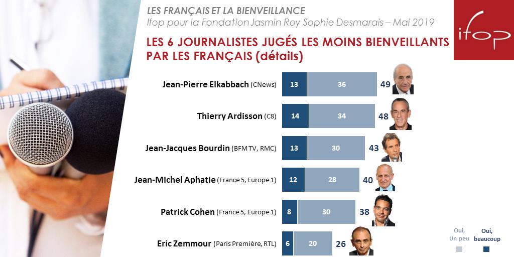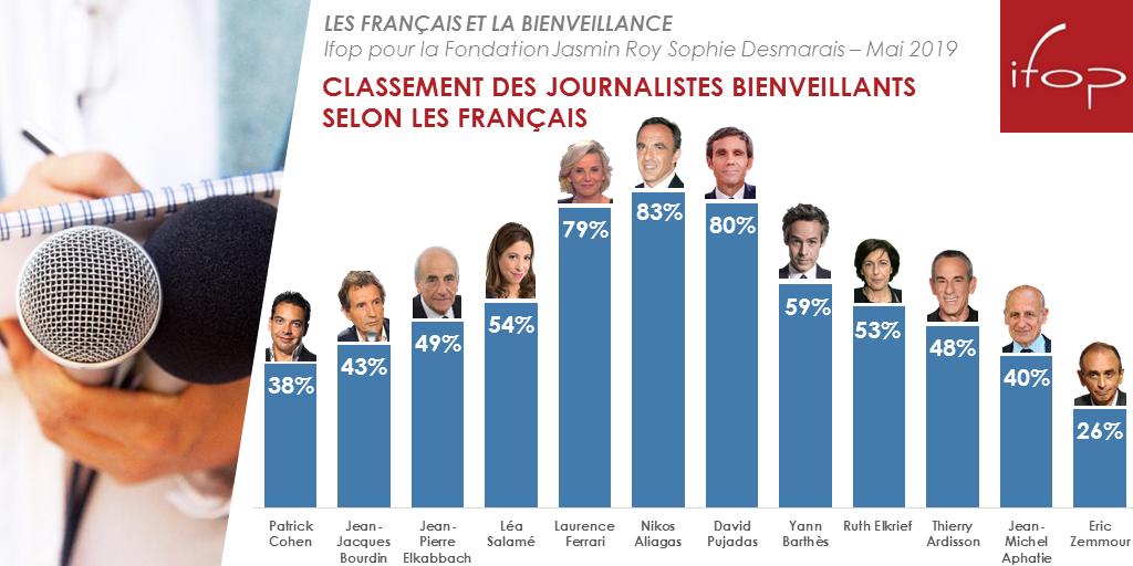 Au classement des journalistes jugés bienveillants selon les Français, on retrouve Nikos Aliagas, David Pujadas, Laurence Ferrari ainsi qu'Eric Zemmour à la dernière place. Les 6 journalistes jugés les moins bienveillants par les Français interrogés sont Jean-Pierre Elkabbach (CNews), Thierry Ardisson (C8), Jean-Jacques Bourdin (RMC), Jean-Michel Apathie (Europe 1) Patrick Cohen (France 5) et Eric Zemmour (RTL)... À peine un tiers des Français (31%) jugent Eric Zemmour bienveillant avec ses invités politiques. À l’inverse, des présentateurs/intervieweurs plus consensuels comme Nikos Aliagas (TF1, Europe 1), David Pujadas (LCI) ou Laurence Ferrari (CNews, Canal+) paraissent bienveillants à plus de quatre Français sur cinq.