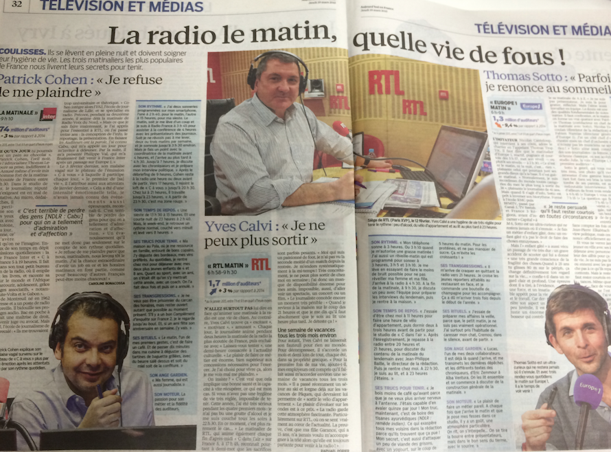 Ensuite, Yves Calvi qui officie sur RTL. Le journaliste l'avoue : "je ne peux plus sortir". Lui aussi se lève tôt : "J'ai aussi un réveil-matin qui est programmé pour sonner à 3 heures, 3 h 5 et 3 h 10". Son plaisir ? "Faire un métier pareil".