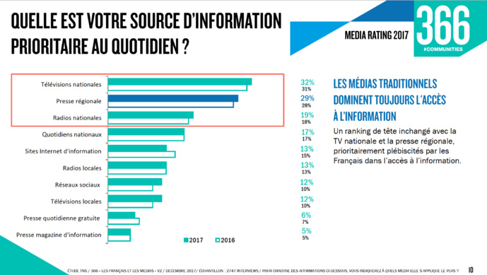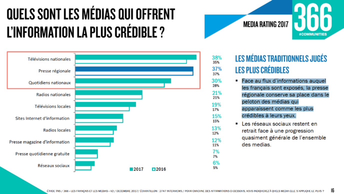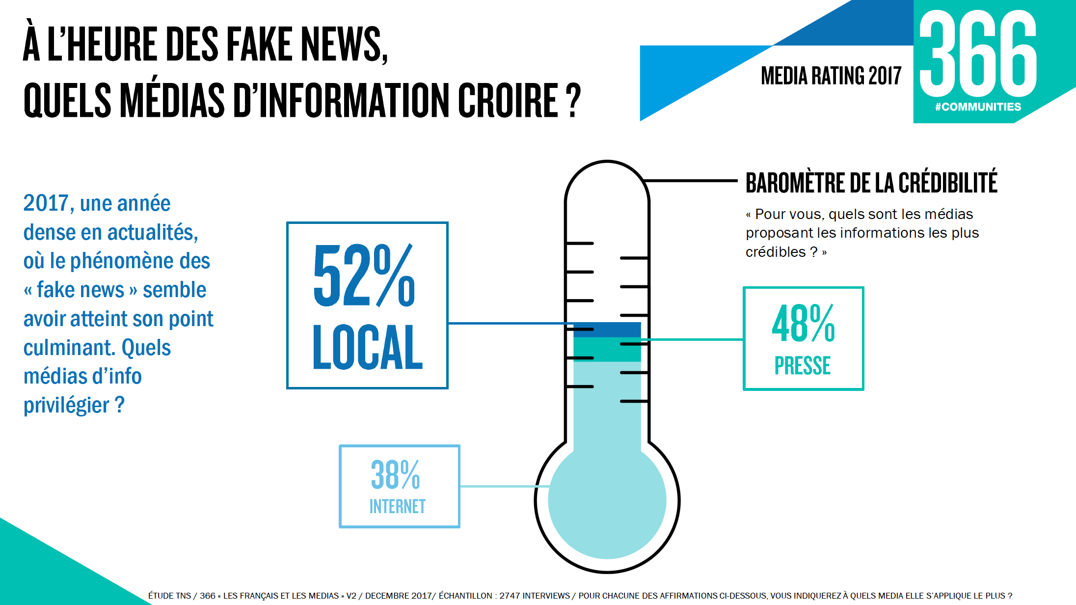 Cette nouvelle étude permet de comprendre le rapport des Français aux médias. Quels sont les médias jugés prioritaires pour s’informer ? Quelles sont les sources d’info prioritaires des Français ? Est-ce que l’info est crédible, de qualité ? Quels sont les médias les plus proches des Français, ceux avec lesquels ils ont créé un lien fort, dans lesquels ils se retrouvent ? Quels sont les médias qui retiennent l’attention des Français et qui alimentent leurs discussions ? Quels sont les médias dans lesquels la publicité est la plus visible, la mieux intégrée, la plus intéressante ? Un des enseignements : le local et le print progressent auprès des plus jeunes, alors que 2017 symbolise le point culminant du phénomène des "fake news".