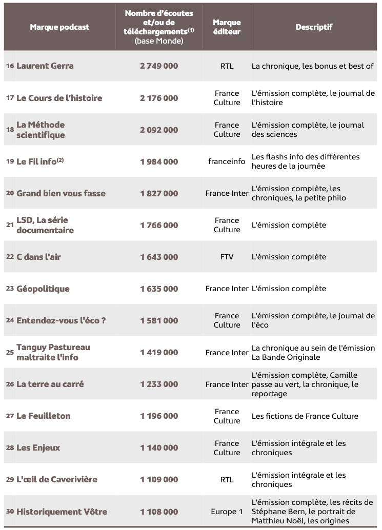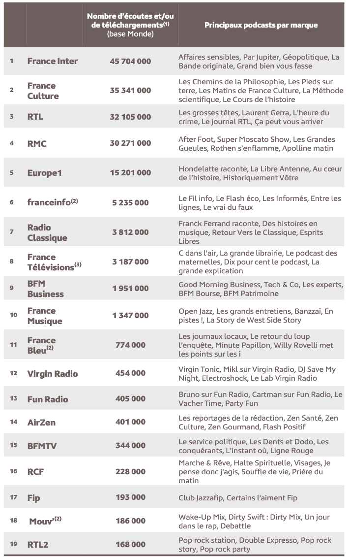 France Inter (45 704 000), France Culture (35 341 00), RTL (32 105 00), RMC (30 271 000) et Europe 1 (15 201 000) sont dans le Top 5 des radios dont les podcasts sont les plus écoutés et les plus téléchargés.