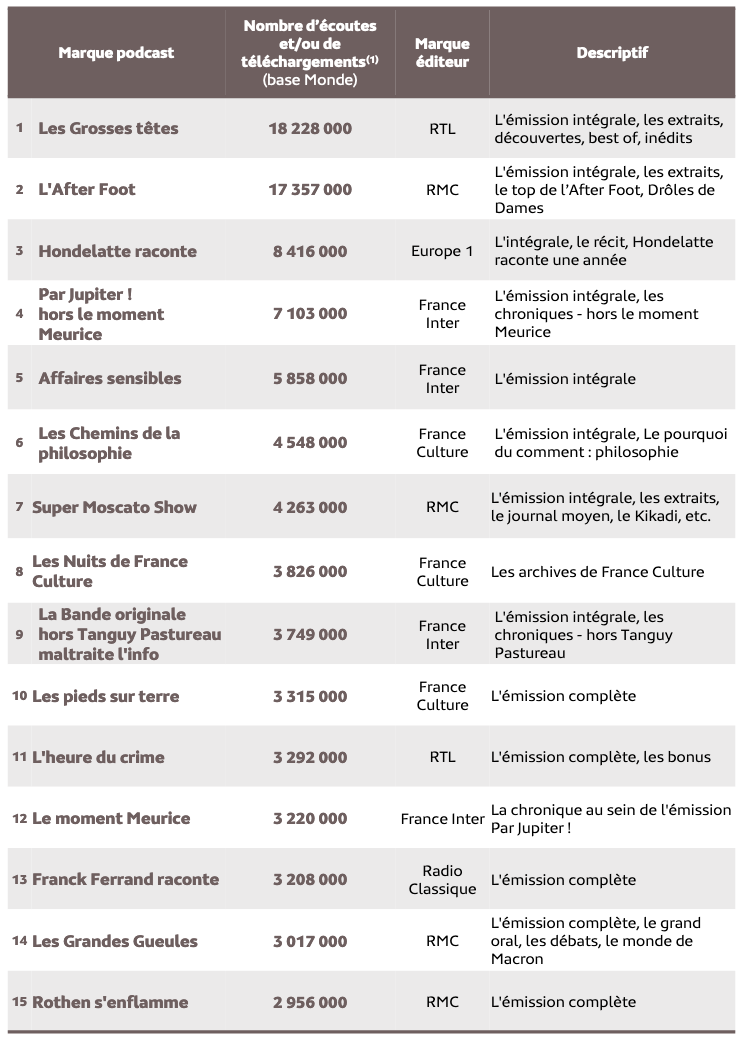 "Les Grosses têtes" est l''émission la plus téléchargée avec 18 228 000 écoutes. Suivent "L'After Foot" (RMC), "Hondelatte raconte" (Europe 1), "Par Jupiter" (France Inter), "Affaires sensibles" (France Inter).