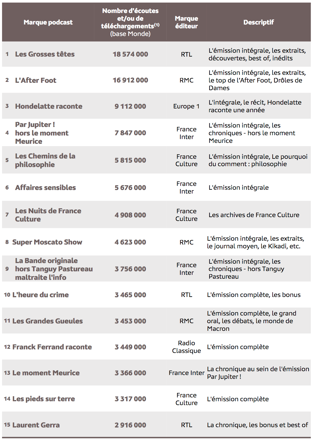 En avril, l'émission la plus podcastée est "Les Grosses têtes" qui, à elle seule, représente, près de 19 millions d'écoutes et/ou de téléchargements. Suivent "L'After Foot" sur RMC, "Hondelatte raconte" sur Europe 1 et "Par Jupiter" sur France Inter.