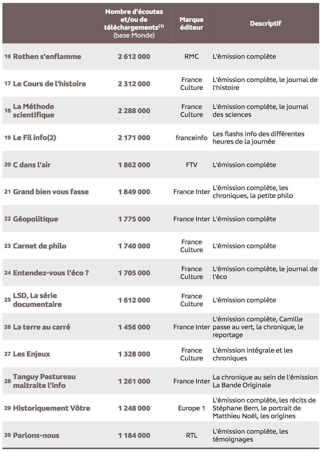 Deux radios dépassent le seuil des 40 millions d'écoutes et/ou de téléchargements : France Inter (49 341 000) et France Culture (41 199 000). Suivent RTL, RMC, Europe 1, franceinfo et Radio Classique.