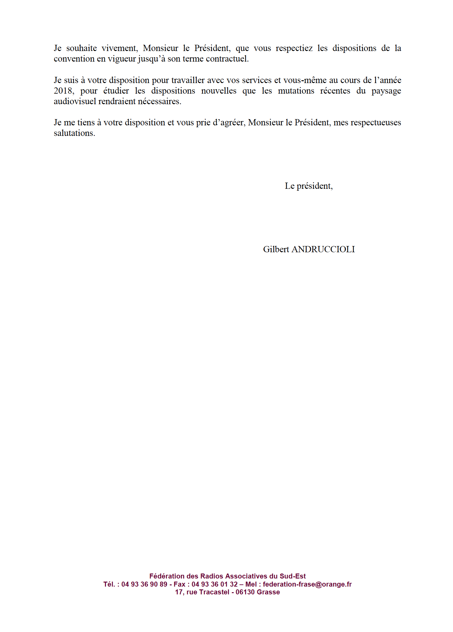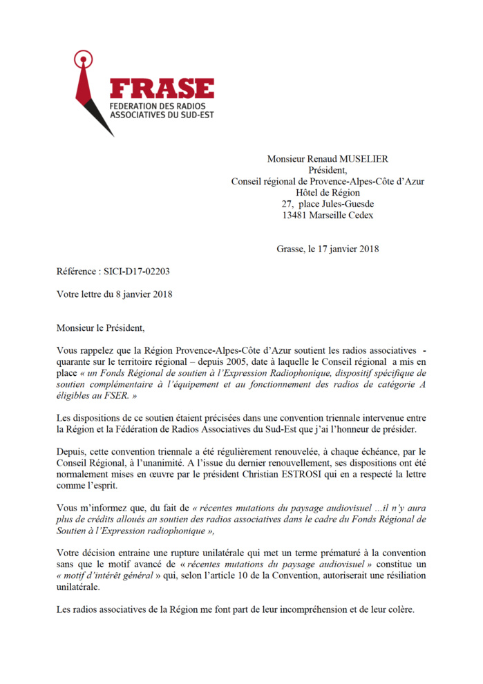 Depuis 2005, le Conseil Régional soutient les 40 radios associatives de SUD Provence-Alpes-Côte d’Azur au moyen d’une subvention annuelle de fonctionnement, et, de manière triennale, par une aide à l’équipement. Le 8 janvier dernier, la Région a décidé de rompre la convention qui la lie à la FRASE jusqu’au 31 décembre 2018 avant un éventuel renouvellement. Pour la FRASE, la décision est prise "en infraction avec une convention triennale intervenue en 2005 entre la Région et la Fédération des Radios associatives du Sud-Est, convention constamment renouvelée à l’unanimité depuis cette date. Cette attaque contre les radios associatives porte gravement atteinte à la libre expression des citoyens et de tous les acteurs du développement associatif, culturel, économique et social de nos territoires".