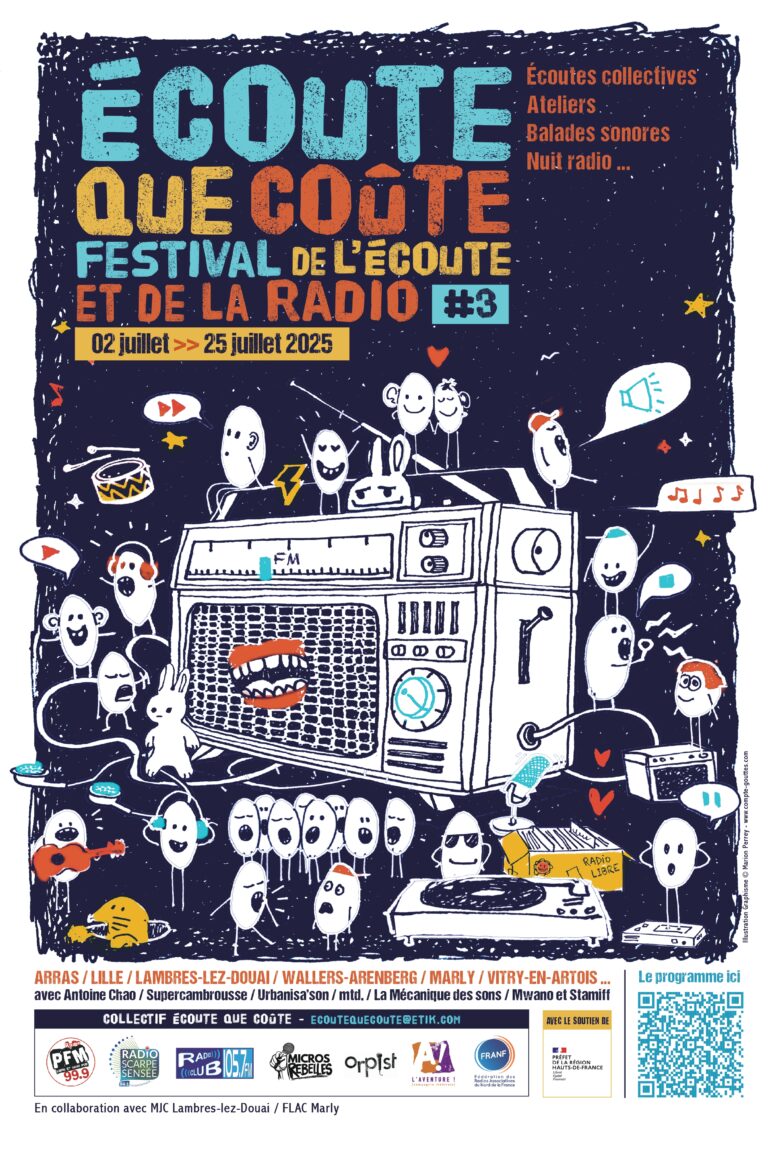 Depuis sa création, le festival Écoute Que Coûte valorise la diversité des formats radiophoniques et l’importance de la radio dans le paysage médiatique local. Cette année, le festival se tiendra à Arras, Vitry-en-Artois, Lambres-Lez-Douai, Lille, Marly et Wallers-Arenberg. Au programme, des écoutes collectives, des ateliers, des soirées thématiques et des rencontres avec des professionnels de la radio et de l’audio digital. Le 2 juillet, la journée inaugurale à Wallers-Arenberg sera consacrée à la rencontre entre radios associatives sur la thématique de la santé mentale. Le 4 juillet, Antoine Chao proposera une soirée d’écoute radiophonique à la MJC de Lambres-Lez-Douai, illustrant son engagement historique au sein des radios libres et publiques.