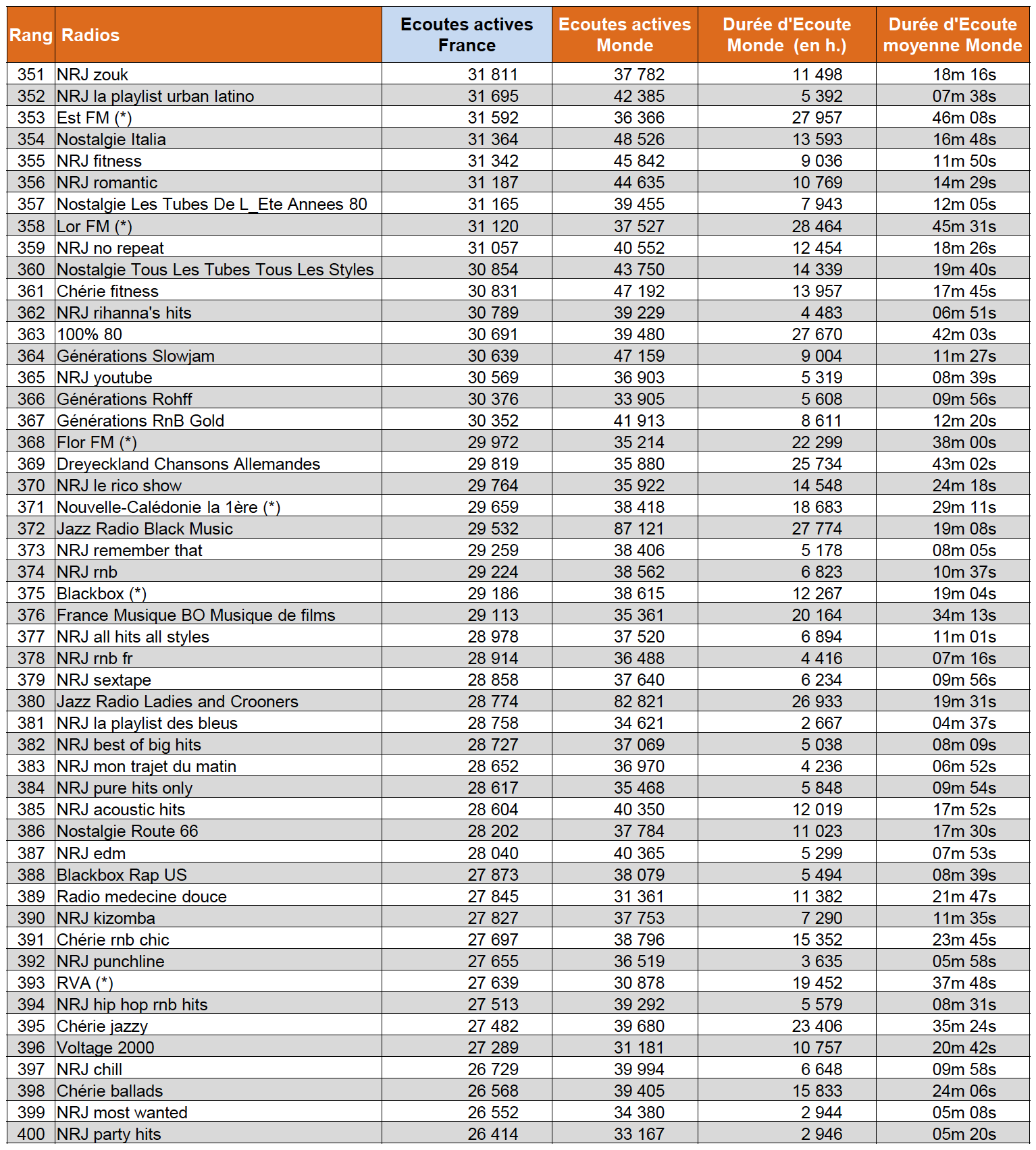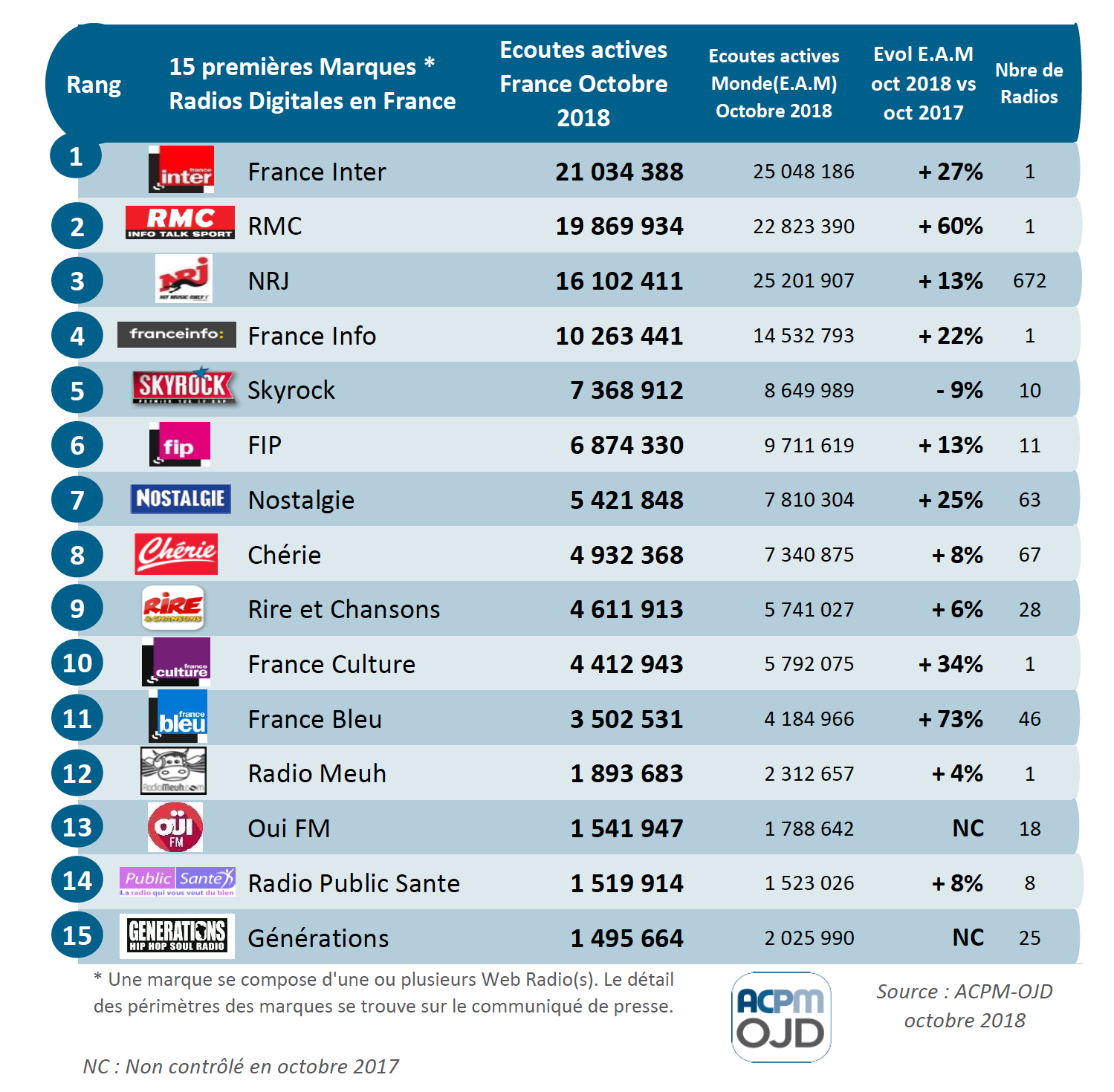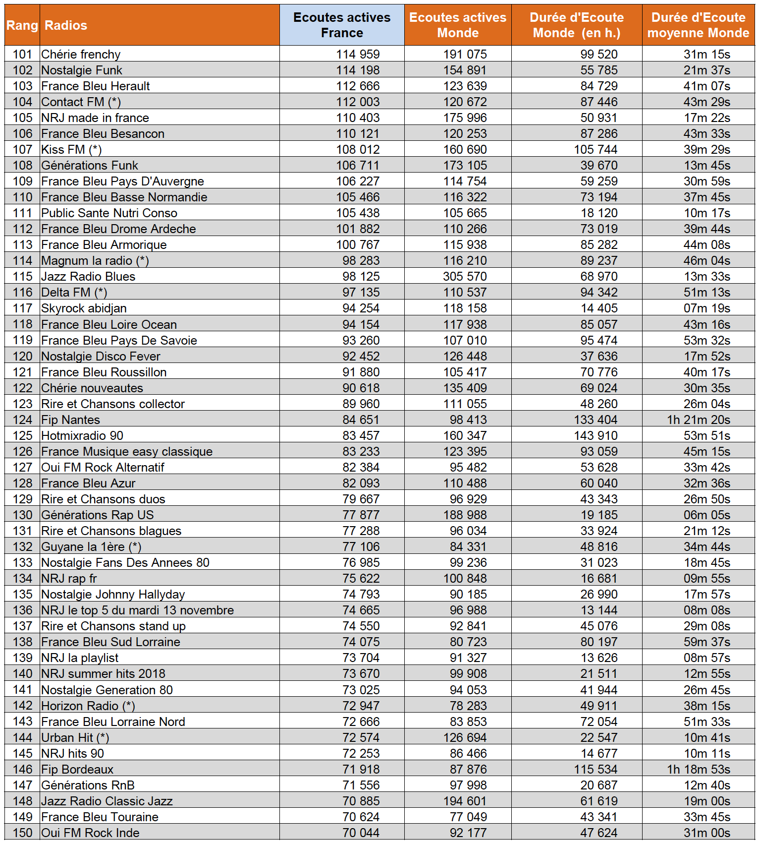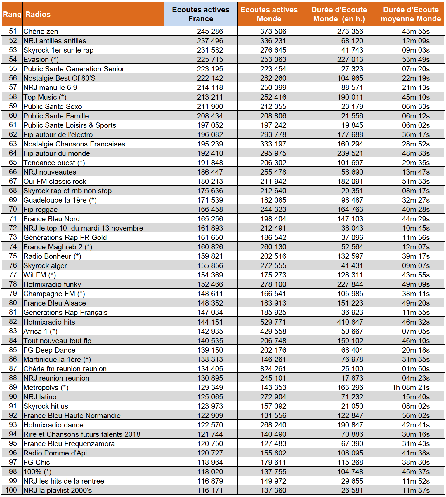 À noter dans ce classement de ce mois d'octobre, la certification de la diffusion des radios digitales de la marque Outre-Mer La 1ère ainsi que l'entrée dans le classement "Groupes, Groupements et Réseaux" du groupe La Voix FM.