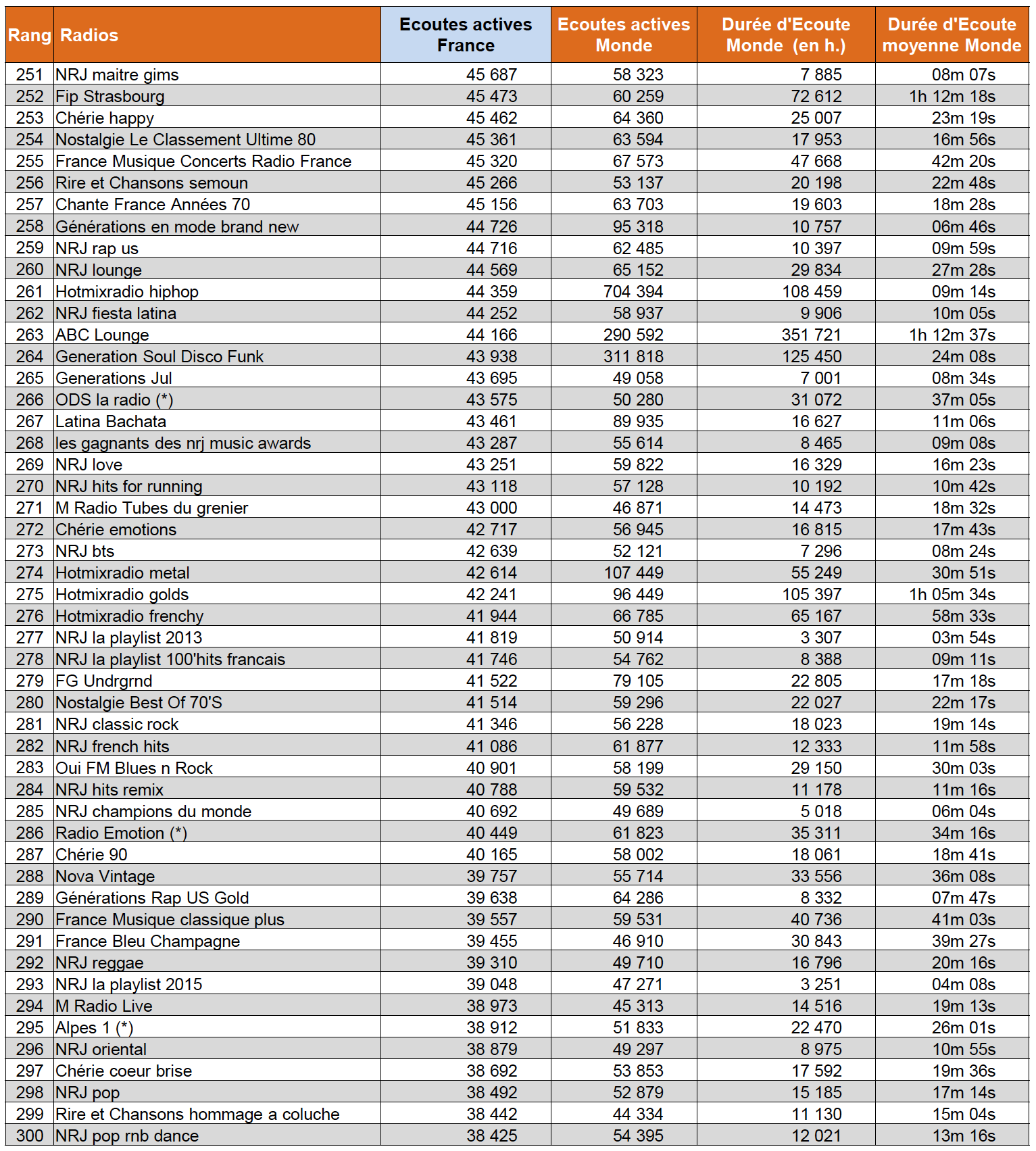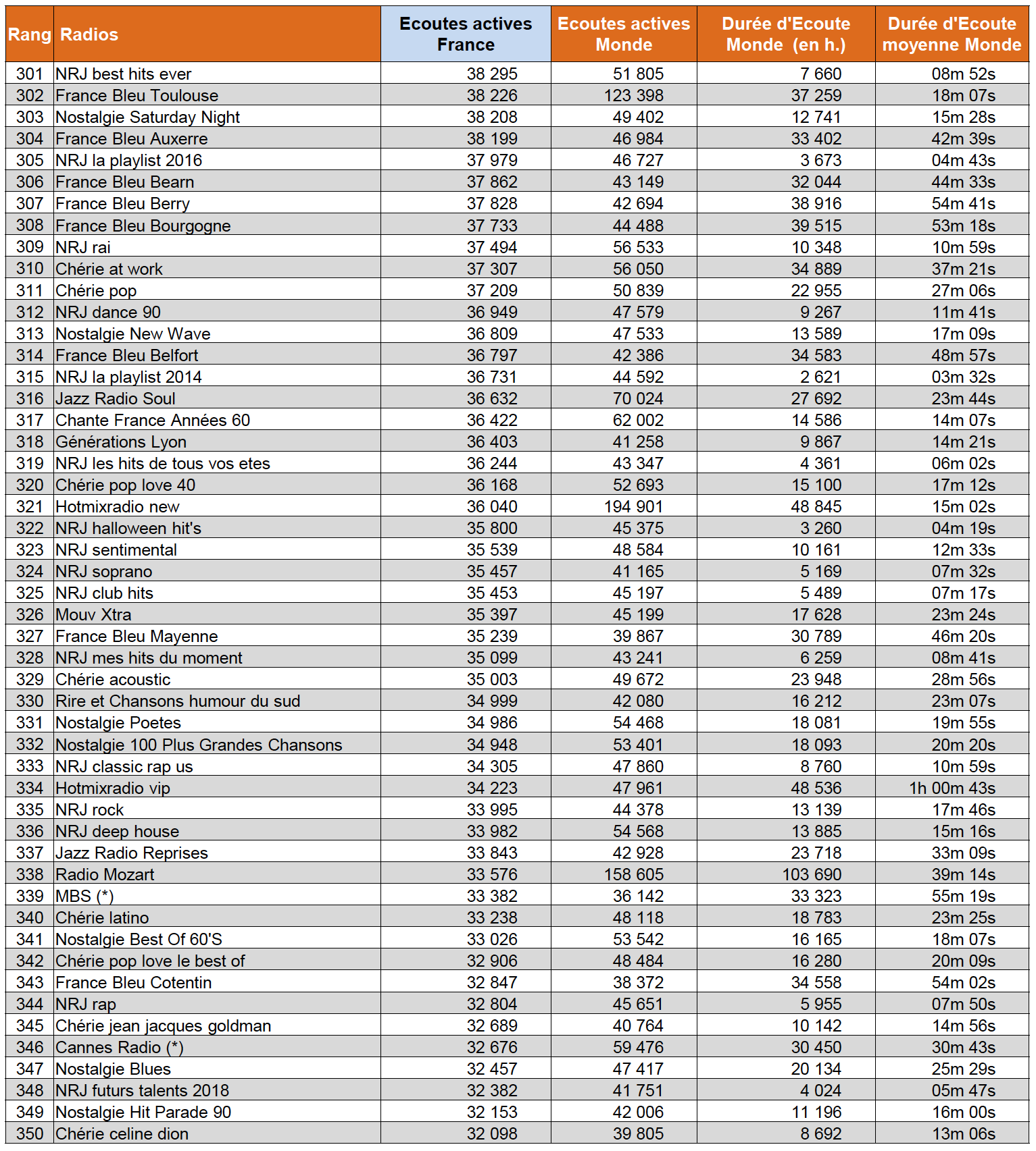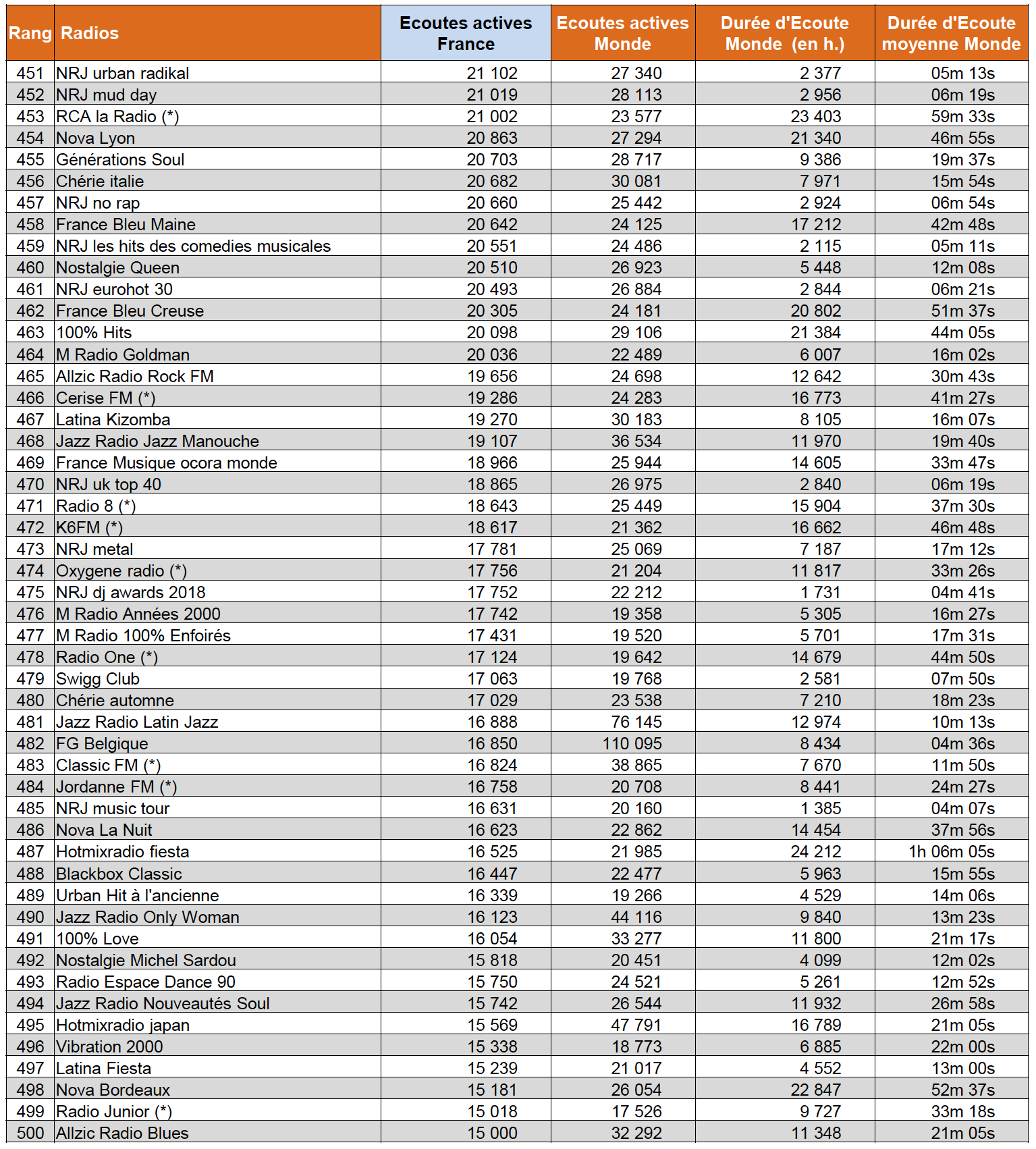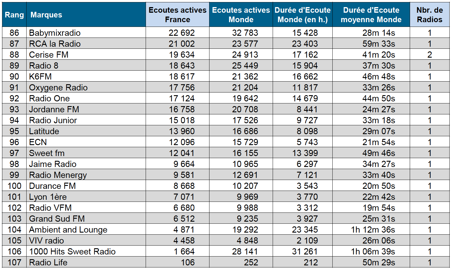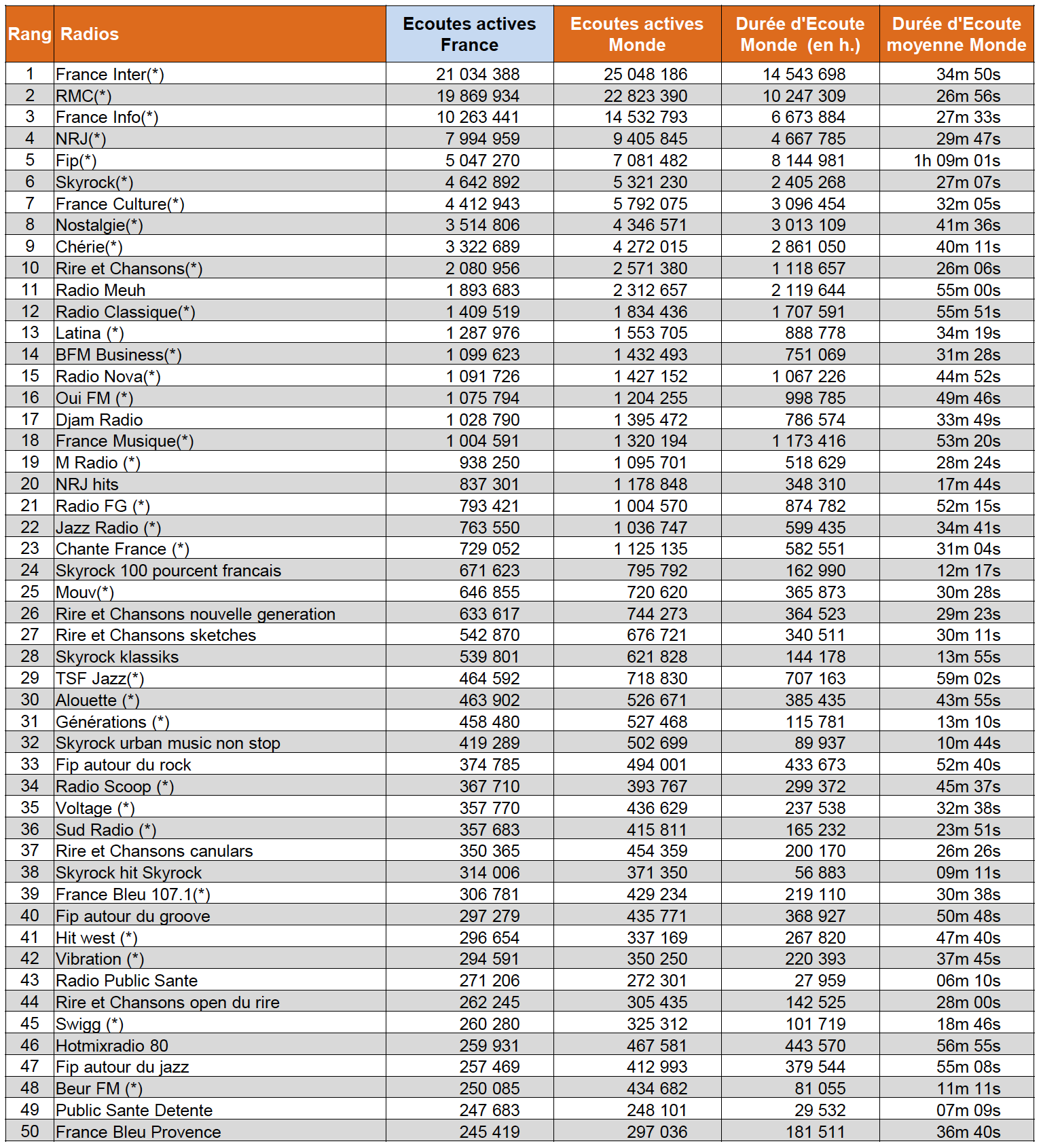 À noter dans ce classement de ce mois d'octobre, la certification de la diffusion des radios digitales de la marque Outre-Mer La 1ère ainsi que l'entrée dans le classement "Groupes, Groupements et Réseaux" du groupe La Voix FM.