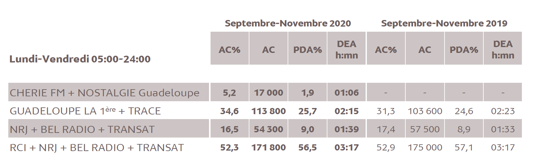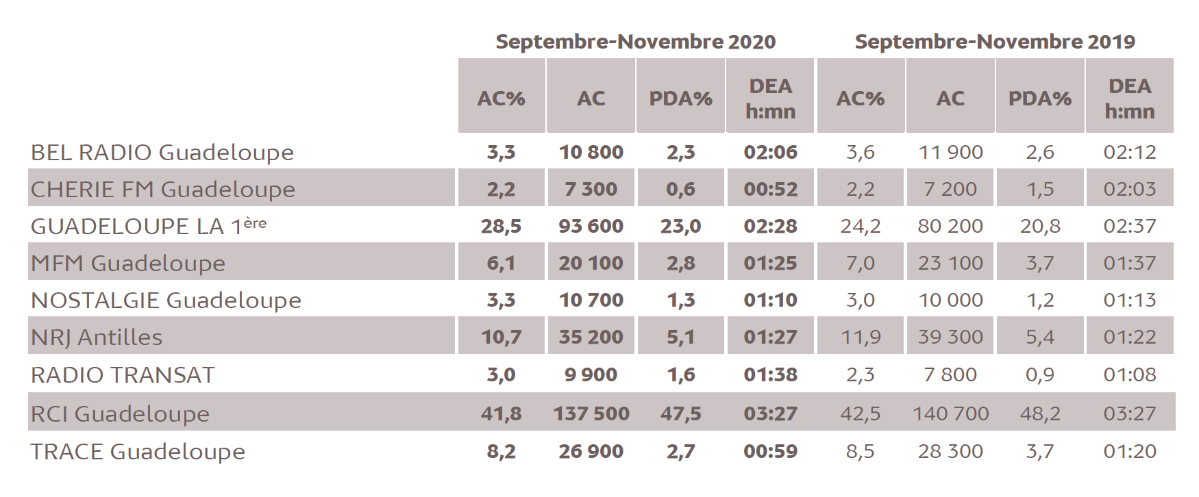 En Guadeloupe, 1% d’audience cumulée en 2020 représente 3 286 personnes âgées de 13 ans et plus. La radio y enregistre une audience cumulée (en hausse) de 78.7% (258 600 auditeurs quotidiens) et génère une DEA remarquable de 3h52 : RCI Guadeloupe avec une audience remarquable de 41.8% (pour une PDA de 47.5%) y est la plus écoutée.