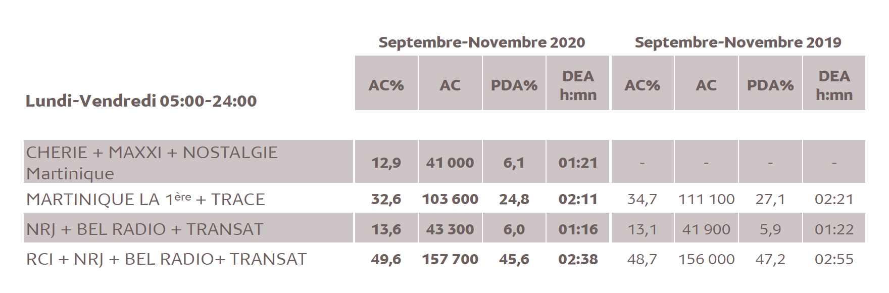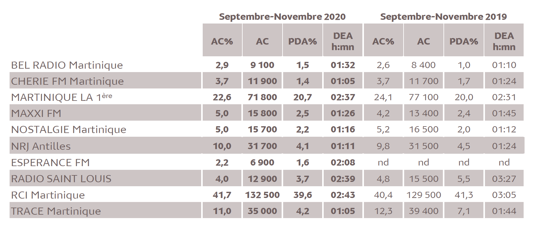 En Martinique, 1% d’audience cumulée en 2020 représente 3 178 personnes âgées de 13 ans et plus. L'audience cumulée (en baisse) de la radio est de 77.1% (245 000 auditeurs quotidiens) pour une DEA de 3h43. Dans le peloton de tête : RCI Martinique (41.7%), Martinique La 1ère (22.6%) et Trace Martinique (11.0%).