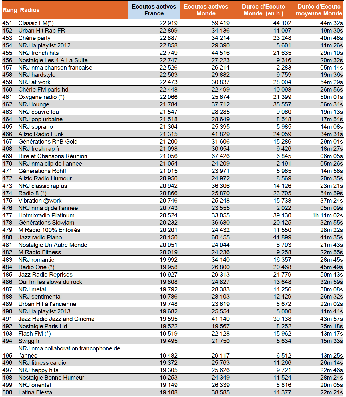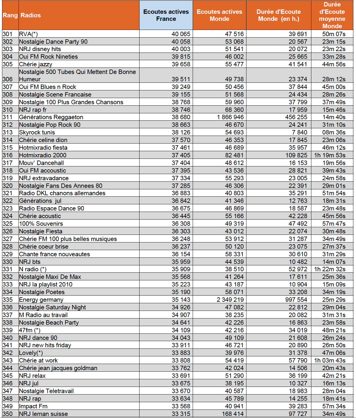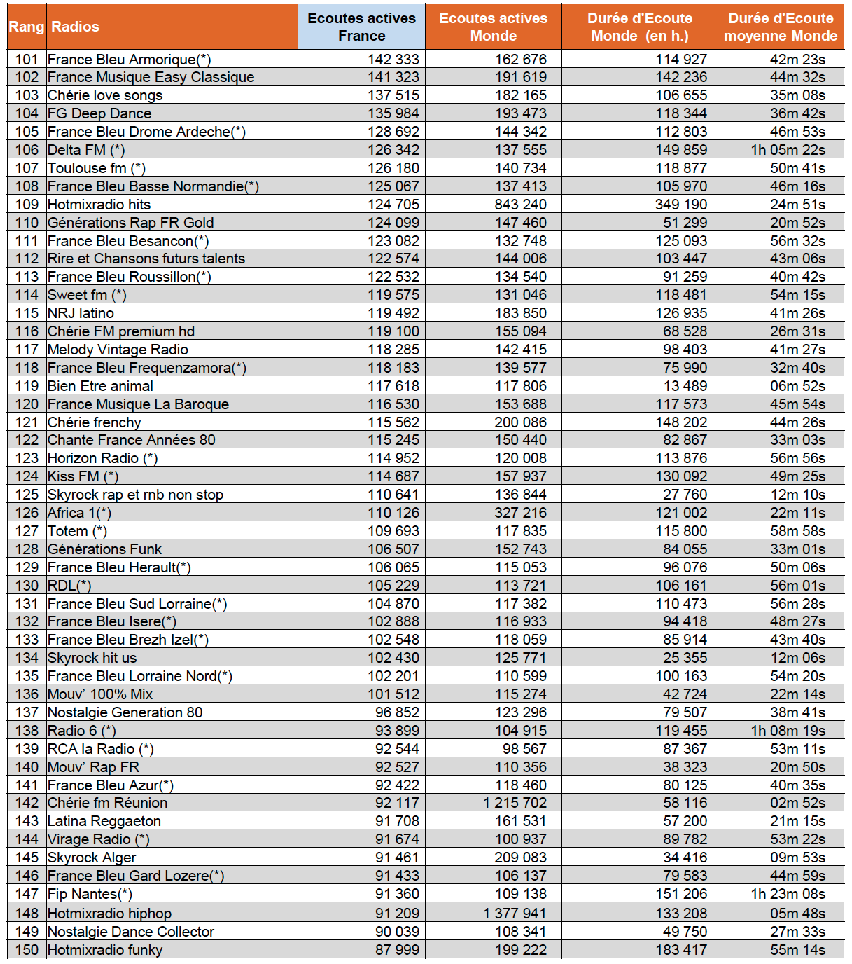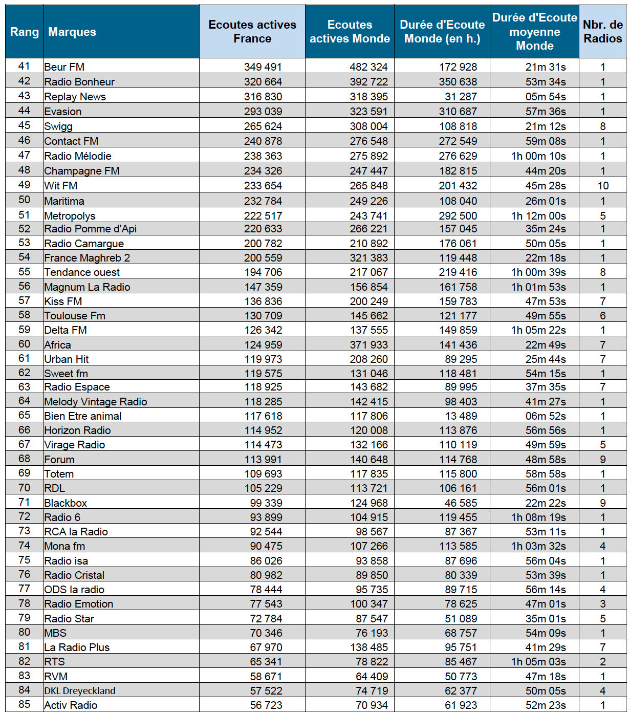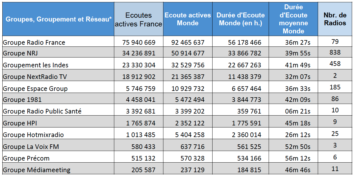 En novembre, Radio France s'impose comme un poids lourd de l'écoute numérique en France avec plus de 75 millions d'écoutes actives loin devant le NRJ Group avec près de 35 millions d'écoutes actives. Plus bas, plusieurs groupes régionaux s'imposent progressivement : Espace Group, 1981, HPI, La Voix FM, Précom et Mediameeting. Le classement des radios les plus écoutées est tenu par France Inter, franceinfo, RMC, NRJ, France culture, FIP, Nostalgie, Skyrock, Chérie FM et Radio Classique. Ce mois-ci, Radio Meuh, flux uniquement disponible sur le web, maintient sa place dans le Top 20, entre Radio Nova et BFM Business. Seules 4 marques se positionnent au-dessus des 10 millions d'écoutes actives : France Inter, franceinfo, RMC et NRJ.
