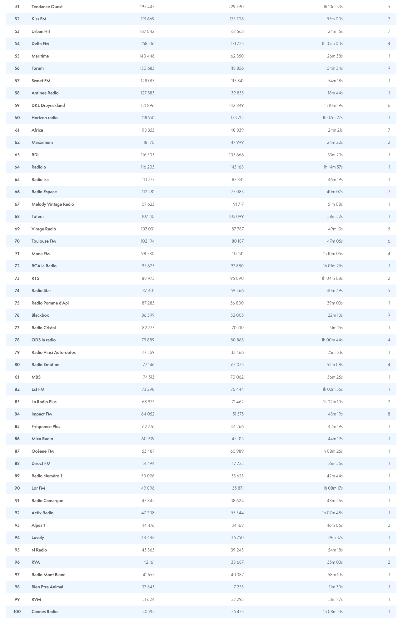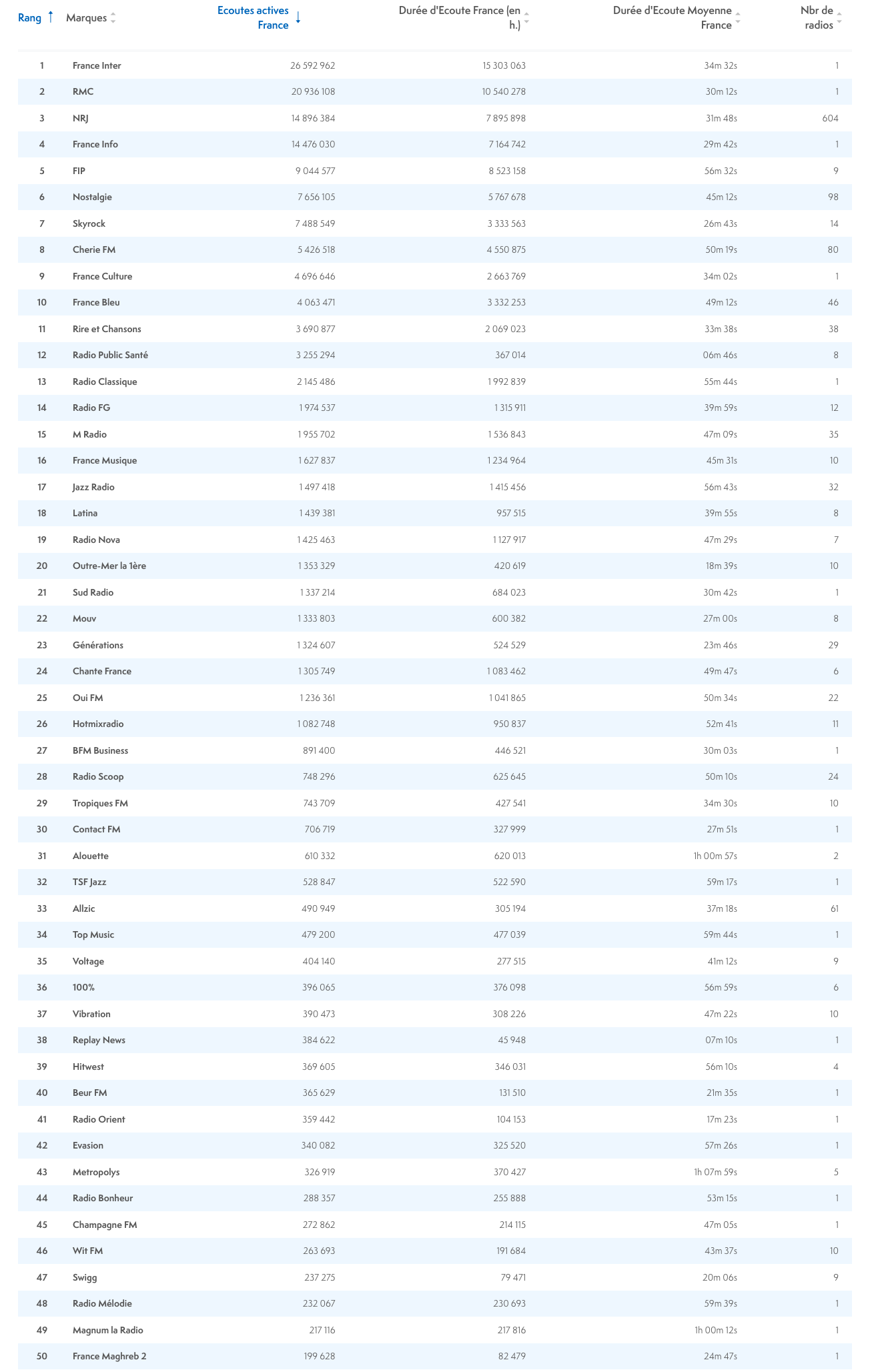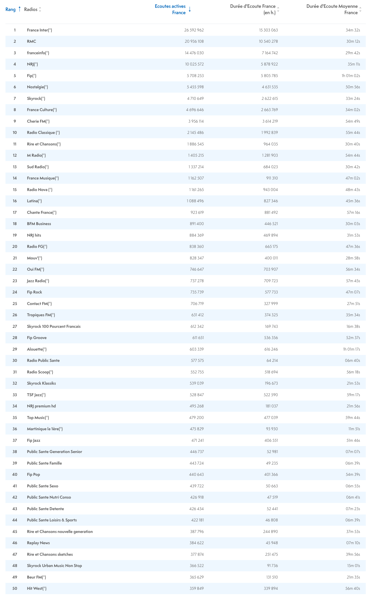 Le top 5 mensuel se compose de France Inter (26 592 962), RMC (20 936 108), NRJ (14 896 384), franceinfo (14 476 030) et FIP (9 044 577). Quatre groupes se dégagent nettement dans le classement par groupes et réseaux : Radio France (61 835 326 avec seulement 76 flux), NRJ Group (31 669 884 avec 820 flux), Les Indés Radios (24 968 564 avec 471 flux) et NextRadioTV (21 827 508 avec seulement deux flux). Enfin, plusieurs radios indépendantes apparaissent dans le Top 30 des radios les plus écoutées : Alouette, Tropiques FM, Contact FM, Oüi FM ou encore Radio FG, Chante France et Latina.