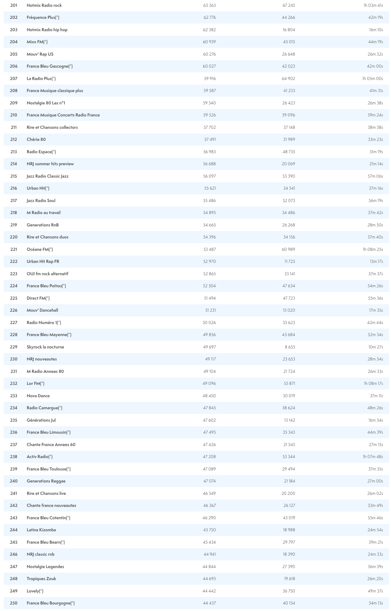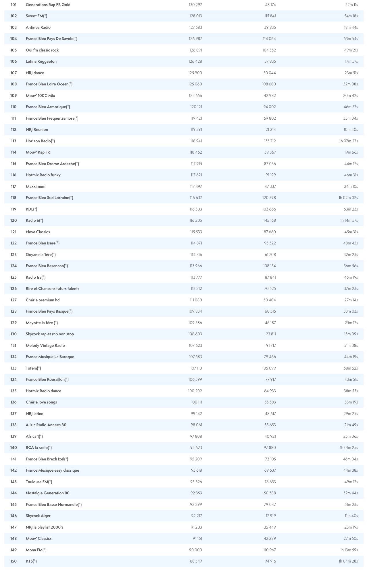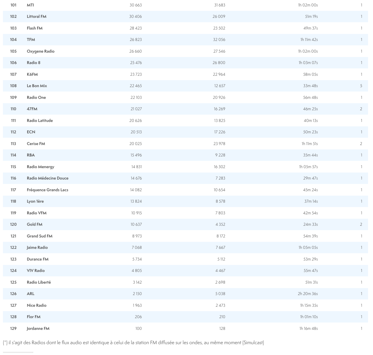 Le top 5 mensuel se compose de France Inter (26 592 962), RMC (20 936 108), NRJ (14 896 384), franceinfo (14 476 030) et FIP (9 044 577). Quatre groupes se dégagent nettement dans le classement par groupes et réseaux : Radio France (61 835 326 avec seulement 76 flux), NRJ Group (31 669 884 avec 820 flux), Les Indés Radios (24 968 564 avec 471 flux) et NextRadioTV (21 827 508 avec seulement deux flux). Enfin, plusieurs radios indépendantes apparaissent dans le Top 30 des radios les plus écoutées : Alouette, Tropiques FM, Contact FM, Oüi FM ou encore Radio FG, Chante France et Latina.
