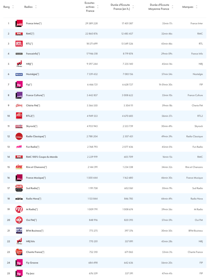 France Inter (29 589 228), RMC (22 860 876), RTL (18 571 699), franceinfo (17 946 518) et NRJ (9 597 244) sont les stations qui composent le Top 5 du mois de décembre des stations les plus écoutées sur le web. Radio France parvient à placer 4 de ses 7 stations dans les 10 première places : France Inter (1ère), franceinfo (4e), FIP (7e et avec plus d'une heure de durée d'écoute moyenne, la plus longue du Top 15) et France Culture (8e). En décembre, on notera également l'excellente performance de la radio temporaire "RMC Coupe du monde" qui a généré durant ce mois, 2 229 919 écoutes actives.