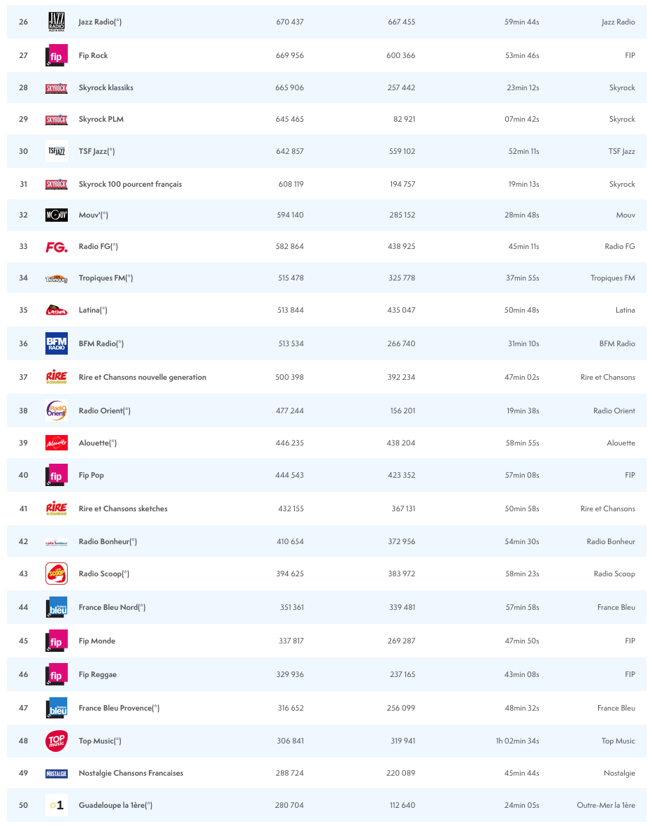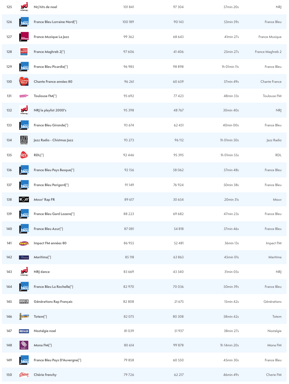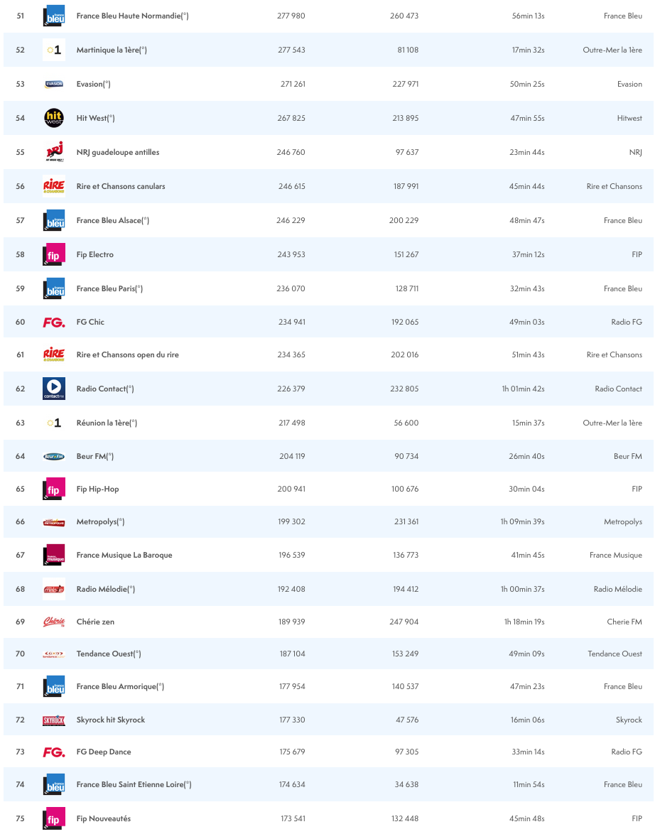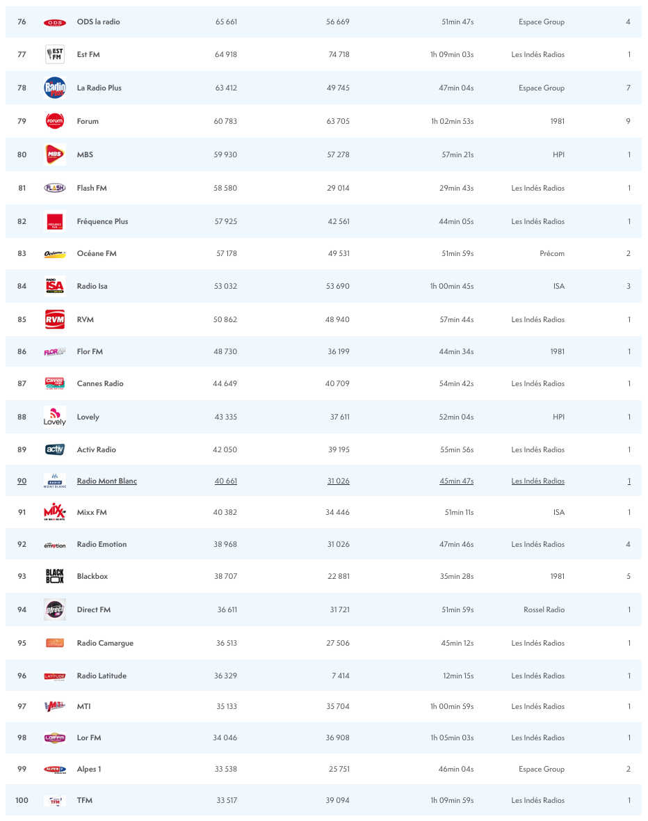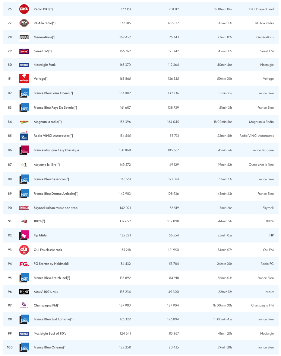 Notons aussi les performances d'Alouette (39e) ou encore de France Bleu Nord (44e), la station locale de France Bleu la plus écoutée avec 351 361 écoutes actives.