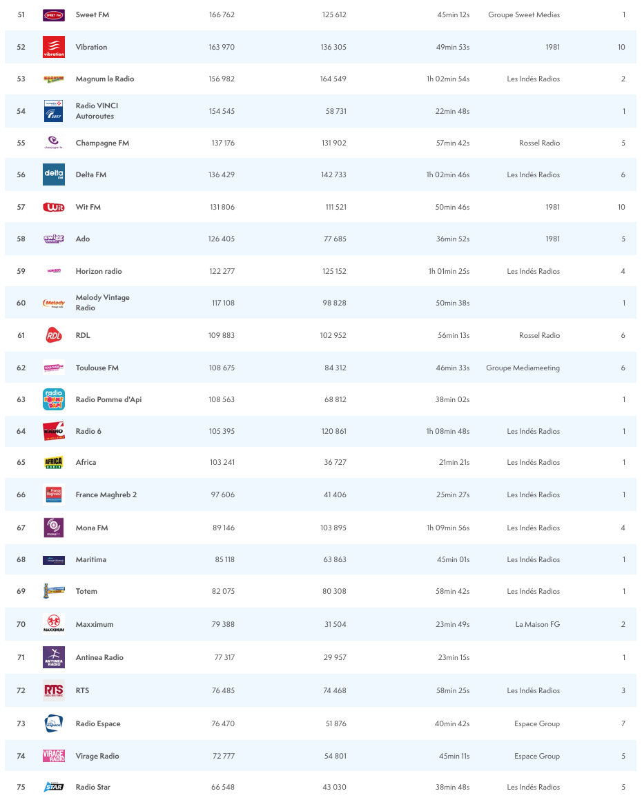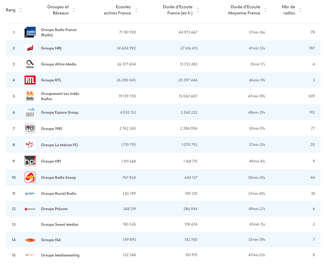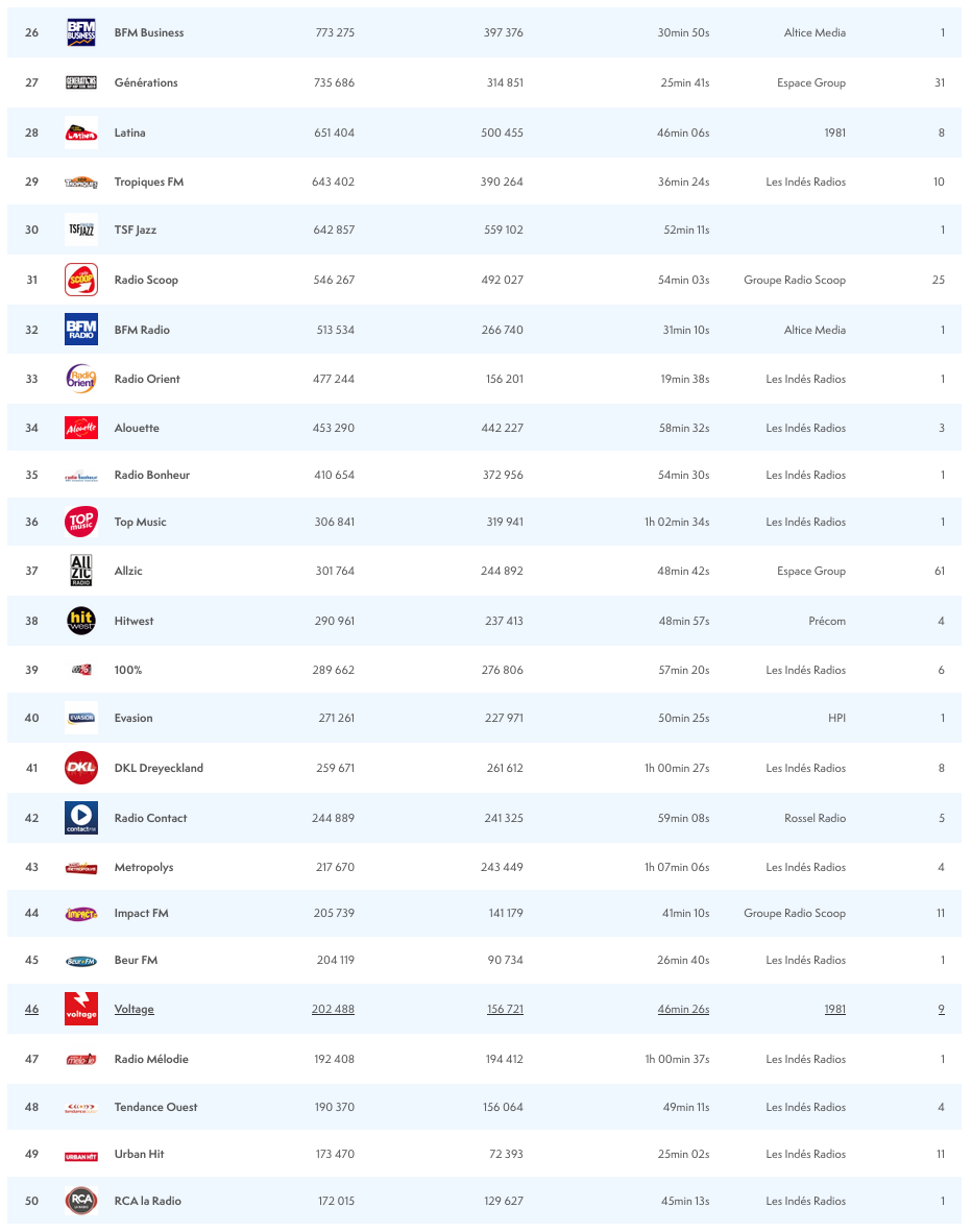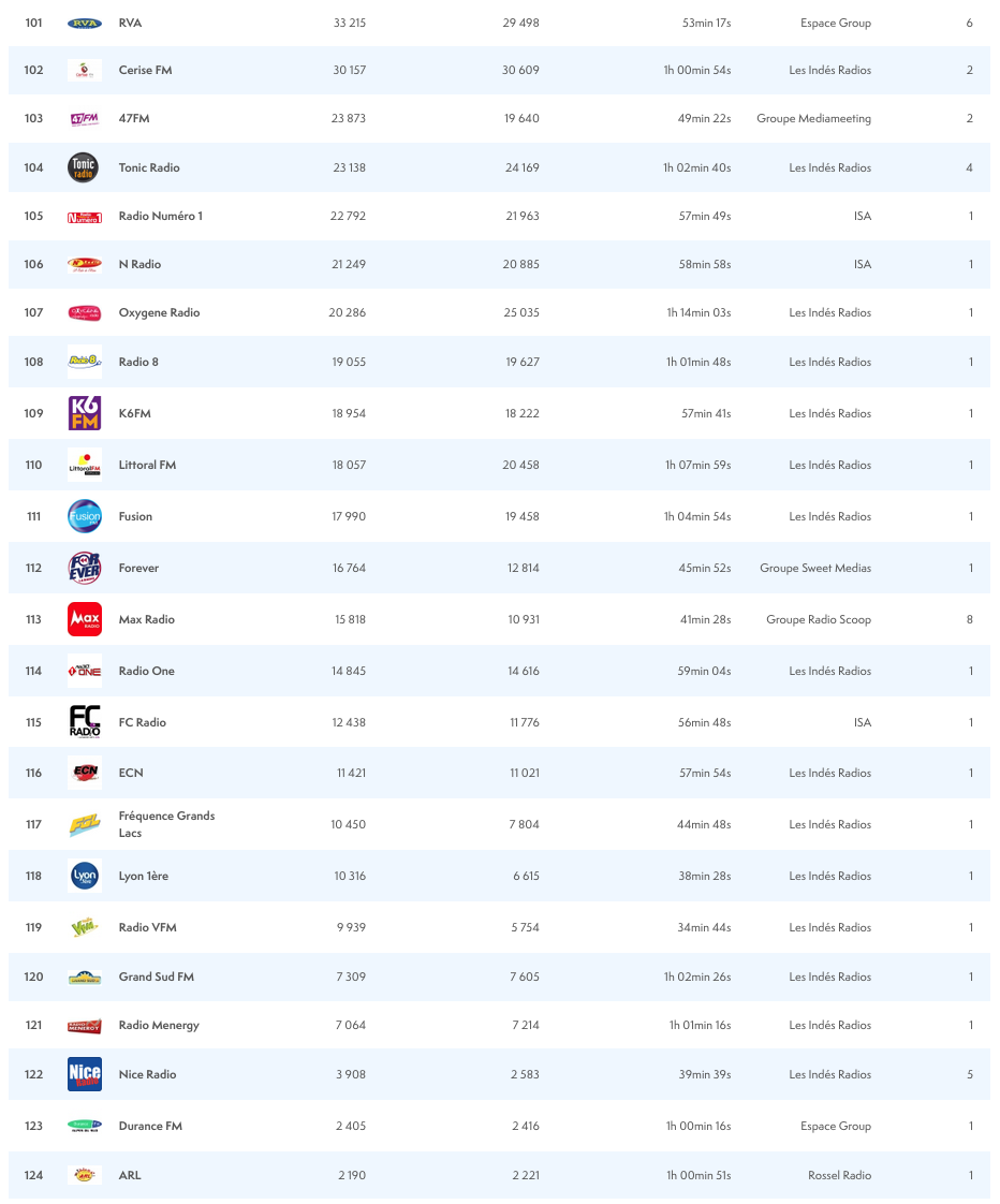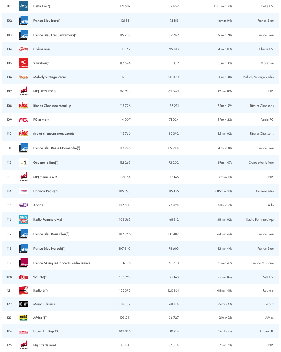 Notons aussi les performances d'Alouette (39e) ou encore de France Bleu Nord (44e), la station locale de France Bleu la plus écoutée avec 351 361 écoutes actives.