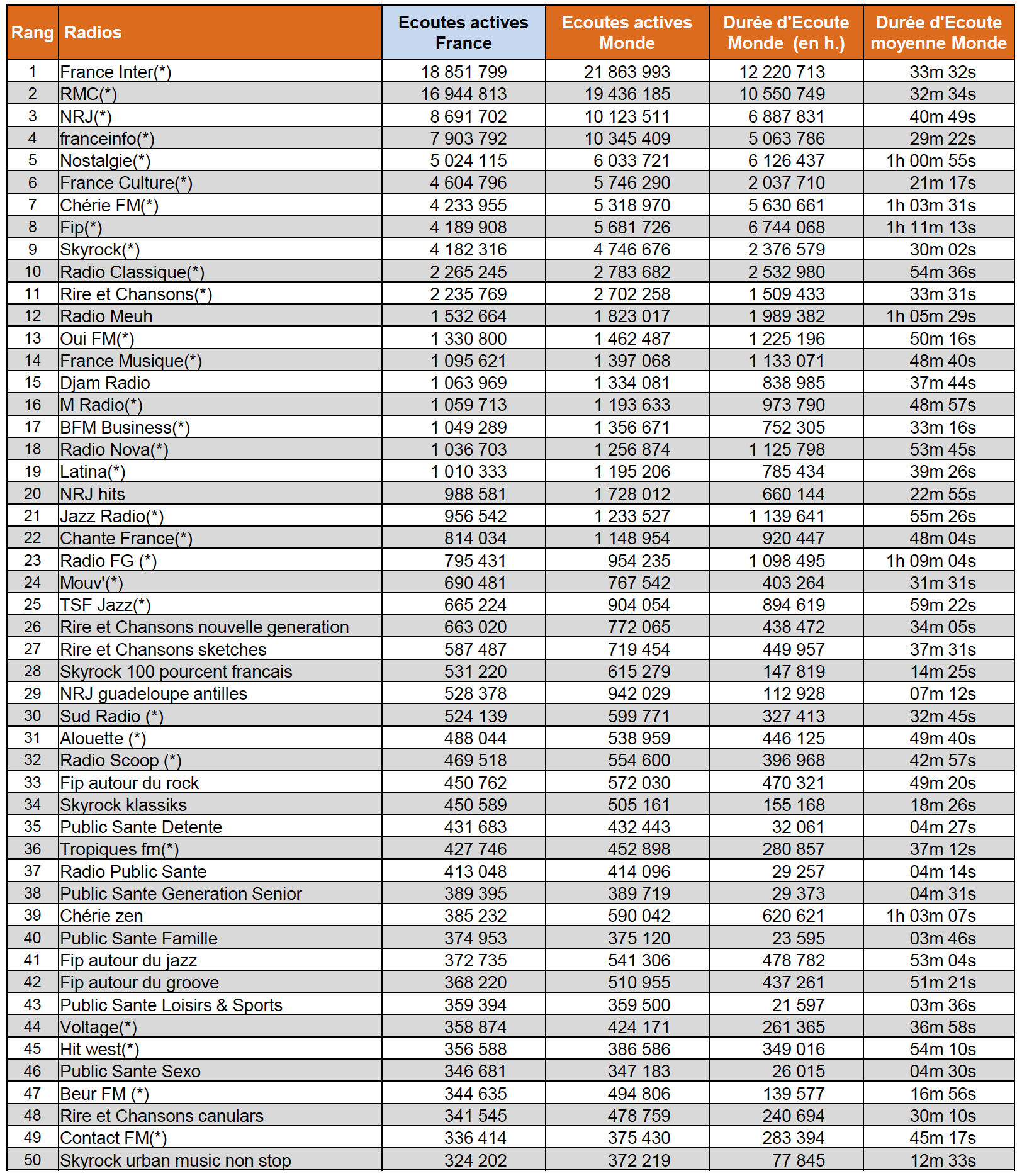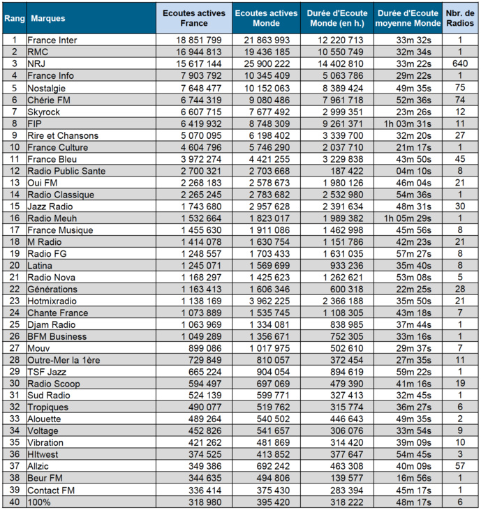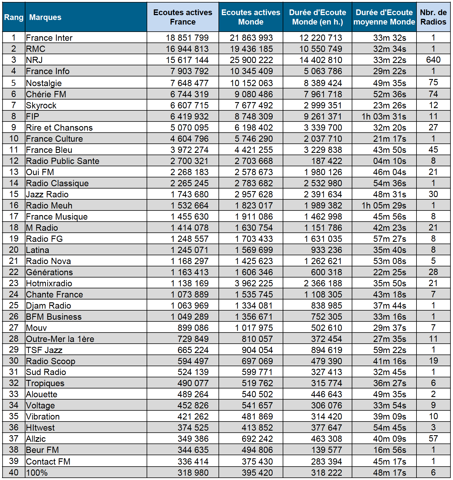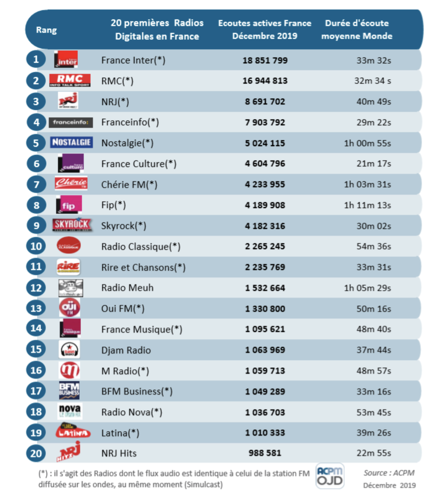 En décembre, Nostalgie parvient à entrer dans le Top 5 des radios le plus écoutées en prenant la place de FIP qui descend à la 8e place. Hormis, ce petit bouleversement, pas de changement à la tête du classement : France Inter, RMC, NRJ et franceinfo tiennent solidement leurs places. Dans le Top 20, on note aussi les disparitions de Jazz Radio et de Radio Public Santé au profit notamment du flux NRJ Hits ou encore de Djam Radio, ces deux dernières étaient absentes du Top 20 de novembre 2019.