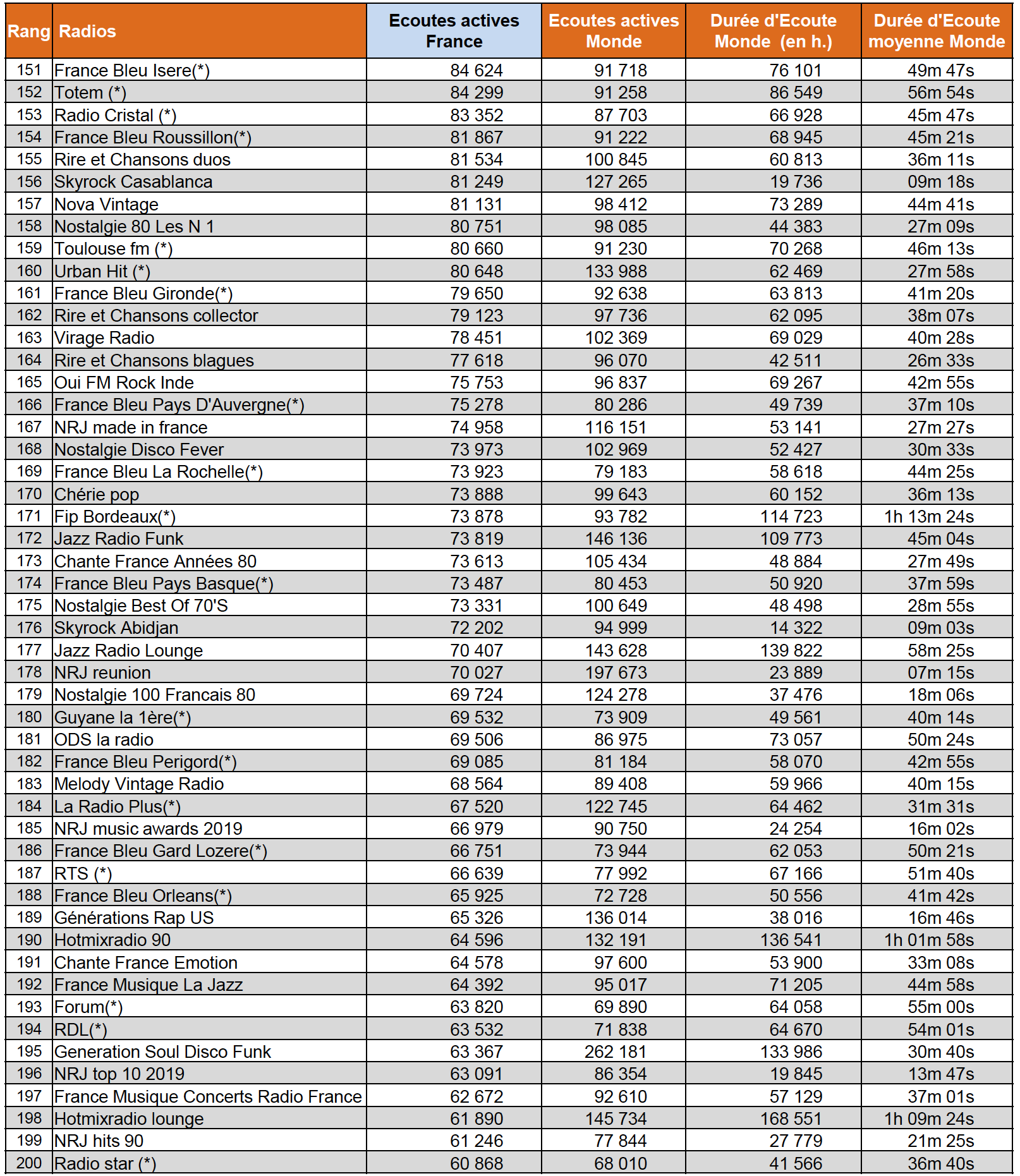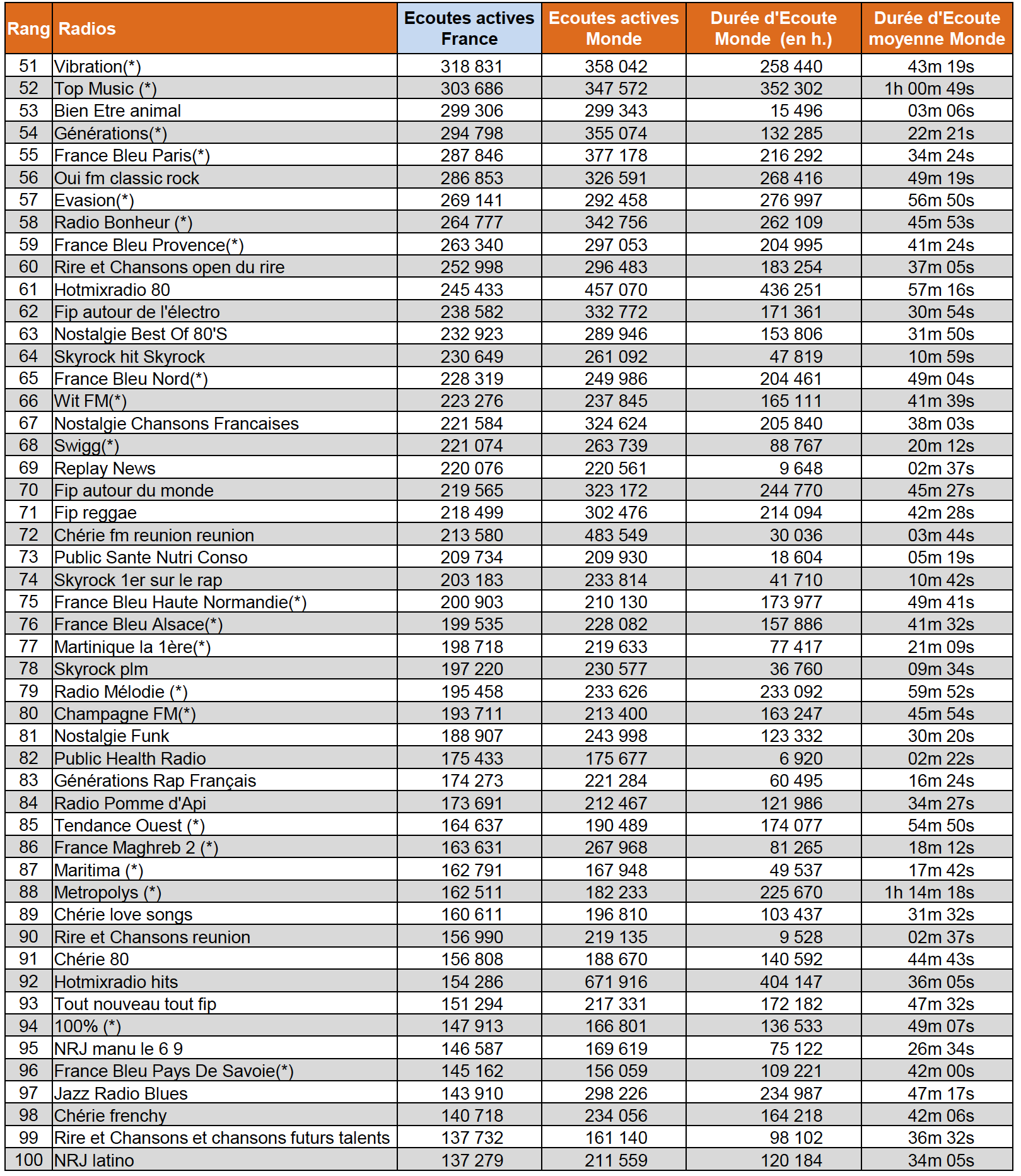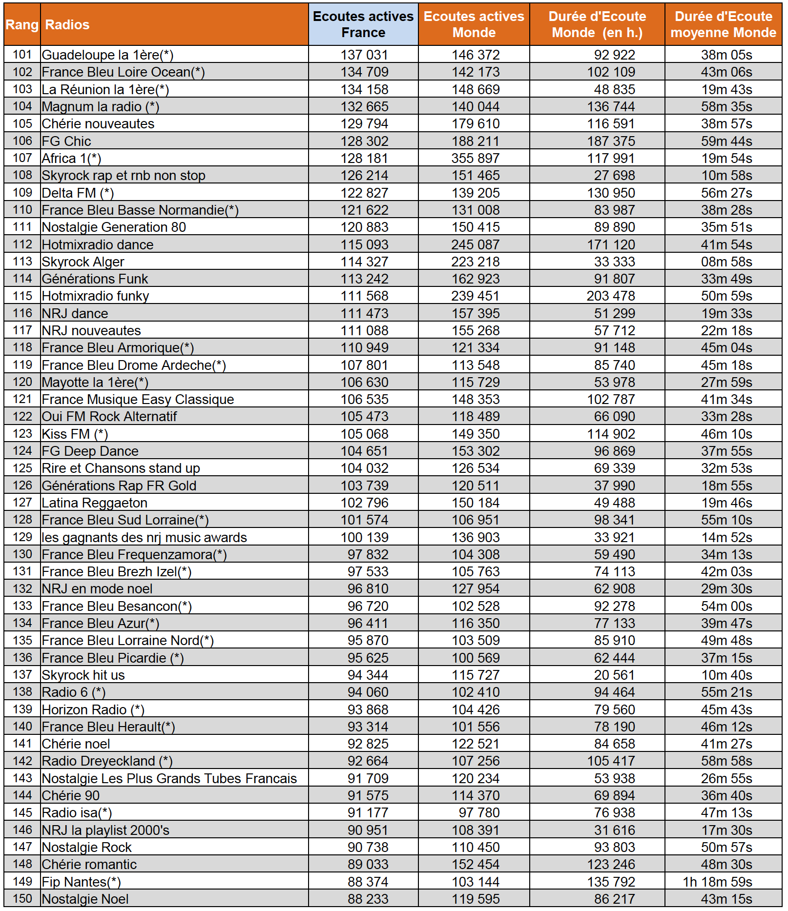 En décembre, Nostalgie parvient à entrer dans le Top 5 des radios le plus écoutées en prenant la place de FIP qui descend à la 8e place. Hormis, ce petit bouleversement, pas de changement à la tête du classement : France Inter, RMC, NRJ et franceinfo tiennent solidement leurs places. Dans le Top 20, on note aussi les disparitions de Jazz Radio et de Radio Public Santé au profit notamment du flux NRJ Hits ou encore de Djam Radio, ces deux dernières étaient absentes du Top 20 de novembre 2019.