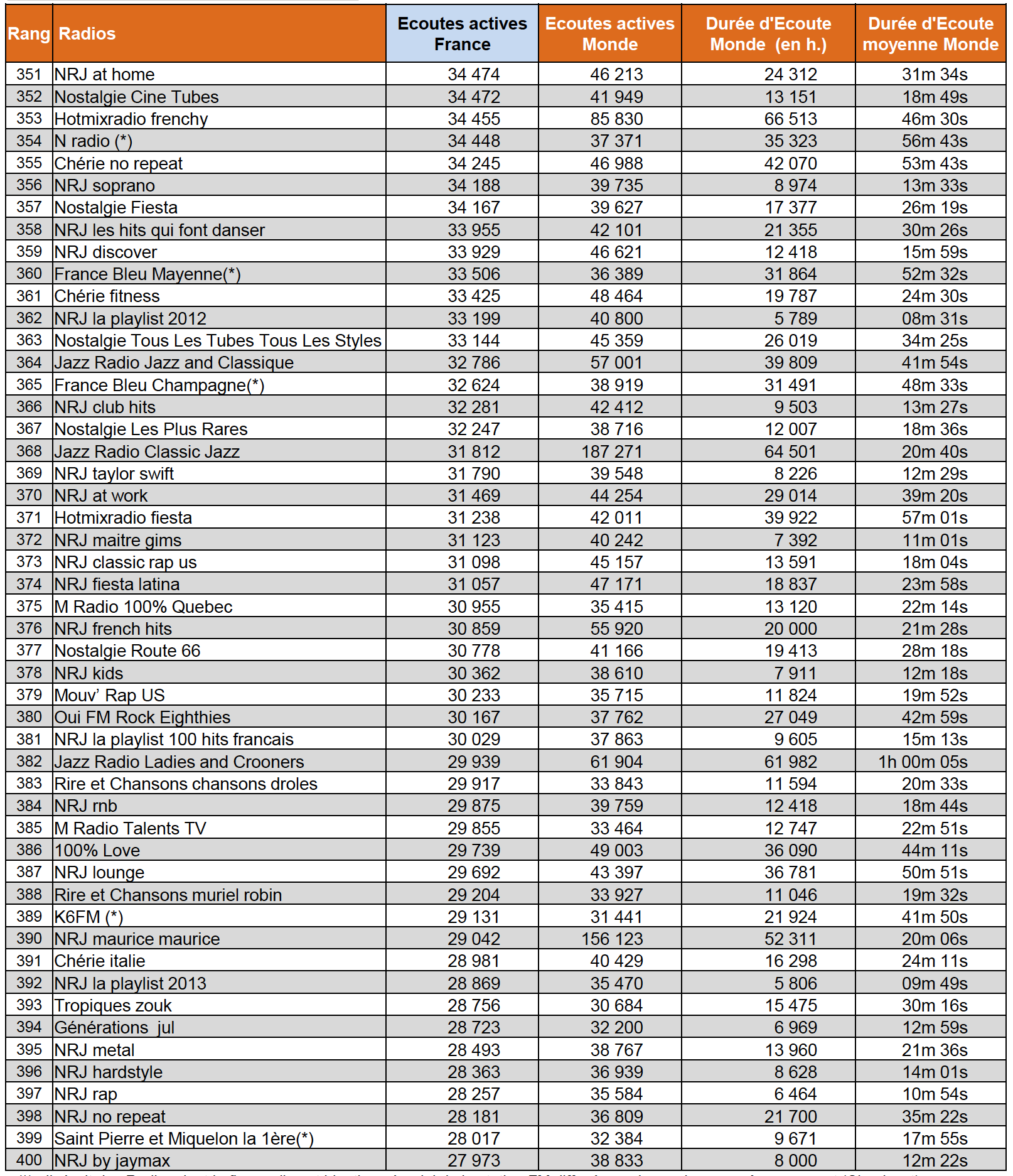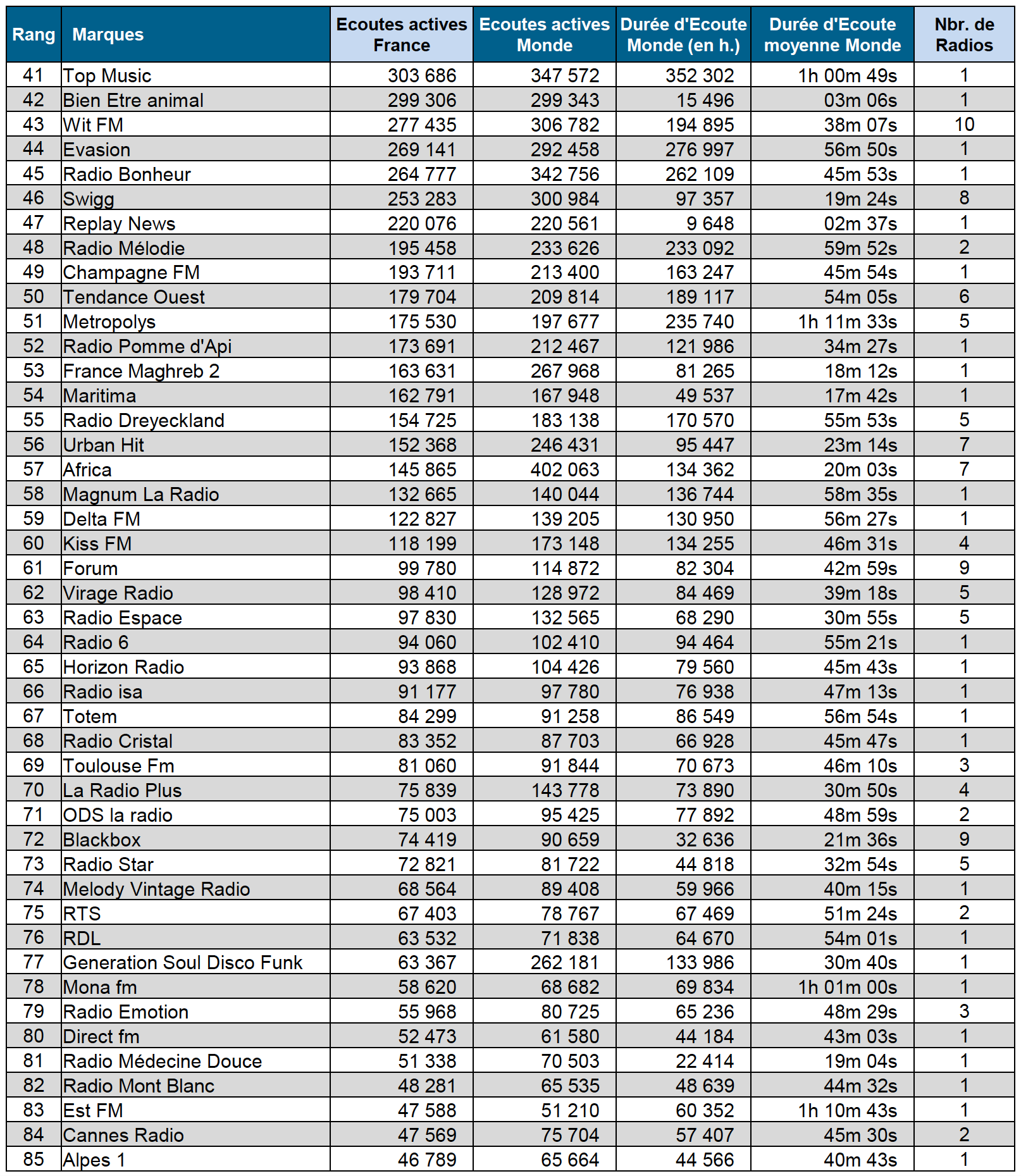Mastodonte de ce classement de décembre, Radio France avec plus de 44 millions d'écoutes actives depuis la France avec seulement 74 flux différents. Notons qu'avec seulement 2 flux différents, le groupe NextRadioTV moissonne 17 994 102 écoutes actives.