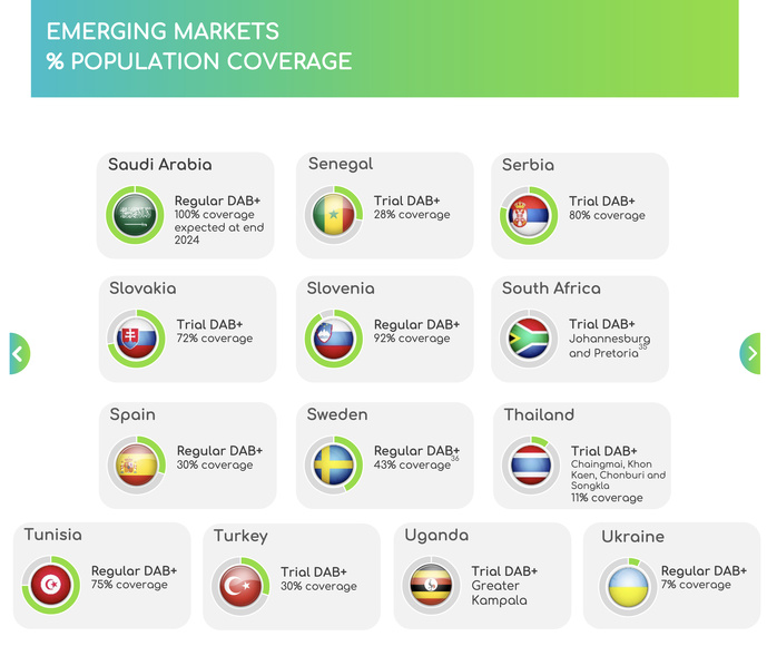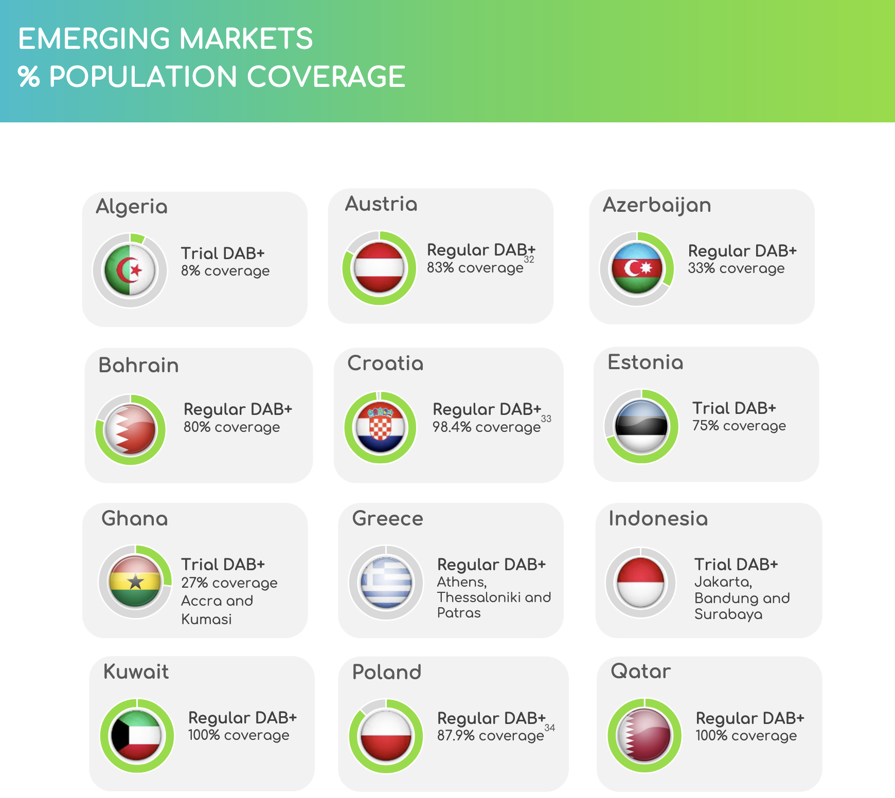 Le DAB+ est pleinement opérationnel au Koweït et au Qatar (100% de couverture), tandis qu’il atteint 98.4% en Croatie et 87.9% en Pologne. Des tests sont en cours en Algérie (8%), au Ghana (27%) et en Indonésie.