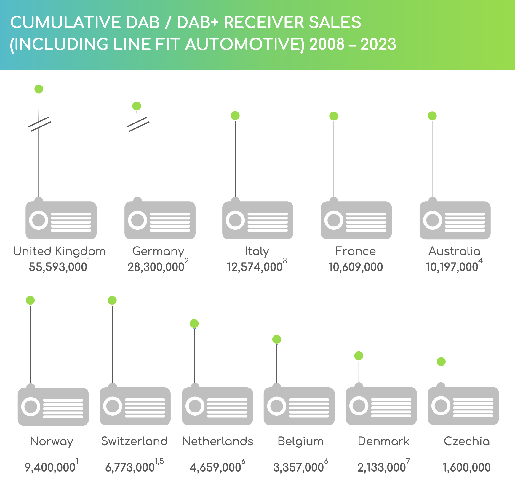 Les ventes de récepteurs DAB+ atteignent près de 55.6 millions au Royaume-Uni, 28.3 millions en Allemagne et dépassent les 10 millions en France et en Australie, confirmant une adoption croissante de la radio numérique.