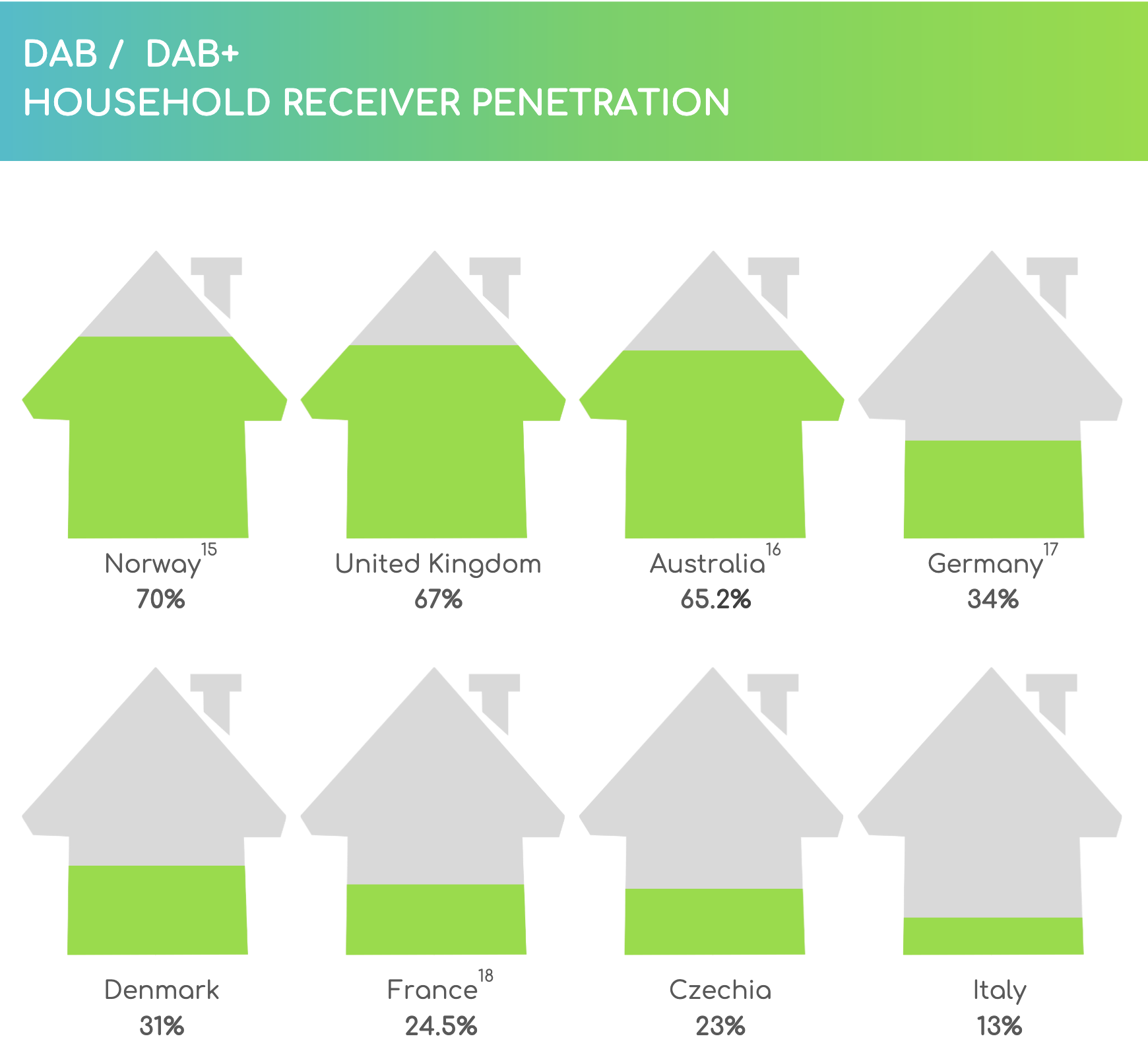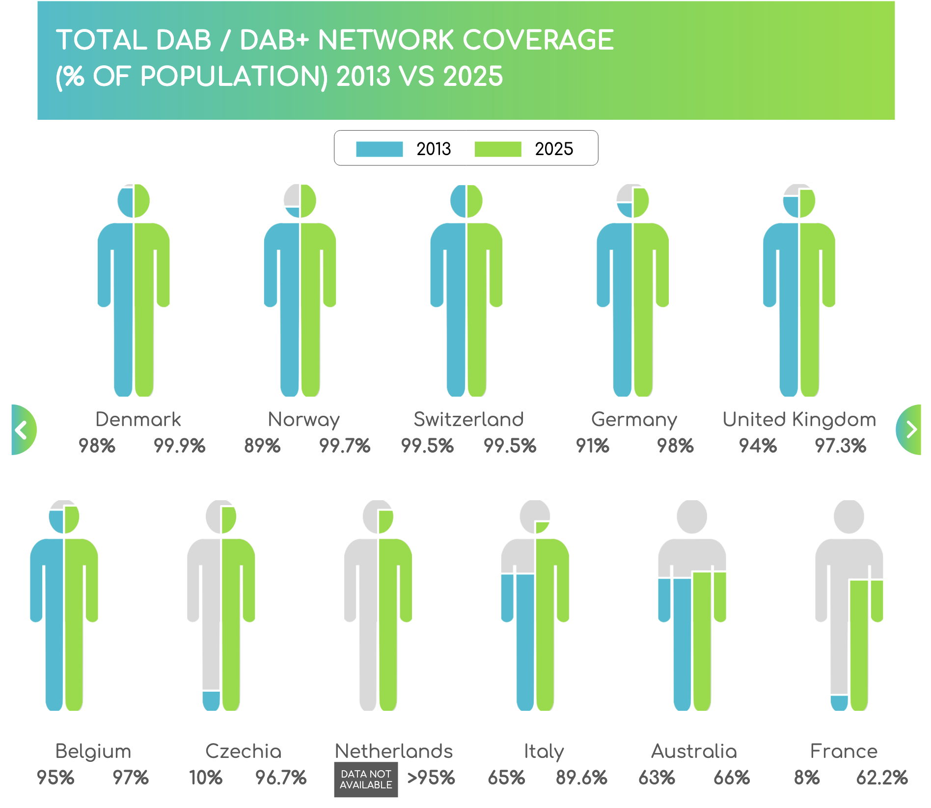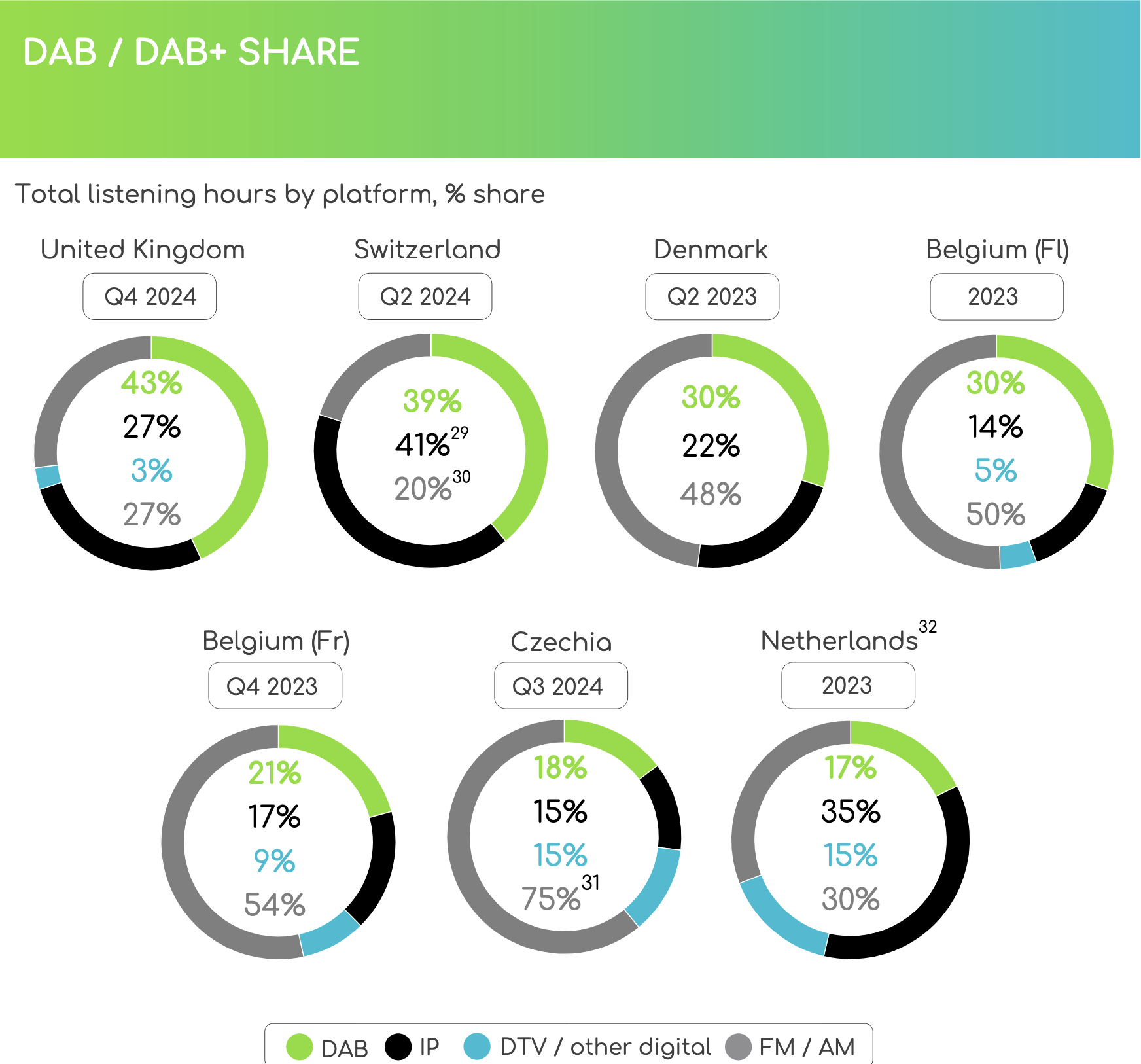 Le DAB+ représente 43% de l’écoute radio au Royaume-Uni, 39% en Suisse et 30% au Danemark et en Belgique (Flandre). En France (Wallonie), il atteint 21%, tandis qu’aux Pays-Bas, il représente 17% de l’audience.