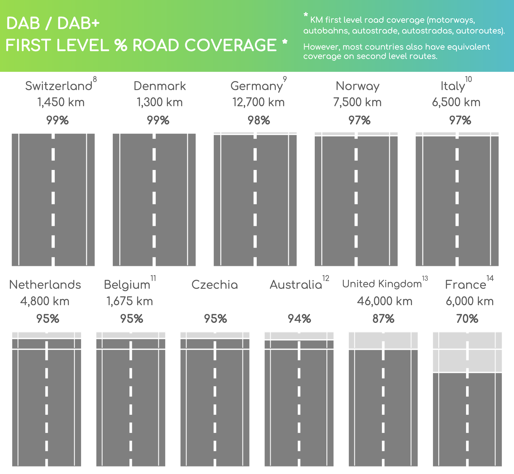 En 2025, la couverture DAB+ sur les autoroutes et routes principales atteint 99% en Suisse et au Danemark, et 98% en Allemagne. En France, elle s’étend sur 6 000 km, avec un taux de couverture de 70%.