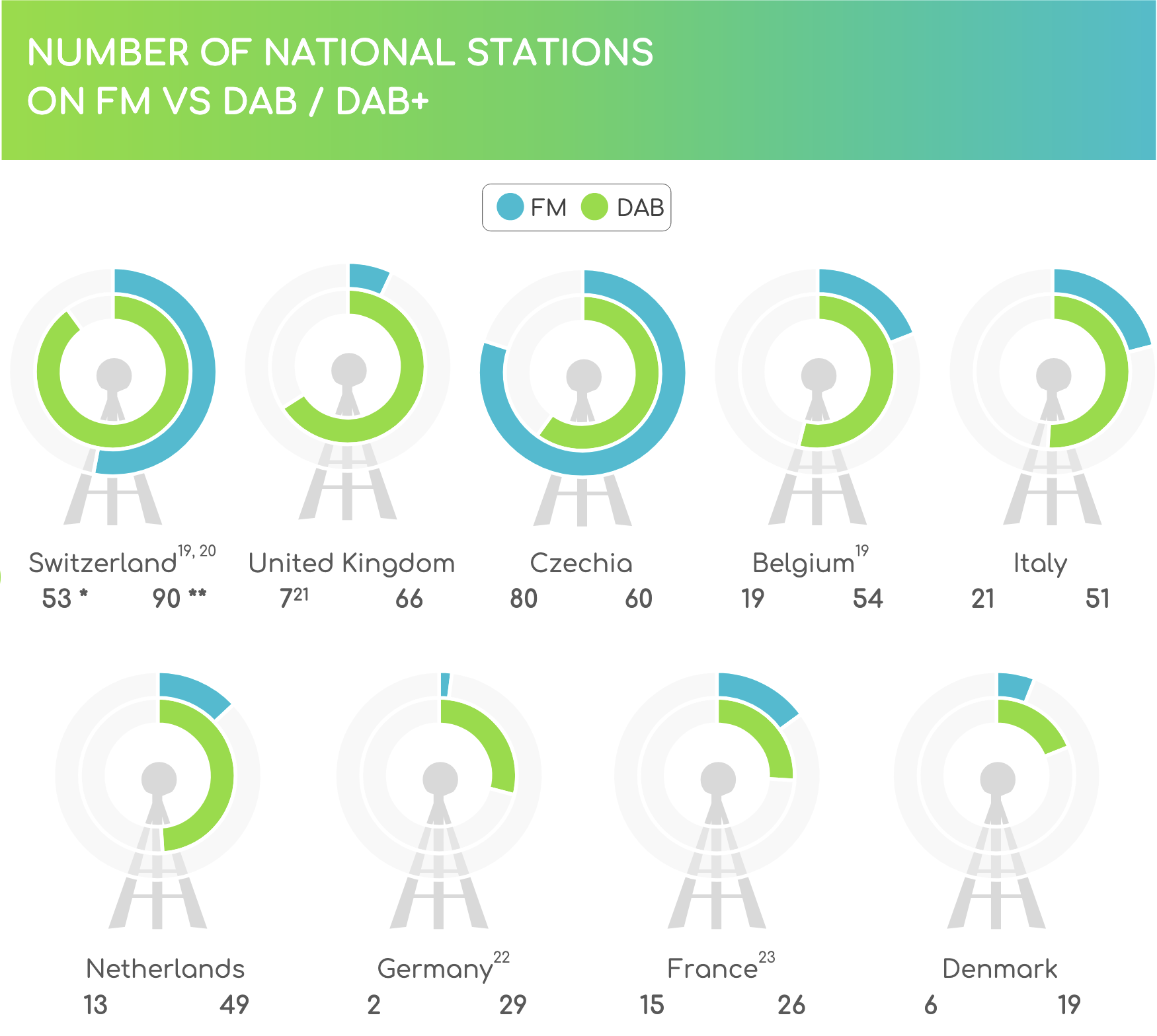 Le DAB+ offre un choix plus large que la FM, avec 90 stations nationales en Suisse, 66 au Royaume-Uni et 60 en Tchéquie, contre respectivement 53, 7 et 80 stations FM. En France, 26 stations sont disponibles en DAB+ contre 15 en FM.