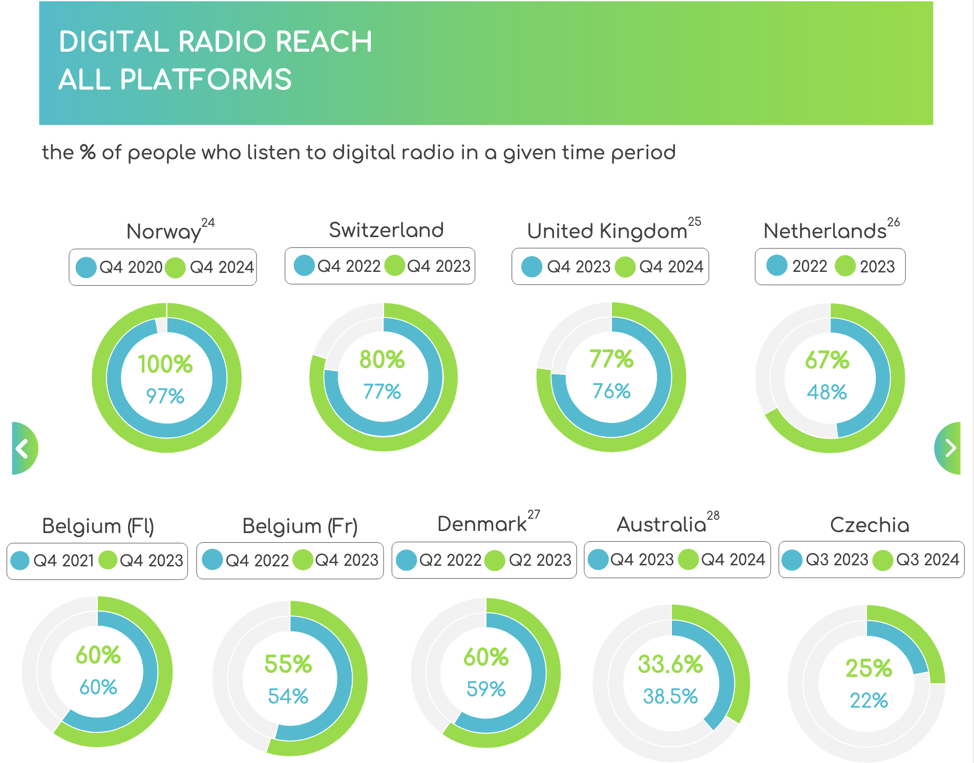 En Norvège, 100% des auditeurs écoutent la radio numérique, contre 80% en Suisse et 77% au Royaume-Uni. En Belgique, la portée atteint 60% en Flandre et 55% en Wallonie, tandis qu’en Australie, elle passe de 33.6% à 38.5% entre 2023 et 2024.