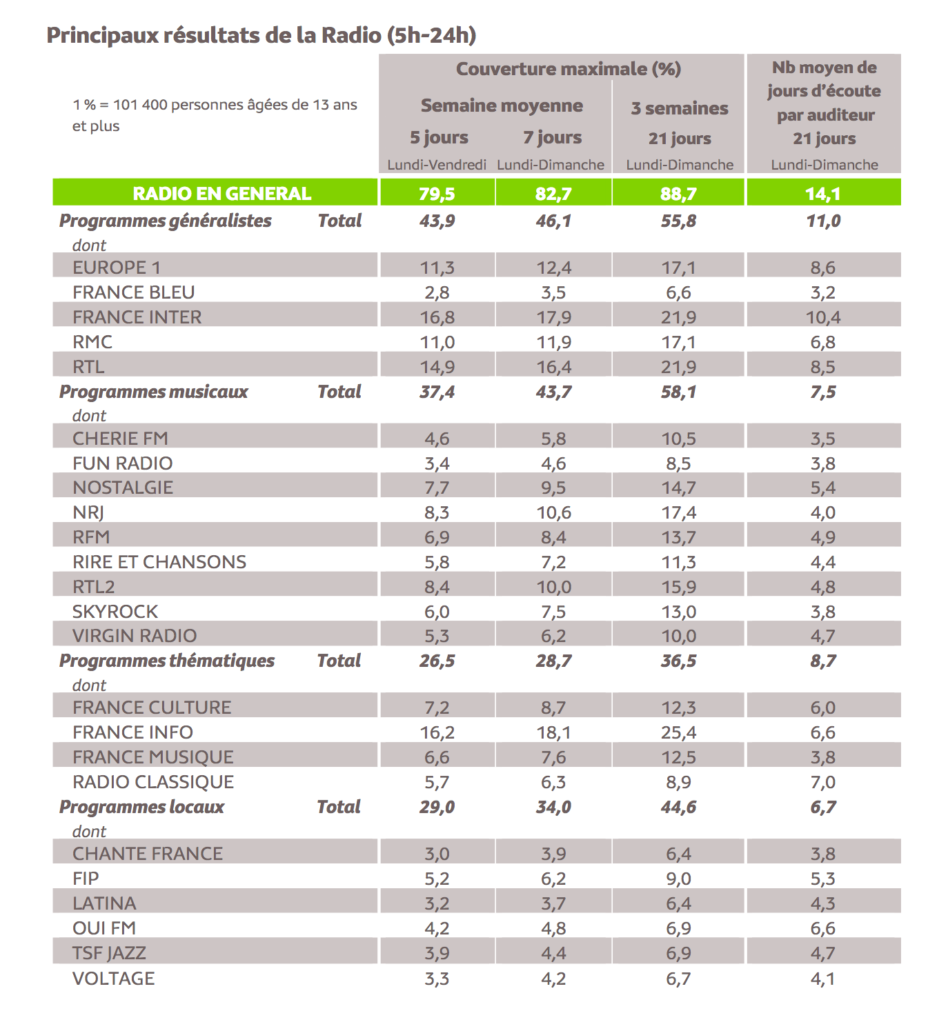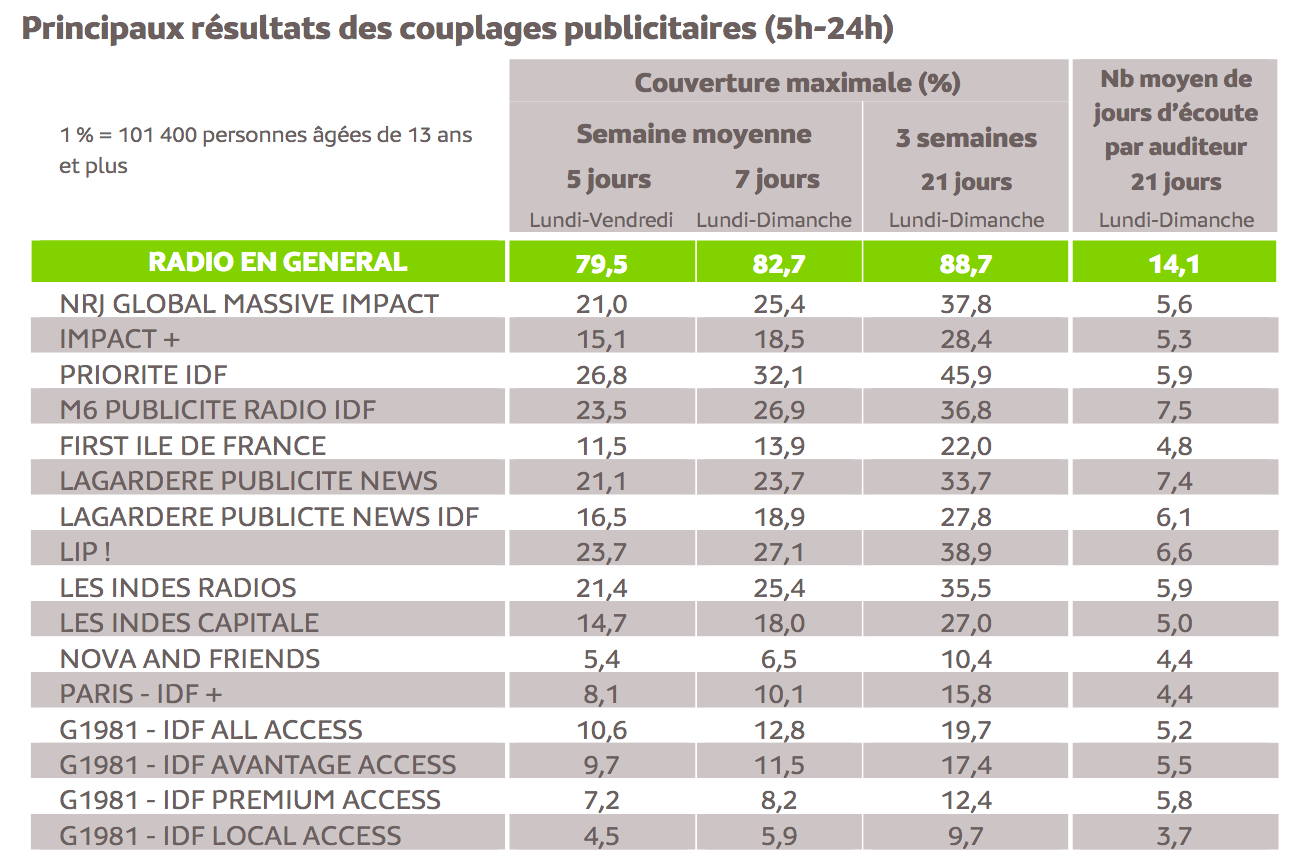 Dans cette étude, seuls sont mentionnés les stations, réseaux et couplages souscripteurs à l’enquête et atteignant au moins 5 % de couverture maximale sur la période des 21 jours.