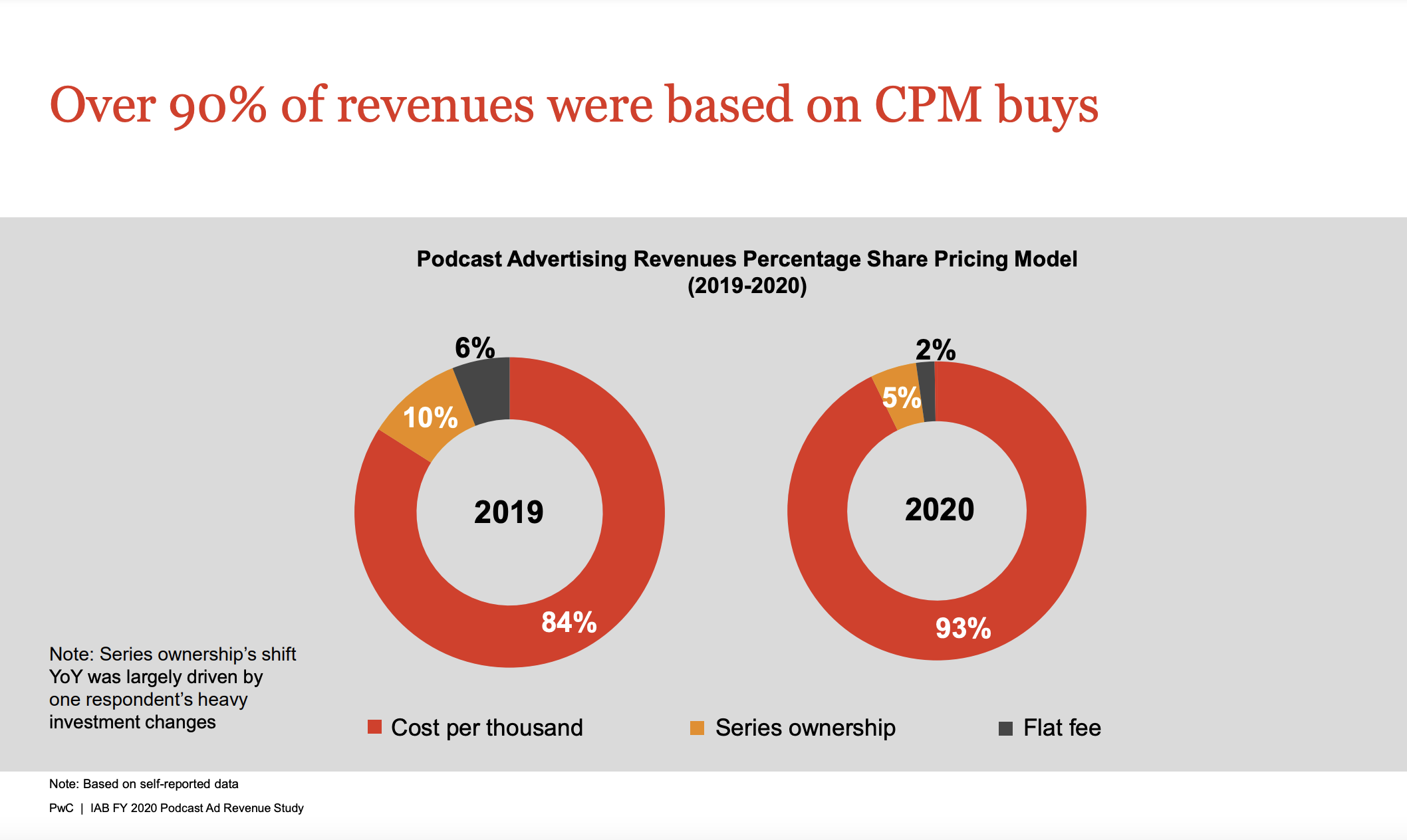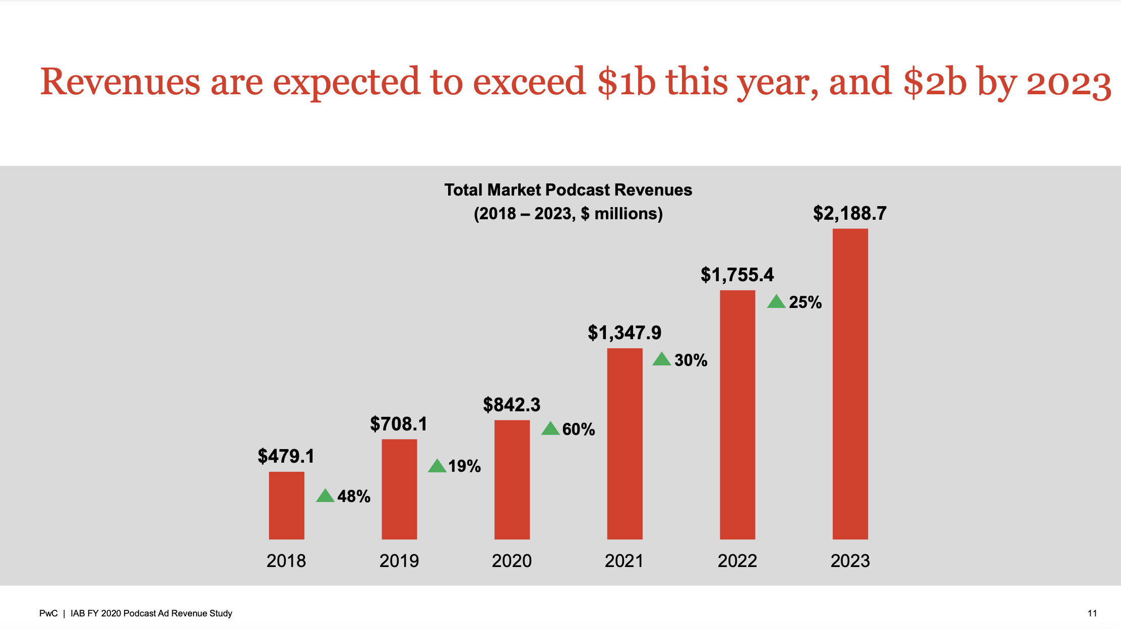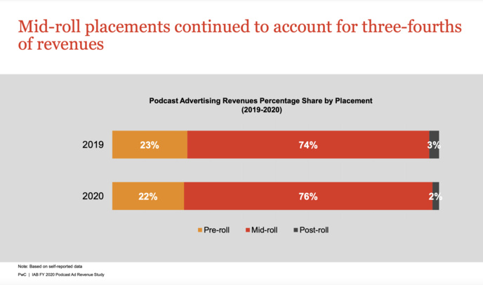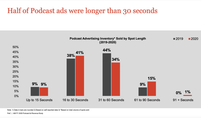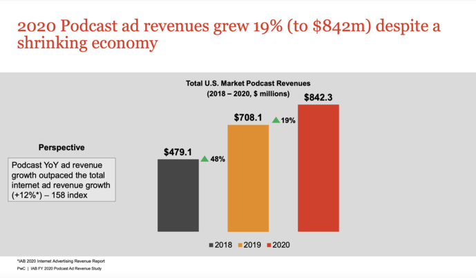 Portés par un quatrième trimestre particulièrement solide (+ 37% sur un an), les revenus publicitaires des podcasts ont grimpé à 842 millions de dollars en 2020, contre 708 millions de dollars l'année précédente. L'utilisation d'annonces insérées dynamiquement, qui permet le placement d'annonces au point de téléchargement de l'auditeur, a augmenté la part des revenus de 48% à 67%. Les publicités lues par l'annonceur, qui donnent également plus de contrôle à l'acheteur, ont augmenté la part de 27% à 35%. La moitié des publicités de podcast duraient plus de 30 secondes.