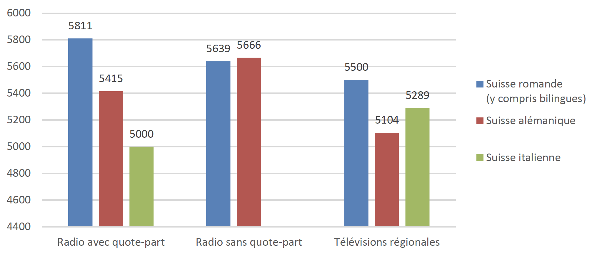 À 5 811 francs (5 114.13 euros) le salaire des professionnels des programmes des radios locales de Suisse romande bénéficiant d'une quote-part est le plus élevé. Celui de leurs homologues des radios locales sans quote-part de redevance de Suisse alémanique et de Suisse romande est comparable (respectivement de 5 666 et 5 639 francs). Dans les télévisions régionales de Suisse romande, il est légèrement inférieur (5 500 francs). Enfin, c'est chez les diffuseurs de Suisse italienne et dans les télévisions régionales de Suisse alémanique que le salaire des professionnels des programmes est le plus bas.