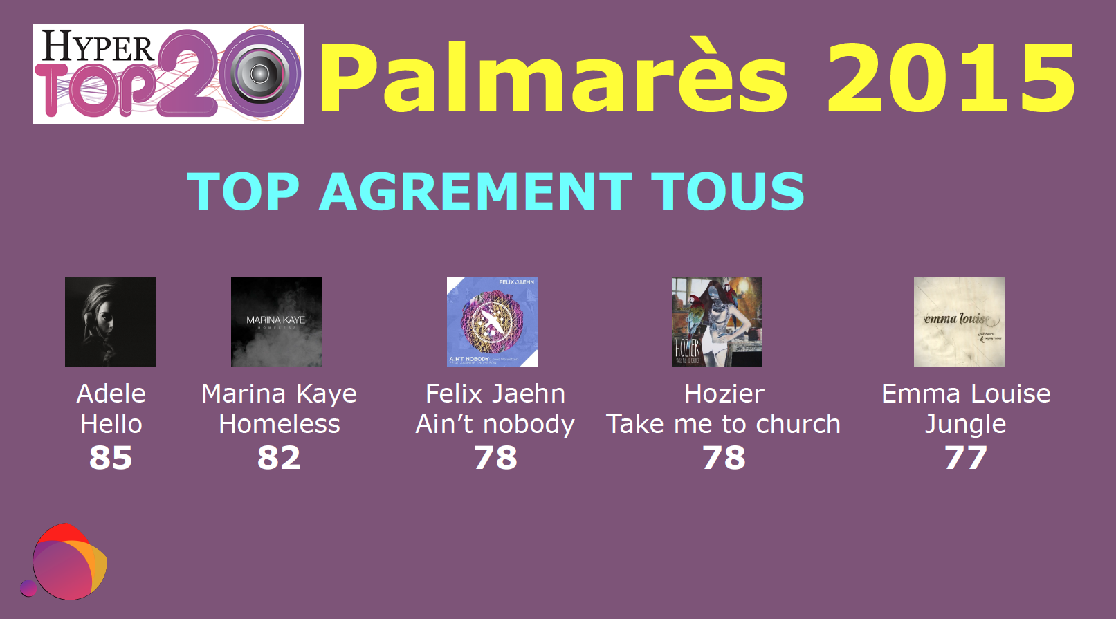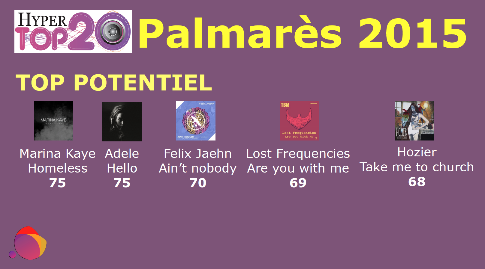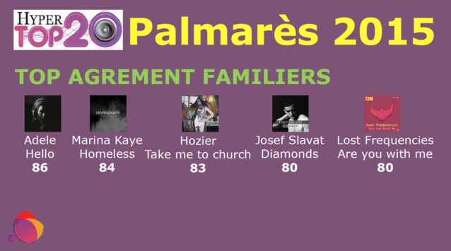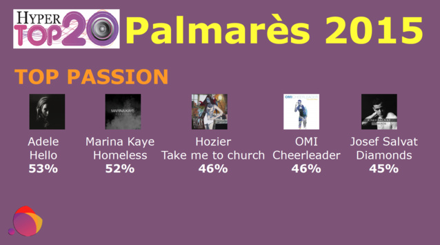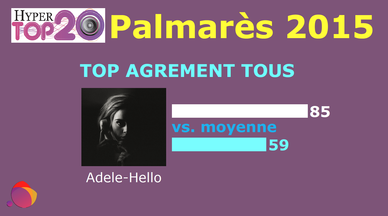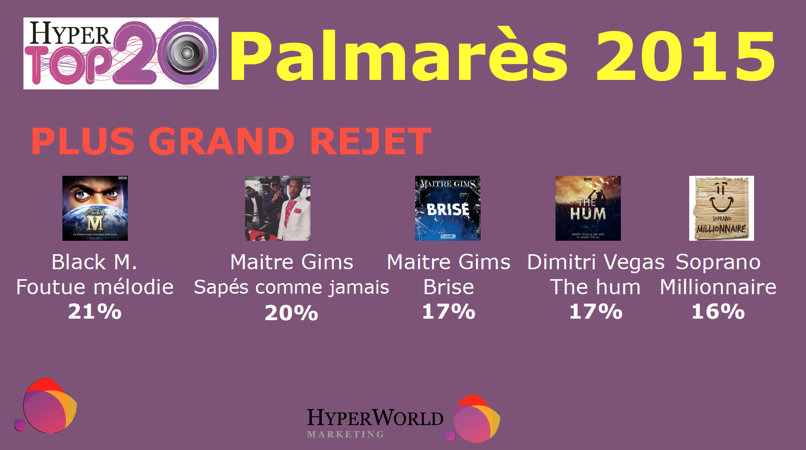 Le titre phénomène de l’année est sans conteste "Hello", le titre phare d’Adèle, sorti en novembre, et qui occupe la première place sur le critère de la passion : 53% des sondés aiment beaucoup ce titre, en moyenne sur les 3 dernières vagues de l’année où celui-ci a été testé. Du reste le titre bat des records de familiarité avec 97% des sondés qui l’ont déjà entendu au moins une fois, et 72% qui pensent connaître le titre ou l’artiste (la première place étant occupée par un titre francophone, Jour 1 de Louane, reconnu par 3 auditeurs sur 4). Sans grande surprise, parmi les 133 titres testés en 2015, les plus …détestés auront été des titres segmentants comme "Foutue mélodie", de Black M, ou "Sapés comme" jamais de Maitre Gims, rejetés par plus d’un auditeur sur 5.
