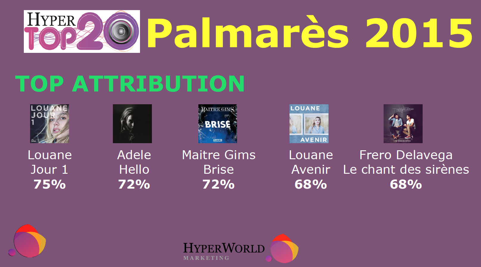 Rappelons que l’HyperTop20 est une étude bimensuelle réalisée par Hyperworld Marketing auprès de 250 personnes de 15 à 49 ans, résidant en France métropolitaine, auditeurs réguliers de stations musicales. C’est une enquête en ligne mesurant la familiarité, l’attribution, l’agrément et l’usure de chaque titre sur la base d'extraits sonores écoutés à l’aveugle. Les 20 titres étudiés sont à chaque fois ceux ayant cumulé le plus de contacts en radio dans la semaine précédant l’enquête (source Yacast. Panel de 140 stations).