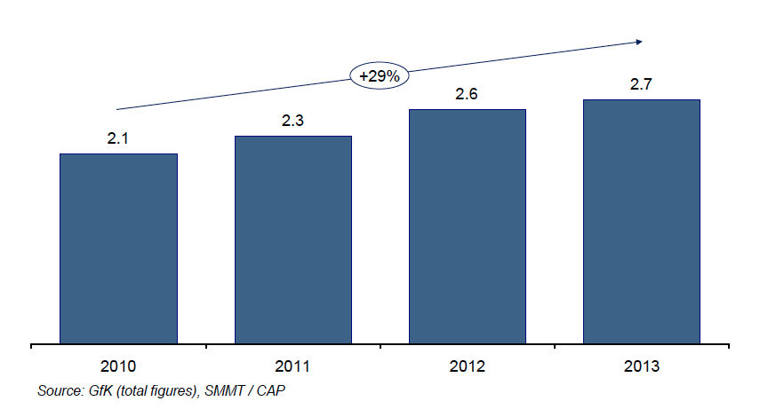 Contrairement donc à certaines idées reçues, le marché anglais est loin de stagner – dans les trois dernières années, les ventes de récepteurs ont augmenté de quasiment 30%, passant de 2,1 Millions d’unités en 2010 à 2,7 millions en 2013. Cette croissance est tirée par l’adoption en standard de démodulateurs numériques dans les autoradios des nouveaux véhicules1. Au Royaume-Uni, 55% des voitures neuves sont maintenant équipées d’un autoradio numérique en standar