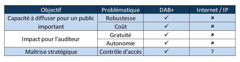 Sur tous ces marchés, les radiodiffuseurs se sont engagés dans un avenir multiplateforme – l’internet (l’IP) et le DAB/DAB+ sont considérés comme complémentaires. Une dépendance excessive à l’IP / LTE / 4G est considérée comme étant à haut risque et coûteuse, en particulier dans un environnement de plus en plus mobile.