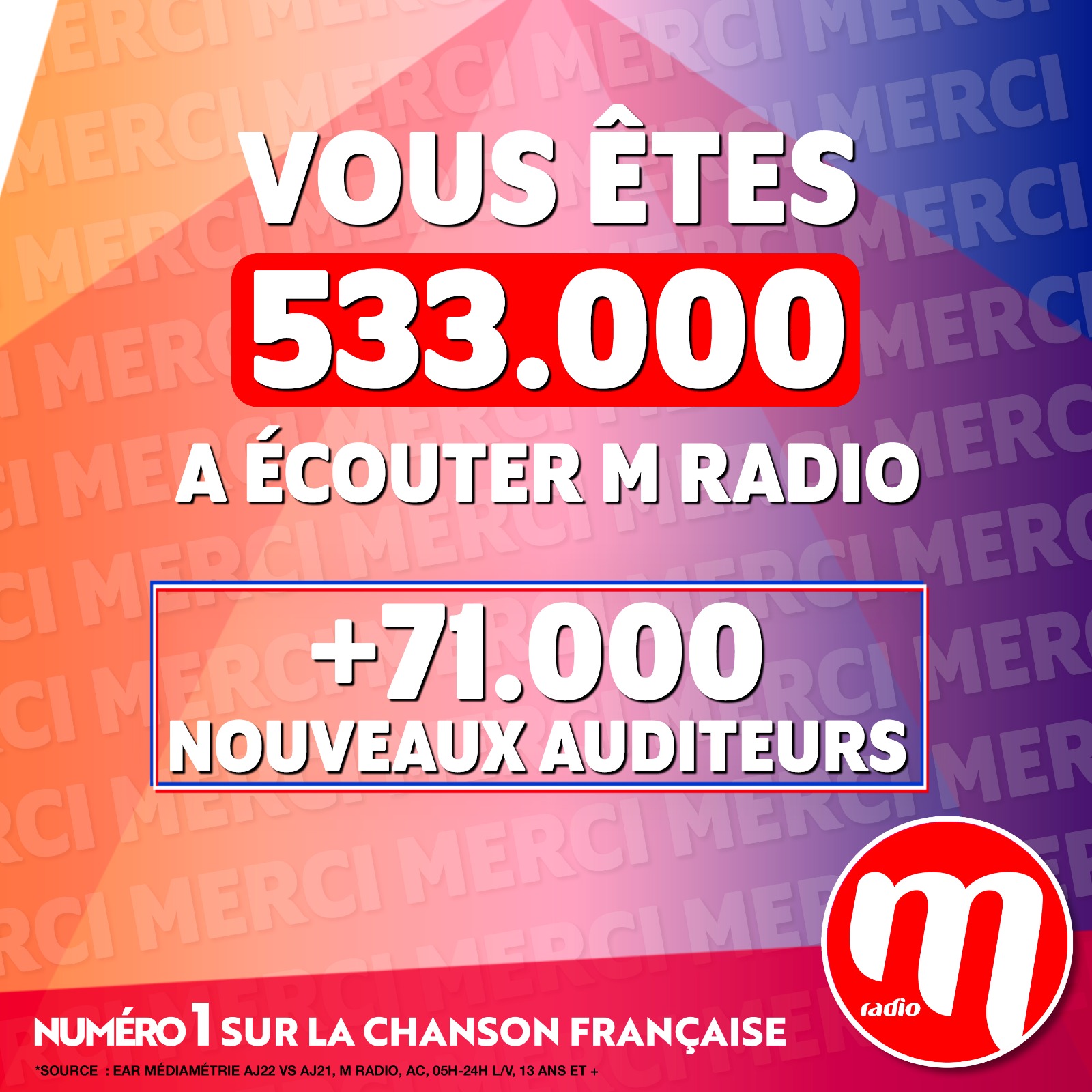 M Radio devient la radio la plus féminine de France avec 67.2% de femmes à l’écoute quotidiennement. L'équipe évoque "un succès pour toutes les émissions de M Radio. La matinale "Le M Radio Réveil" avec Vincent Cerutti de 6h à 10h progresse de 49 000 nouveaux auditeurs. Ombeline Brumain, entre 10h et 13h, fidélise 22 000 nouveaux auditeurs. "Le 16/20", avec Jérôme Zano entre 16h et 20h, réalise une forte hausse avec 74 000 nouvelles paires d’oreilles.
