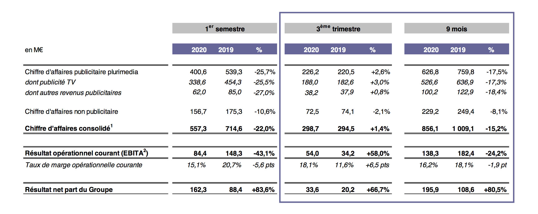 Au 3e trimestre 2020, le chiffre d’affaires consolidé du Groupe M6 s’établit à 298.7 M€, en hausse de +1.4%. En outre, le groupe a poursuivi, au 3e trimestre, ses efforts en matière de réduction des coûts, tant sur ses grilles de programmes que sur ses autres charges d’exploitation. L’EBITA consolidé atteint ainsi 54.0 M€, soit une progression significative de +19.8 M€ par rapport au 3e trimestre 2019. Sur les neuf premiers mois de l’année 2020, le Groupe M6 réalise un chiffre d’affaires de 856.1 M€, en baisse de -153.0 M€ (-15.2%), qui traduit l’impact très sévère des mesures de confinement sur l’ensemble de ses activités. À fin septembre 2020, l’EBITA consolidé se monte à 138.3 M€, en baisse de -44.1 M€ (-24.2%) sur un an.